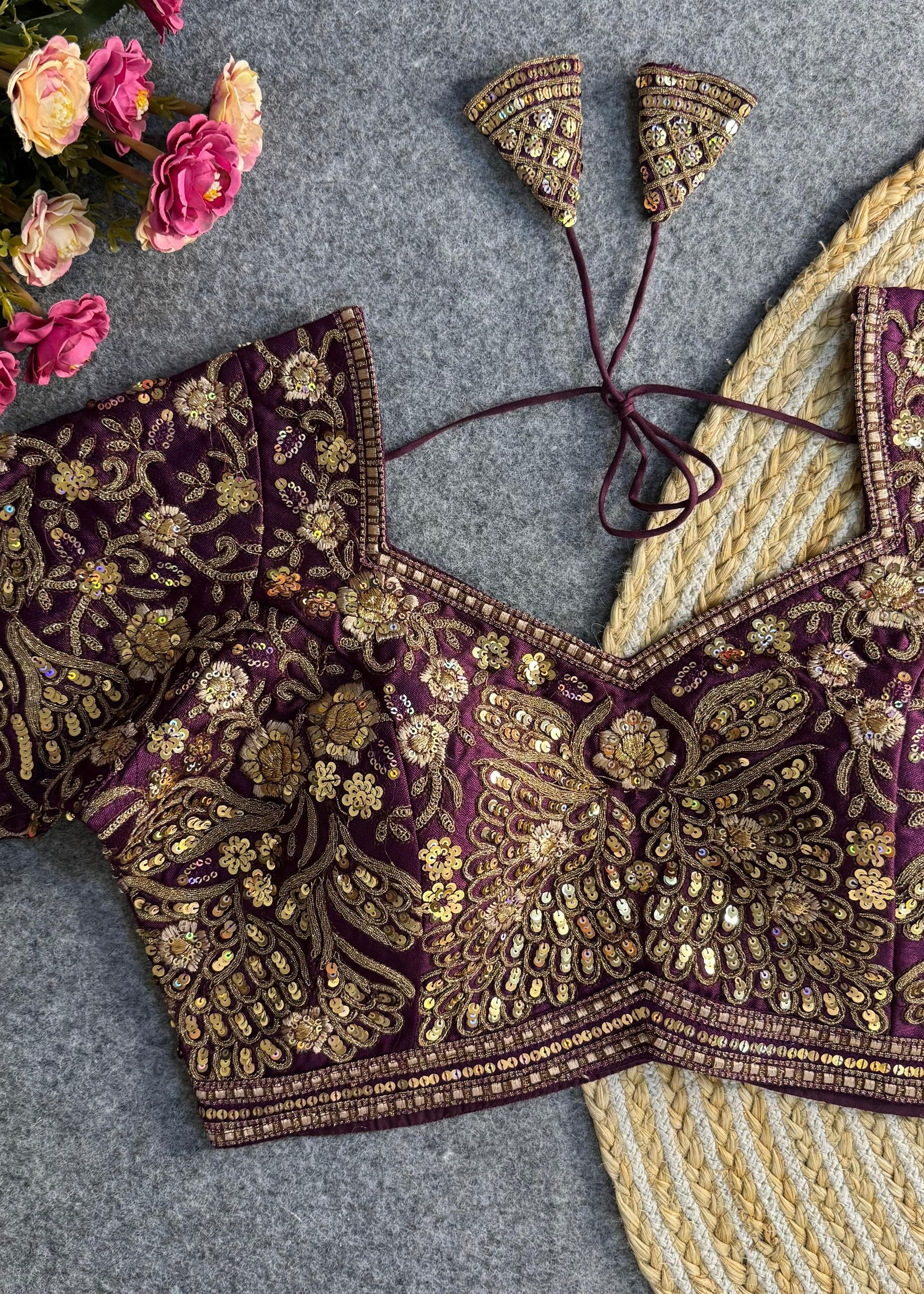 Unveil your inner royalty with the Wine Heavy Codding & Sequin Bridal Blouse from Aethnofit Fashions—a rich and regal design crafted for statement-making celebrations. Made with premium silk fabric, this blouse features intricate embroidery work, enhanced by ornate codding and shimmering sequins that create an opulent, textured finish.