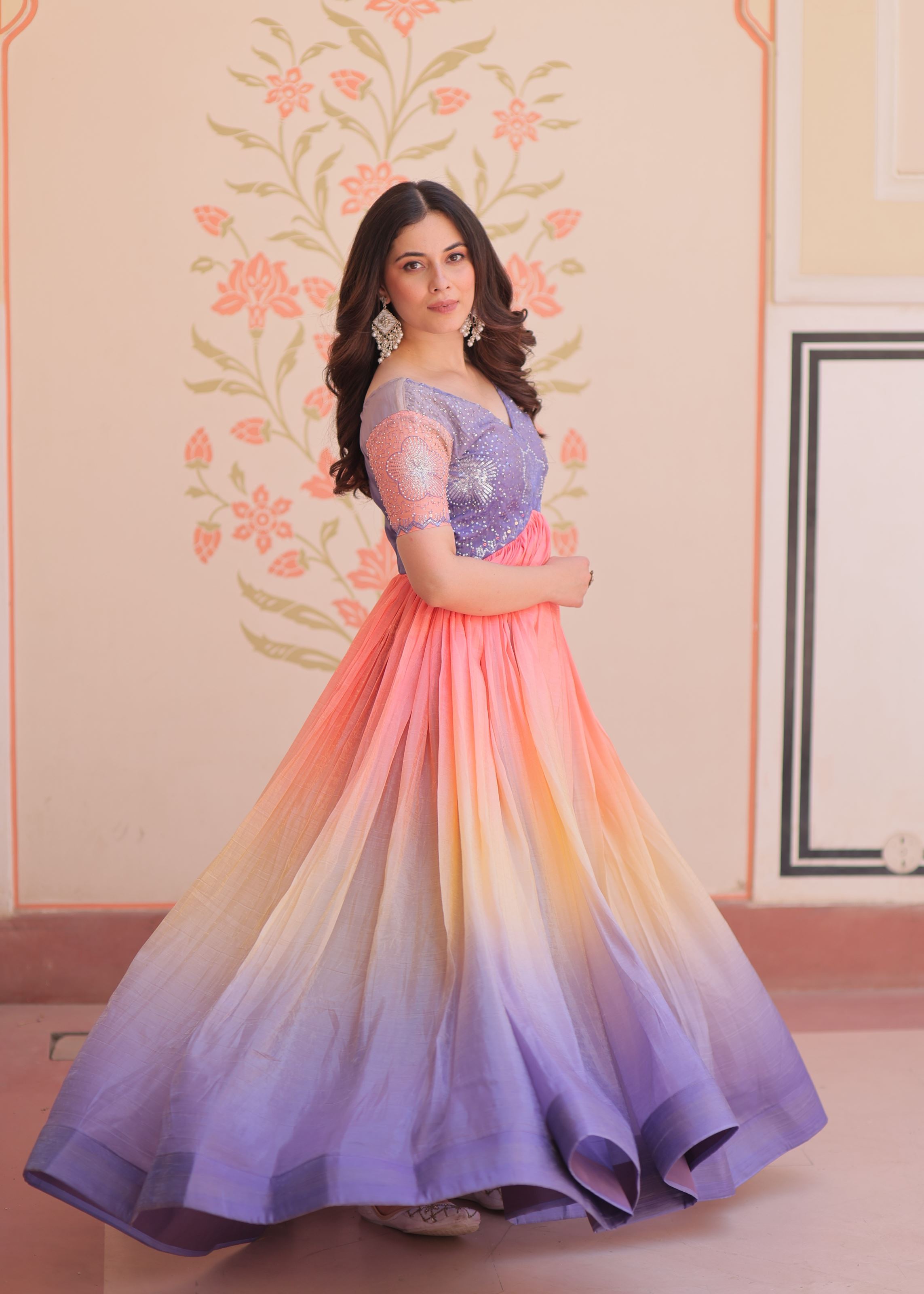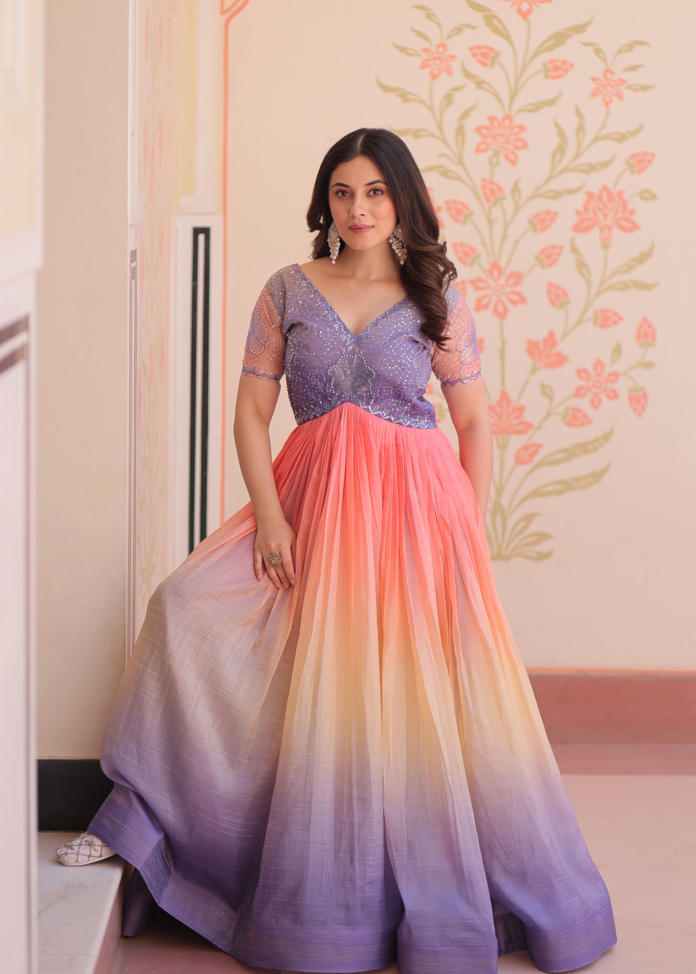 Elevate your ethnic fashion game with this ethereal Lavender Gold Crush Gown, a masterpiece that redefines festive glam. Crafted from luxurious gold crush fabric, the gown flows beautifully with a soft shimmer that catches light and attention alike. The 56-inch top length provides full coverage with an elongated, graceful silhouette—perfect for gala evenings, weddings, or premium festive occasions.