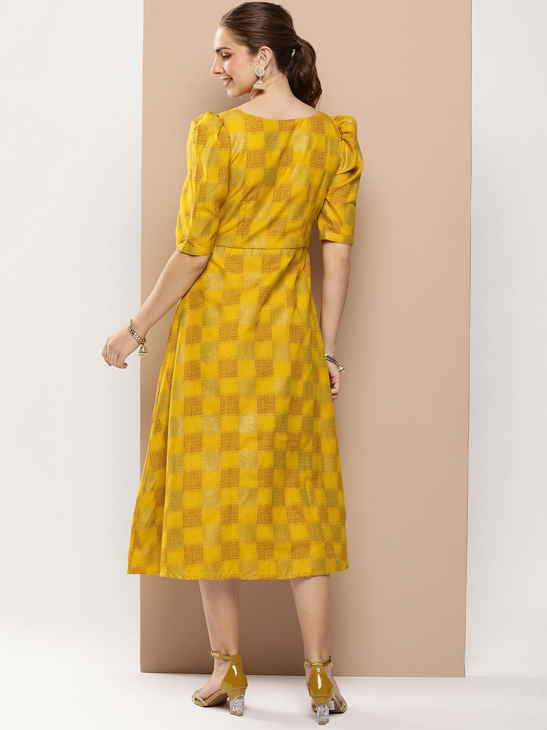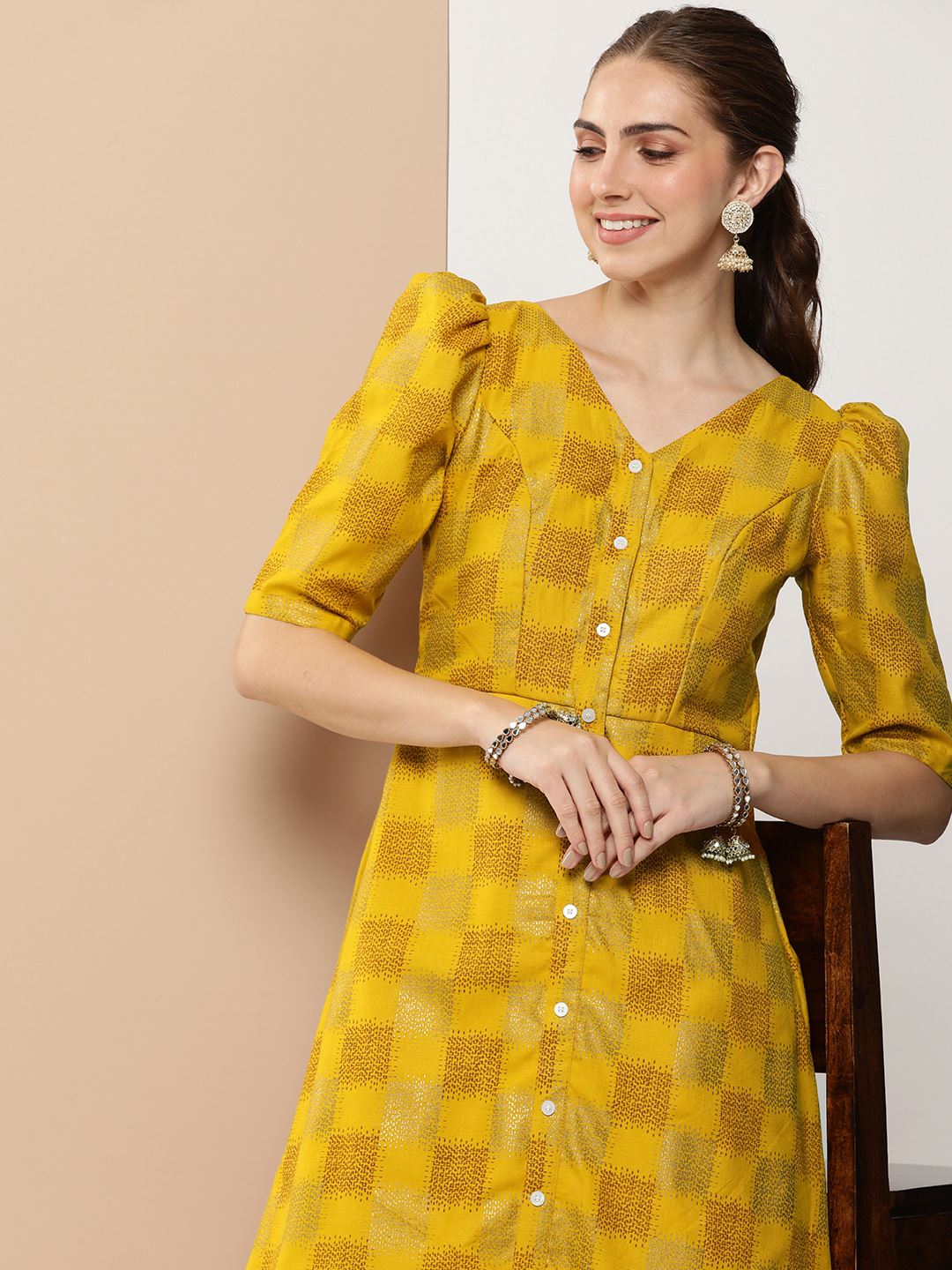 Mustard Rayon Dress With Plain and Foil Print