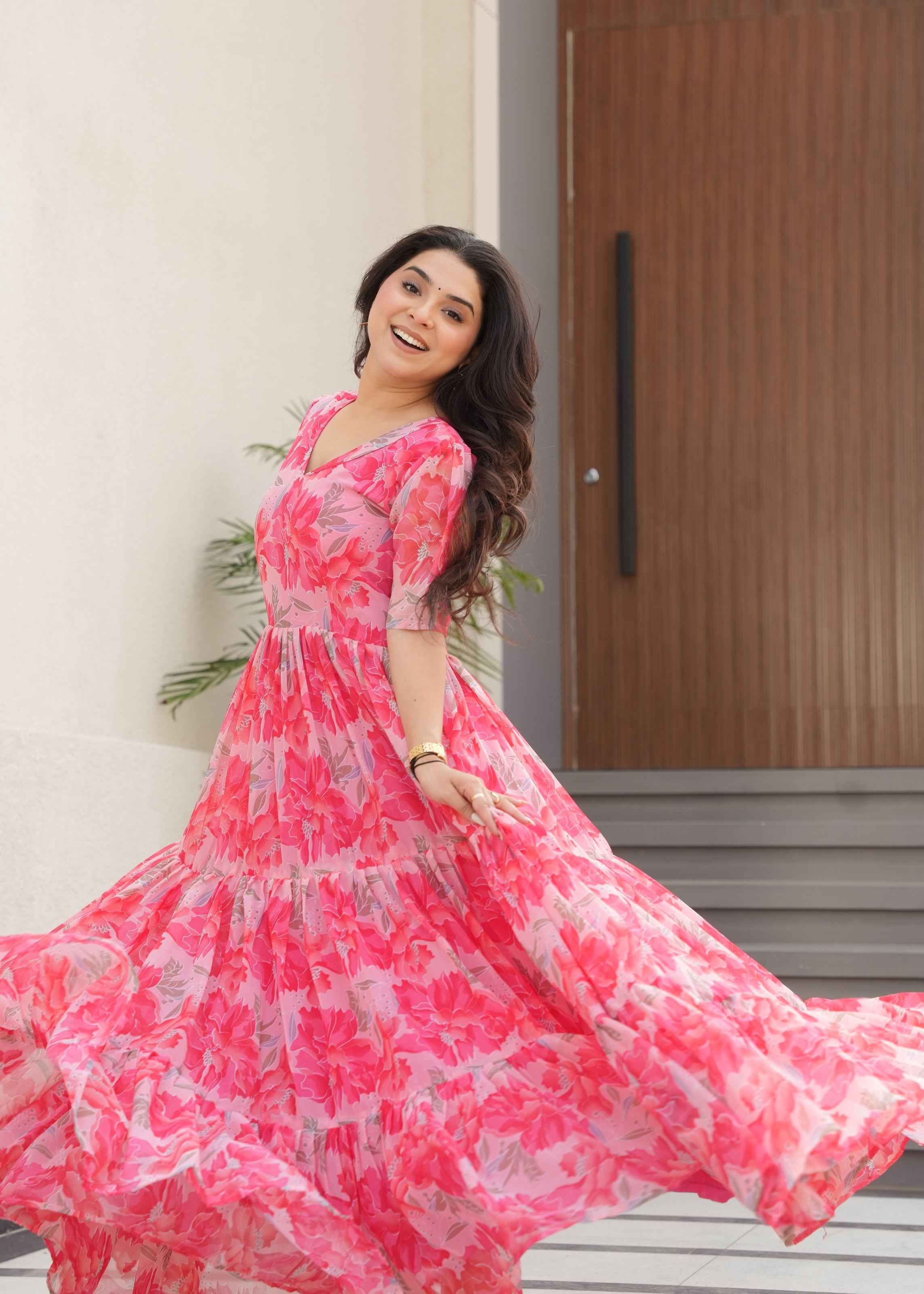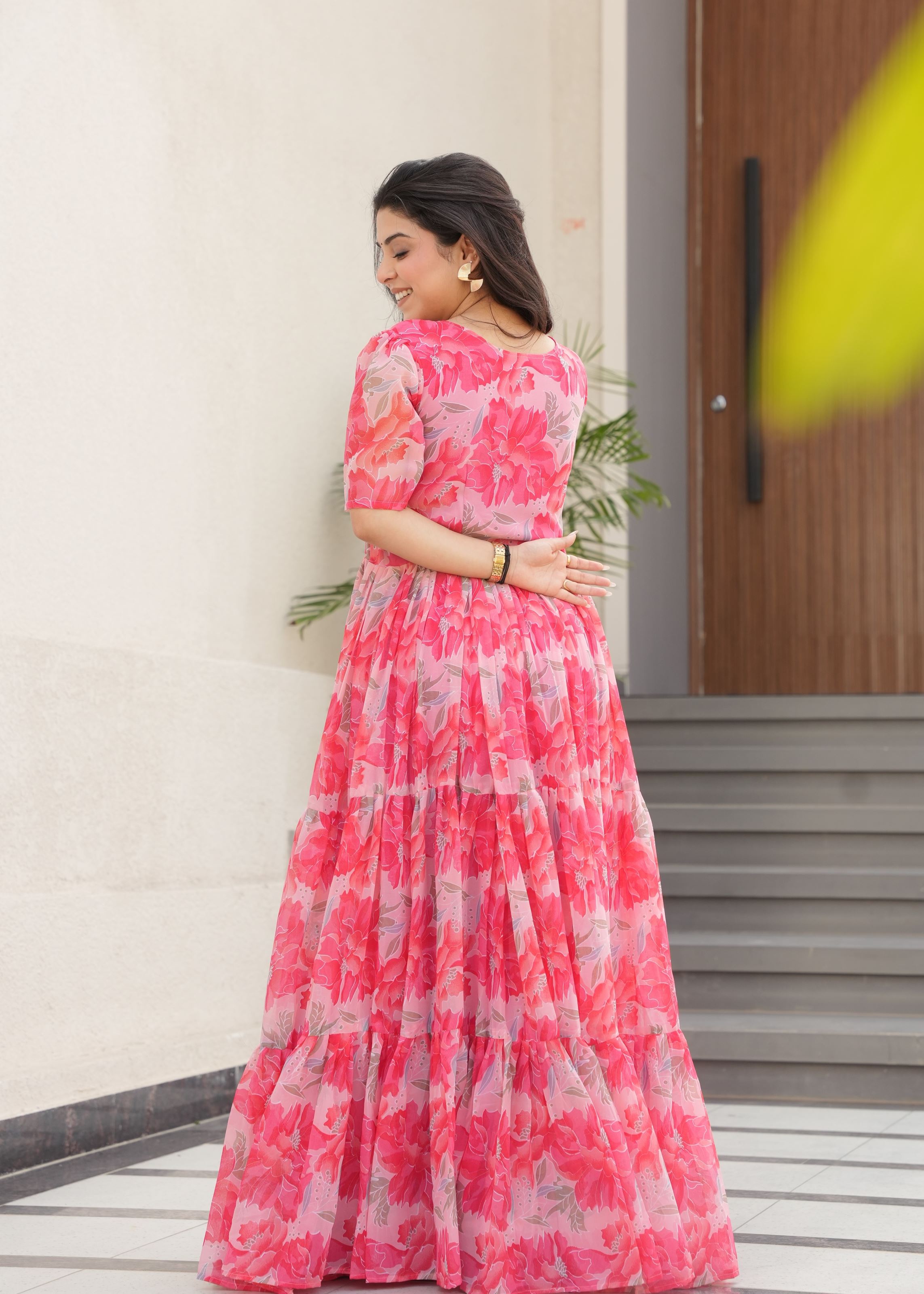 The delicate printed design adds a stylish twist, giving you a fashionable yet traditional look. With a flattering 56-inch top length, this gown complements various body types, offering both movement and poise. The semi-sheer texture of faux georgette lends it a luxe appeal that sets you apart in any gathering.