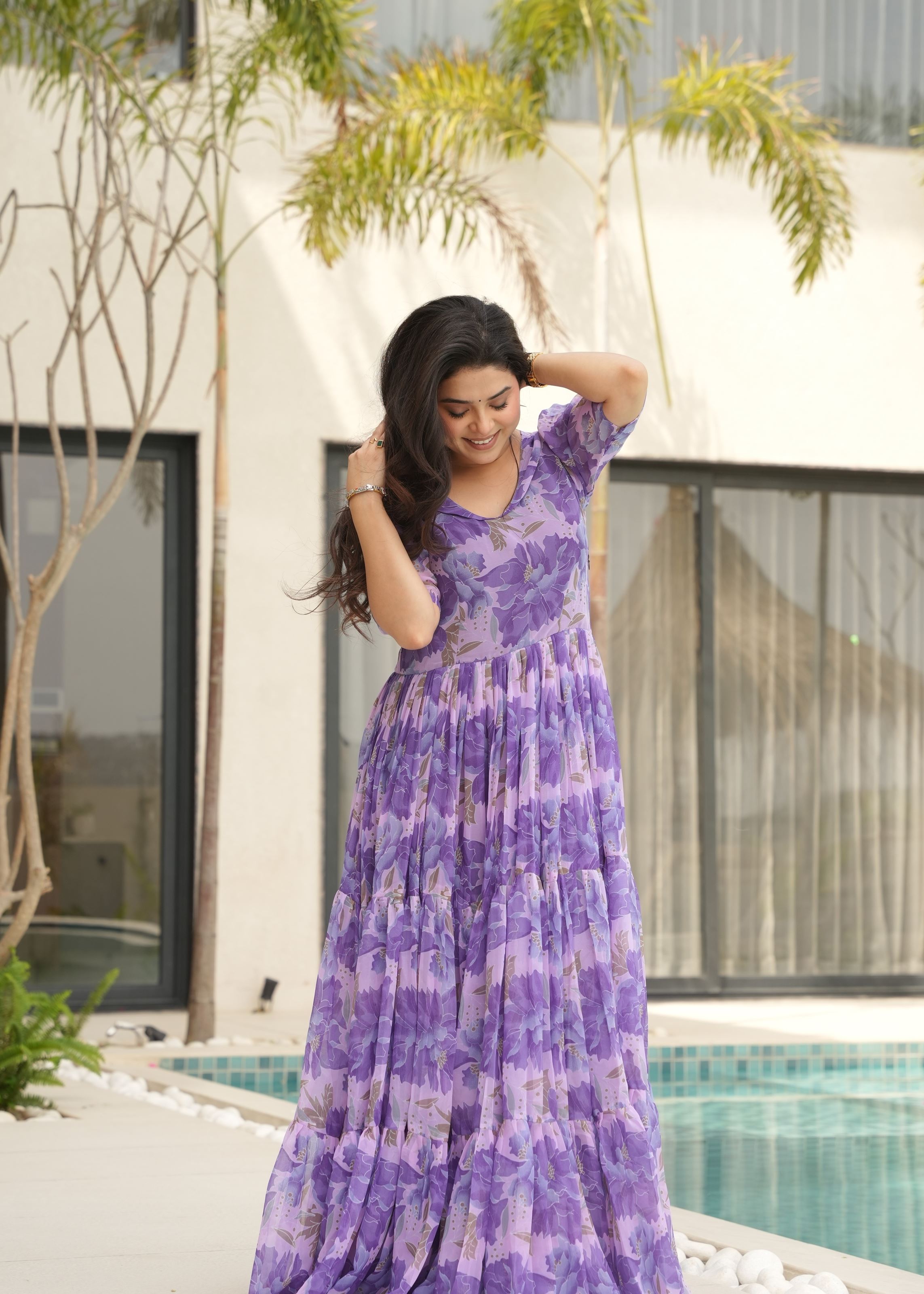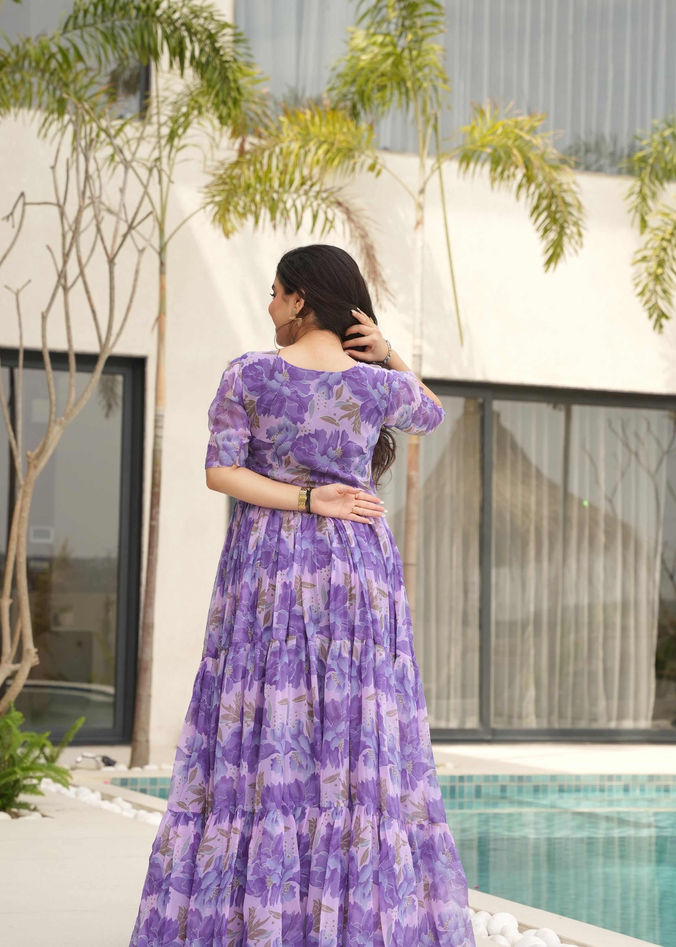 The delicate printed design adds a stylish twist, giving you a fashionable yet traditional look. With a flattering 56-inch top length, this gown complements various body types, offering both movement and poise. The semi-sheer texture of faux georgette lends it a luxe appeal that sets you apart in any gathering.