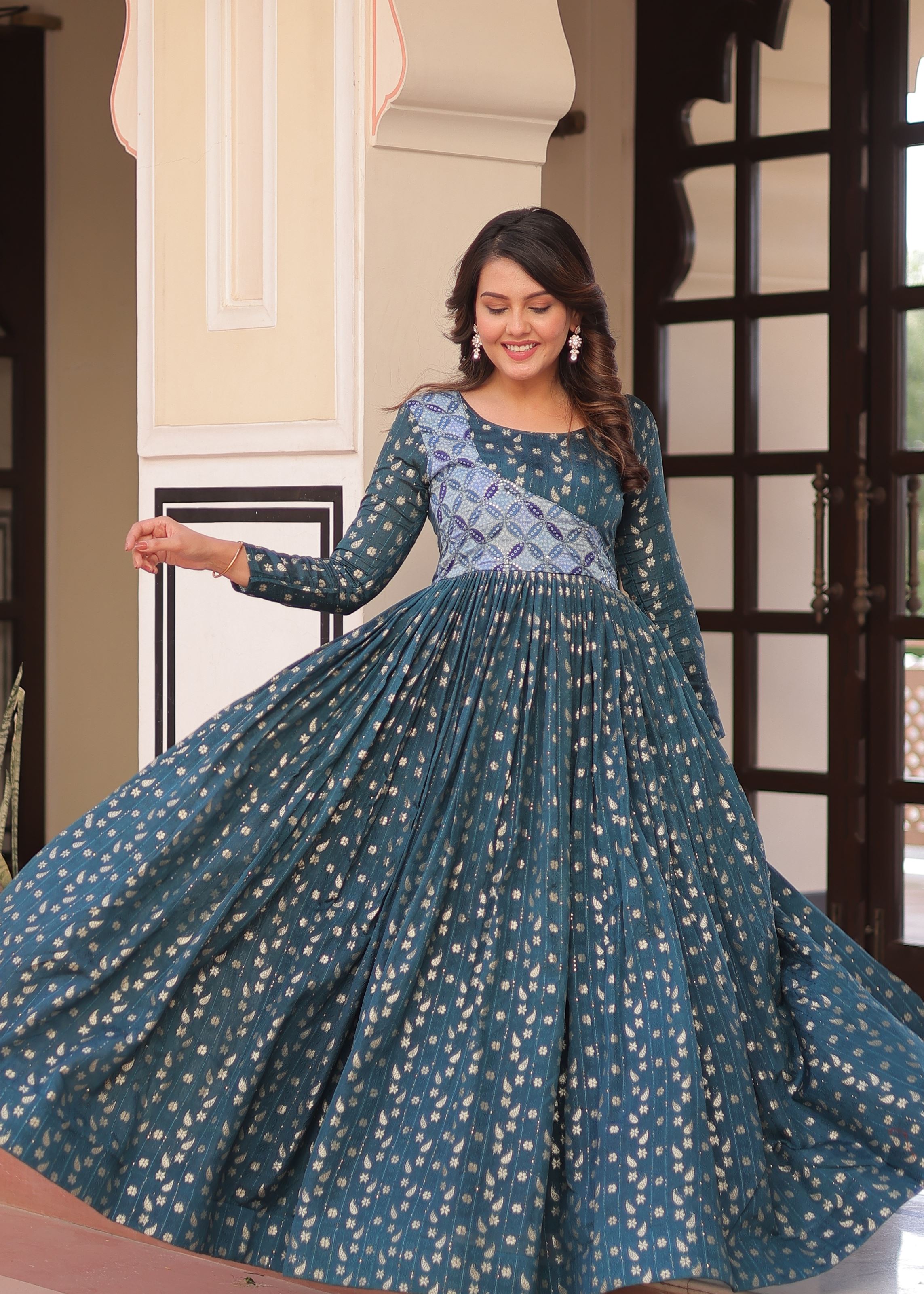 Step into refined elegance with Aethnofit Fashions' Rama Jacquard Gown With Position Print and Weaving Work, where artistry meets fashion. Crafted from luxurious jacquard fabric, this full-length 56-inch gown showcases a sophisticated rama green shade, adorned with intricate position printing and delicate weaving work. The rich texture of jacquard complements the traditional motifs, making this gown a perfect blend of contemporary grace and ethnic flair.