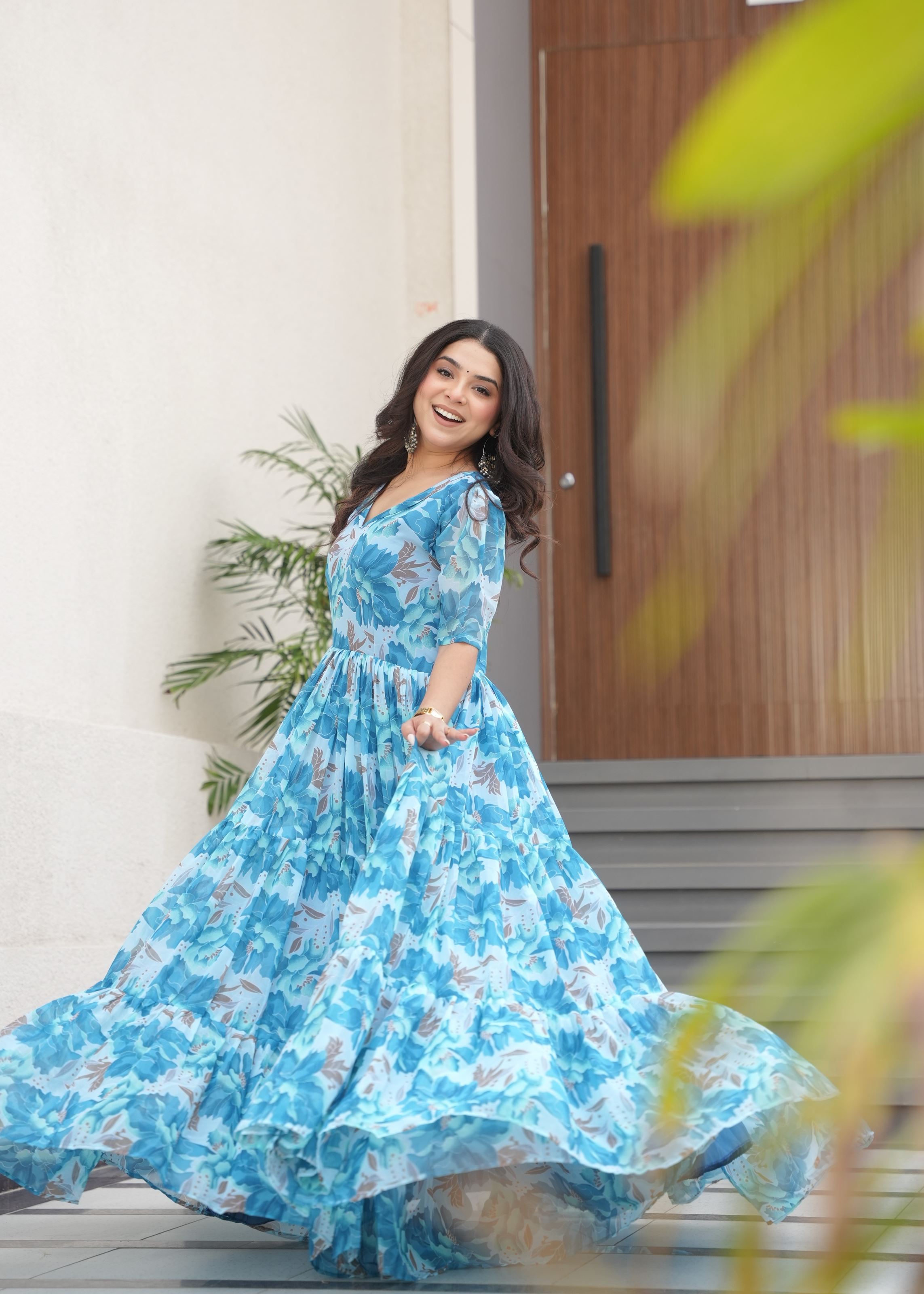 Breathe freshness and finesse into your wardrobe with this Sky Faux Georgette Gown, a serene blend of comfort and charm. The soft sky blue hue creates an effortlessly graceful look, while the high-quality faux georgette fabric ensures fluidity and elegance with every step. Designed in a flattering 56-inch top length, this gown is ideal for festive gatherings, wedding parties, or special events where sophistication meets ease.