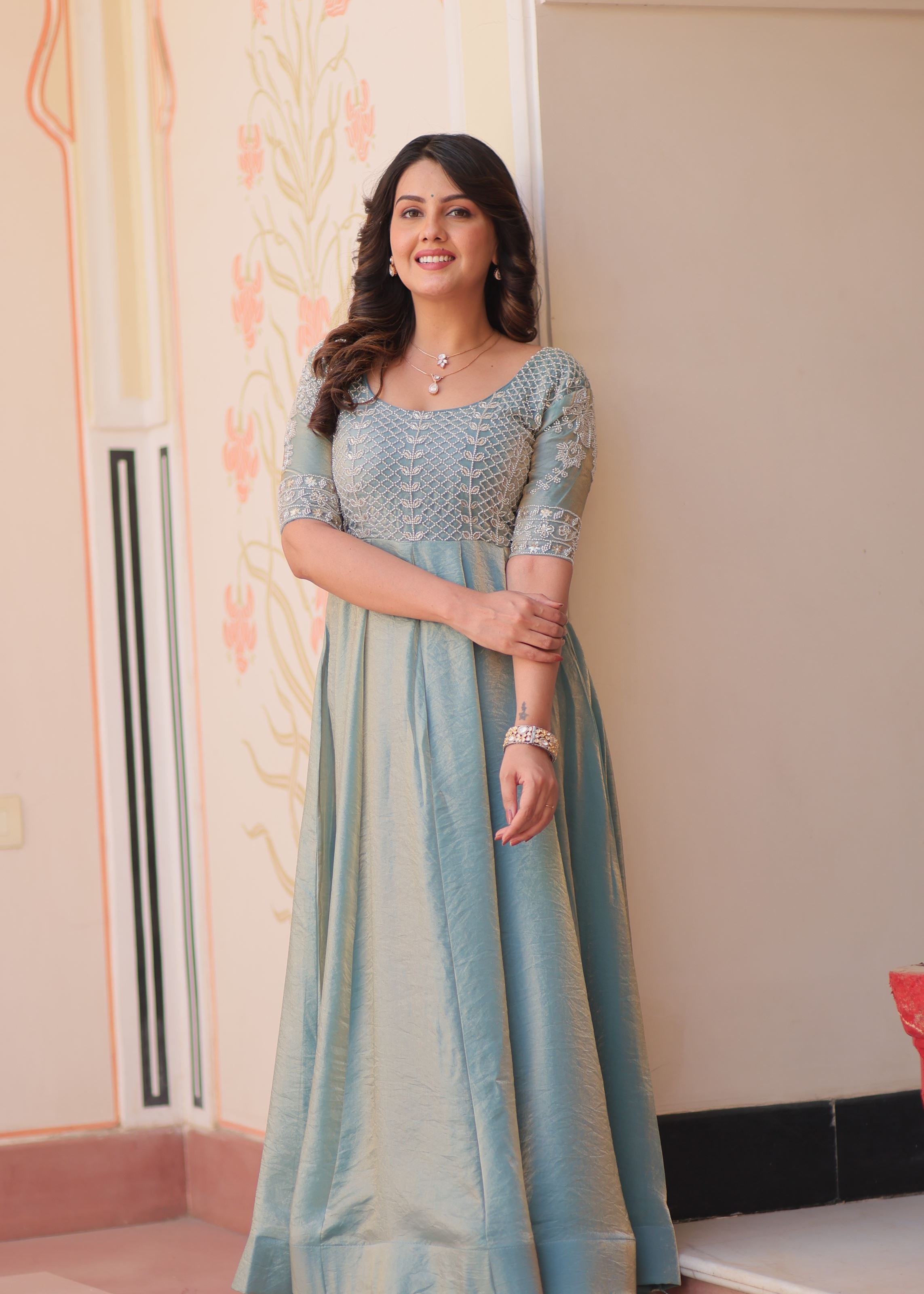 Grace your wardrobe with serene sophistication in the Sky Fendy Silk Gown With Beads Embroidered Work from Aethnofit Fashions. Designed in a soothing sky-blue shade, this 56-inch full-length gown embodies charm, comfort, and contemporary elegance. Crafted from premium fendy silk, the gown offers a rich, smooth texture that drapes beautifully while allowing ease of movement. The delicate bead embroidery adds just the right touch of sparkle, creating a stunning yet graceful aesthetic.