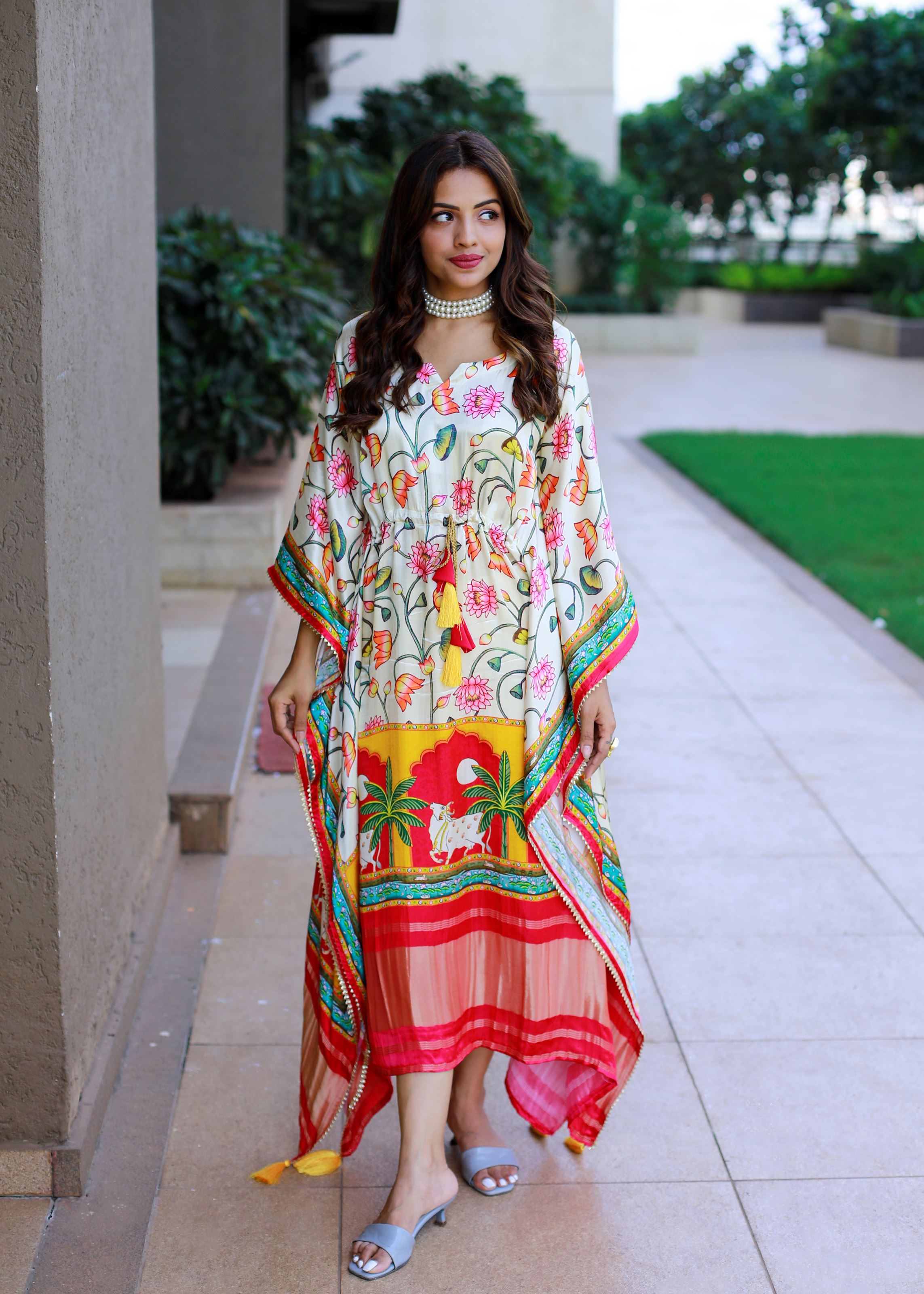 Handcrafted with care in Gujarat, this kaftan reflects India’s textile heritage at its finest. Experience the charm of Aethnofit Fashions, offering worldwide shipping on premium designer kaftans for women.
