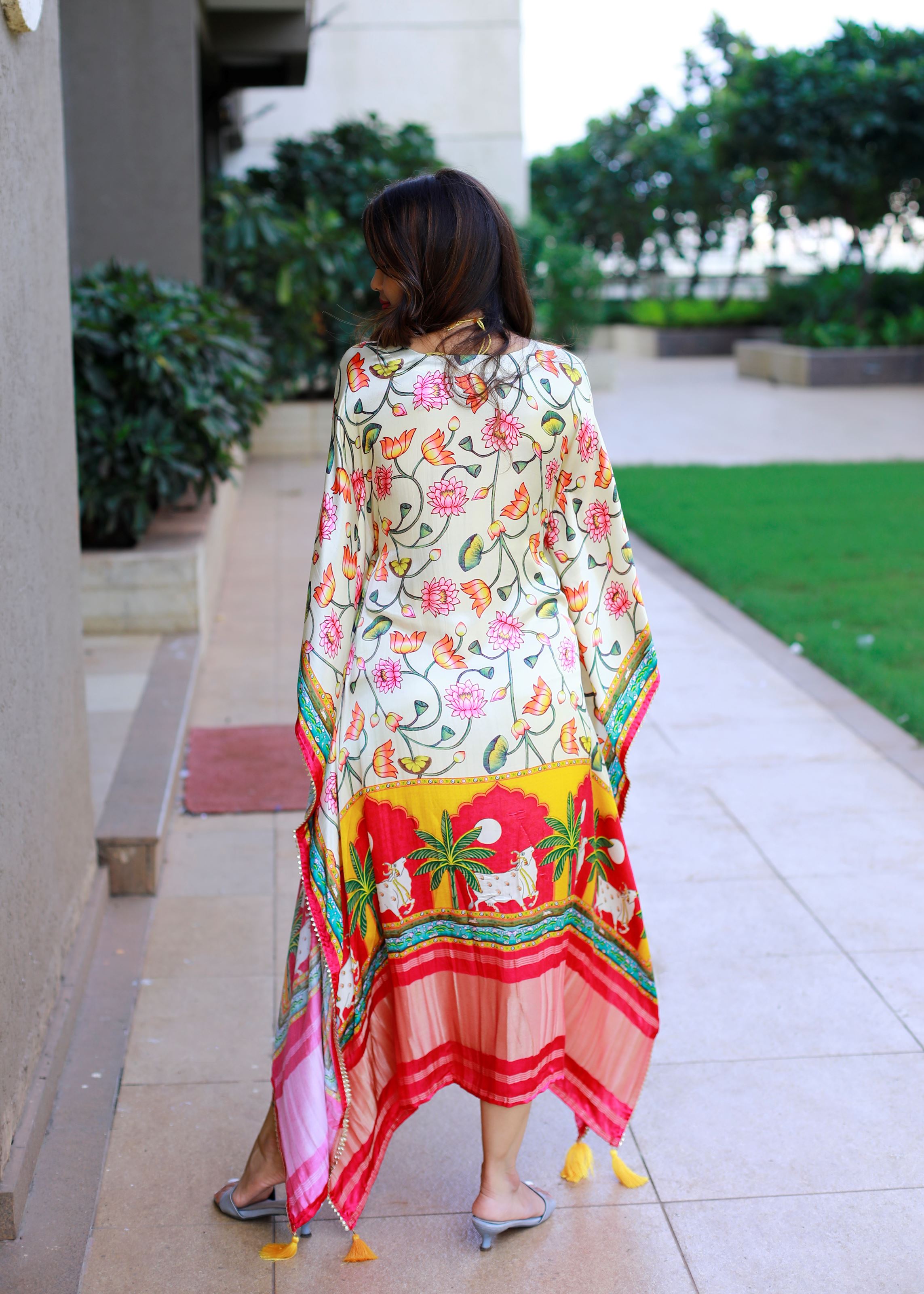 Adorned with intricate Gotta Patti embroidery, the neckline and sleeve borders shimmer with delicate artistry that elevates the kaftan’s festive charm. Elegant tassels along the hem add a subtle, flowing movement that enhances the overall silhouette. The relaxed, free-size fit ensures maximum comfort, making it suitable for all body types and easy to wear for long occasions.