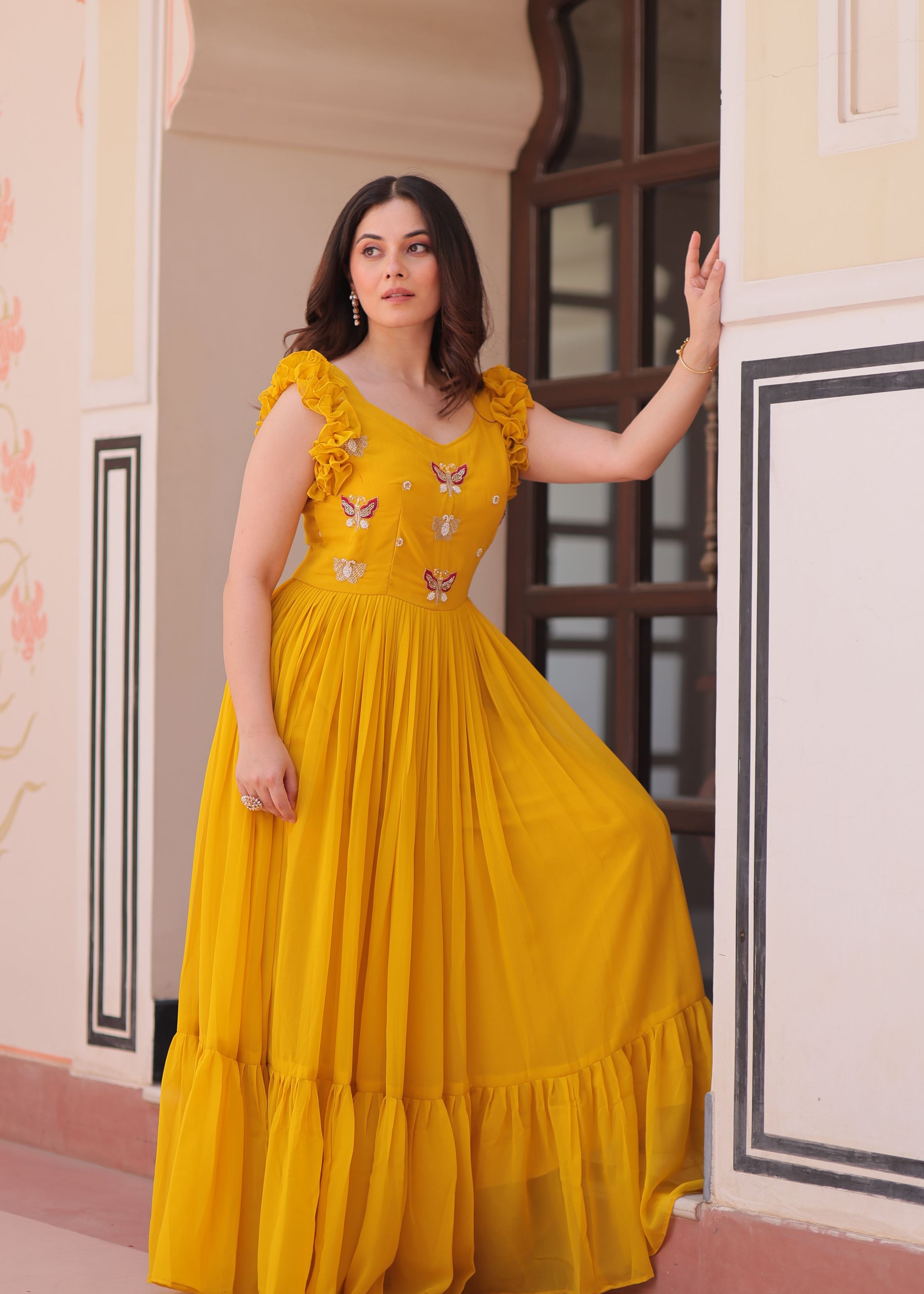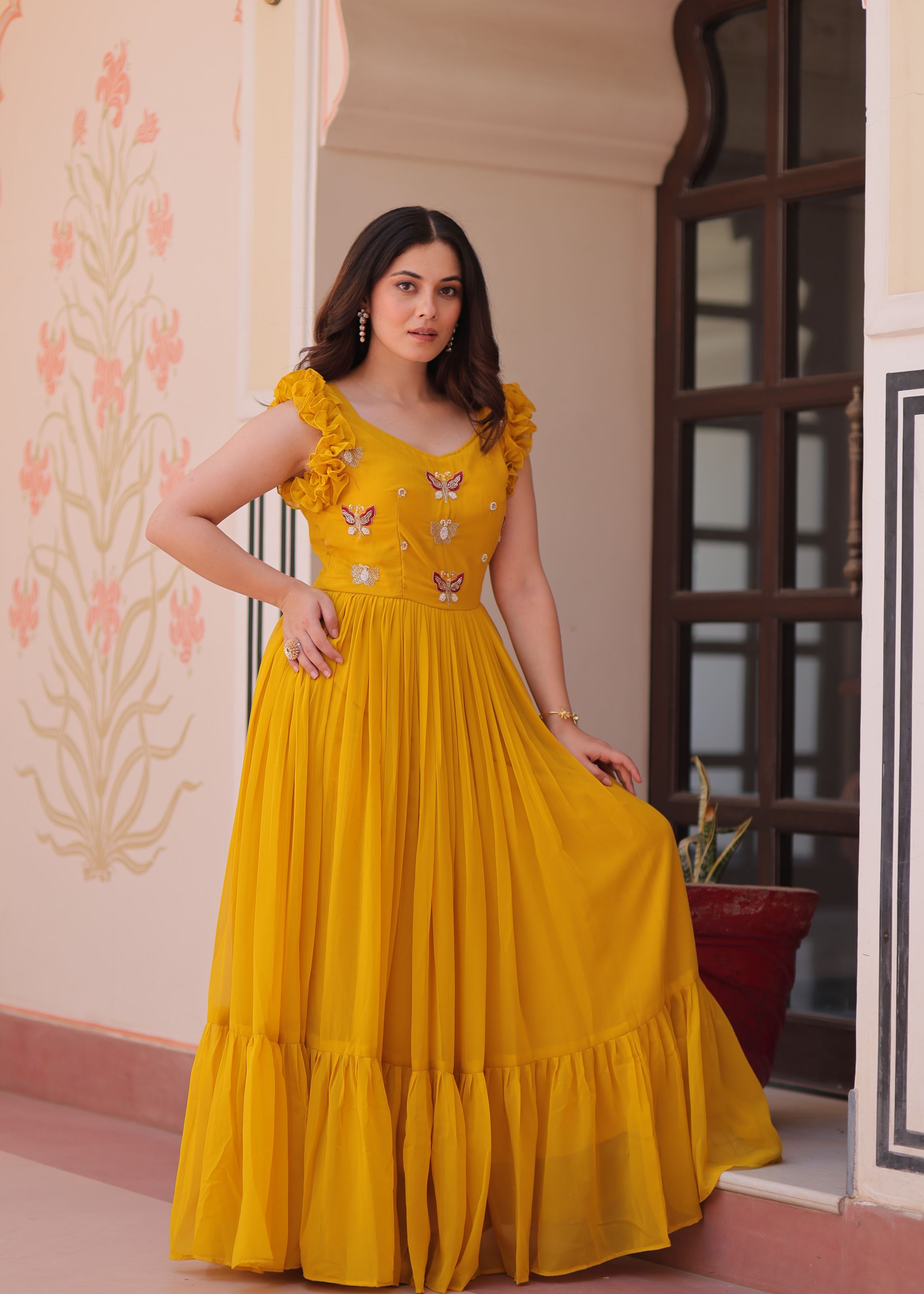 Yellow Faux Blooming Gown With Sequins & Multithreaded Beads Embroidered Work