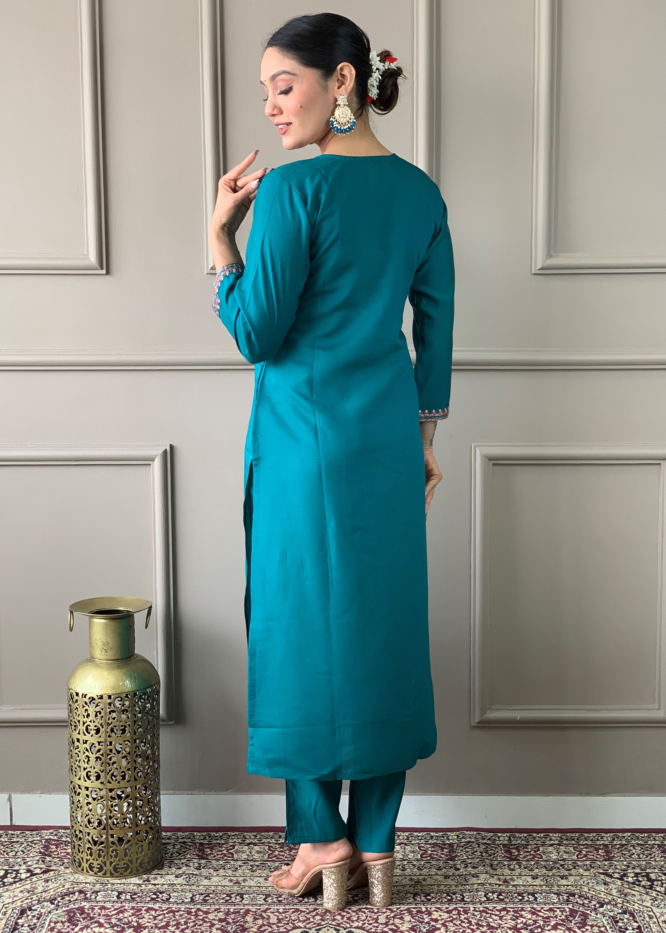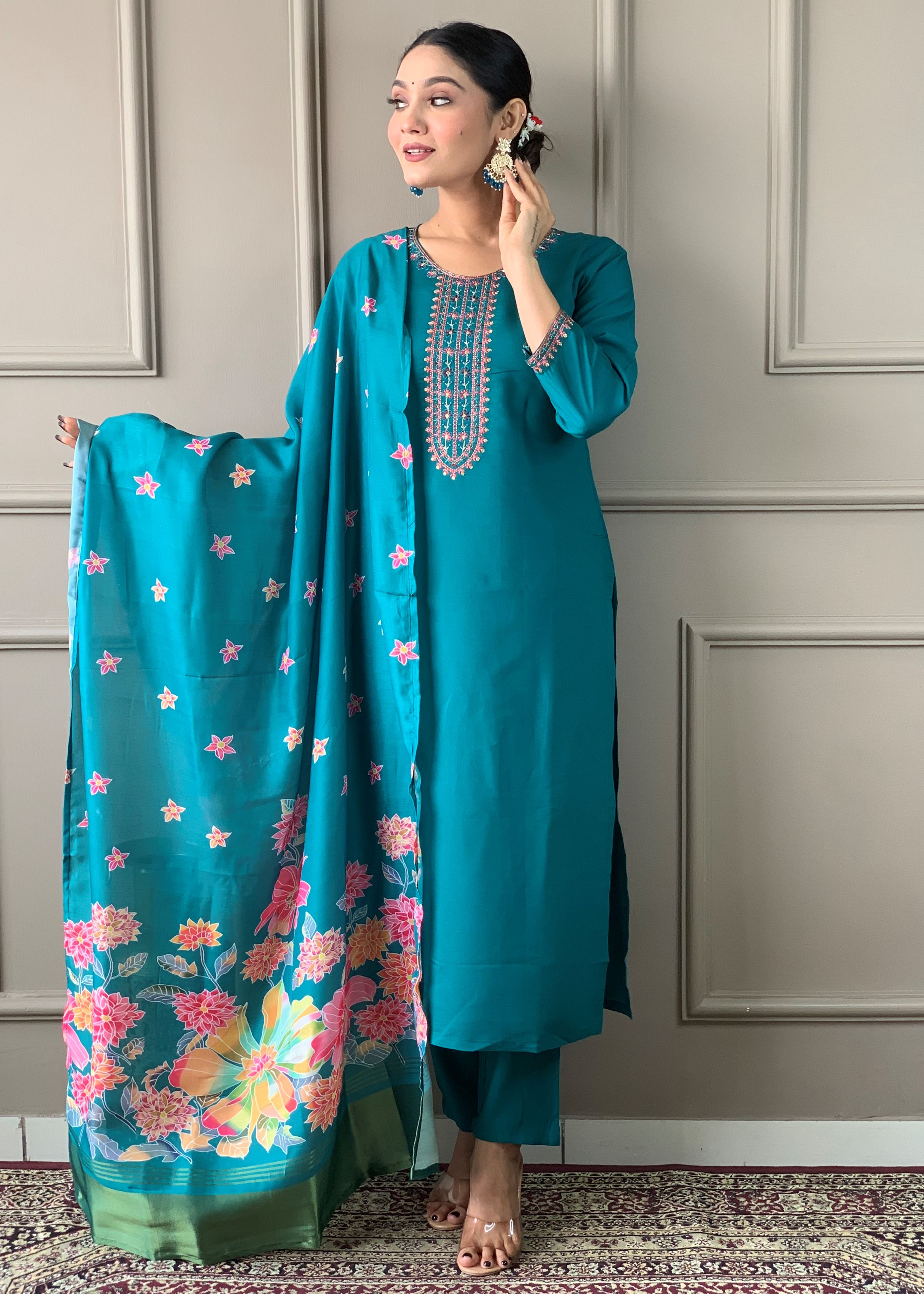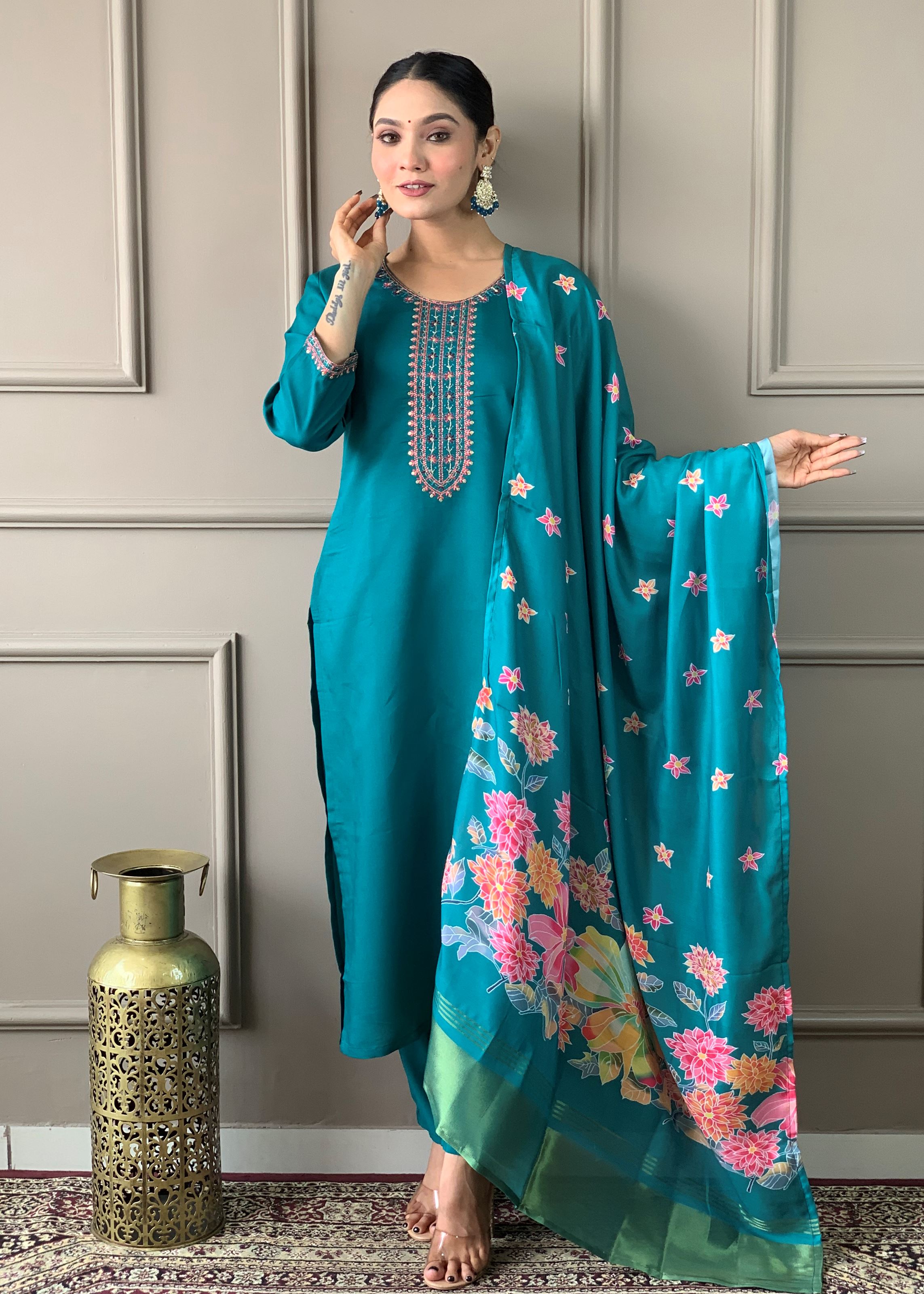 Aqua Blue Viscose Chanderi Kurta Pant With Heavy Thread Embroidery Work With Printed Dupatta