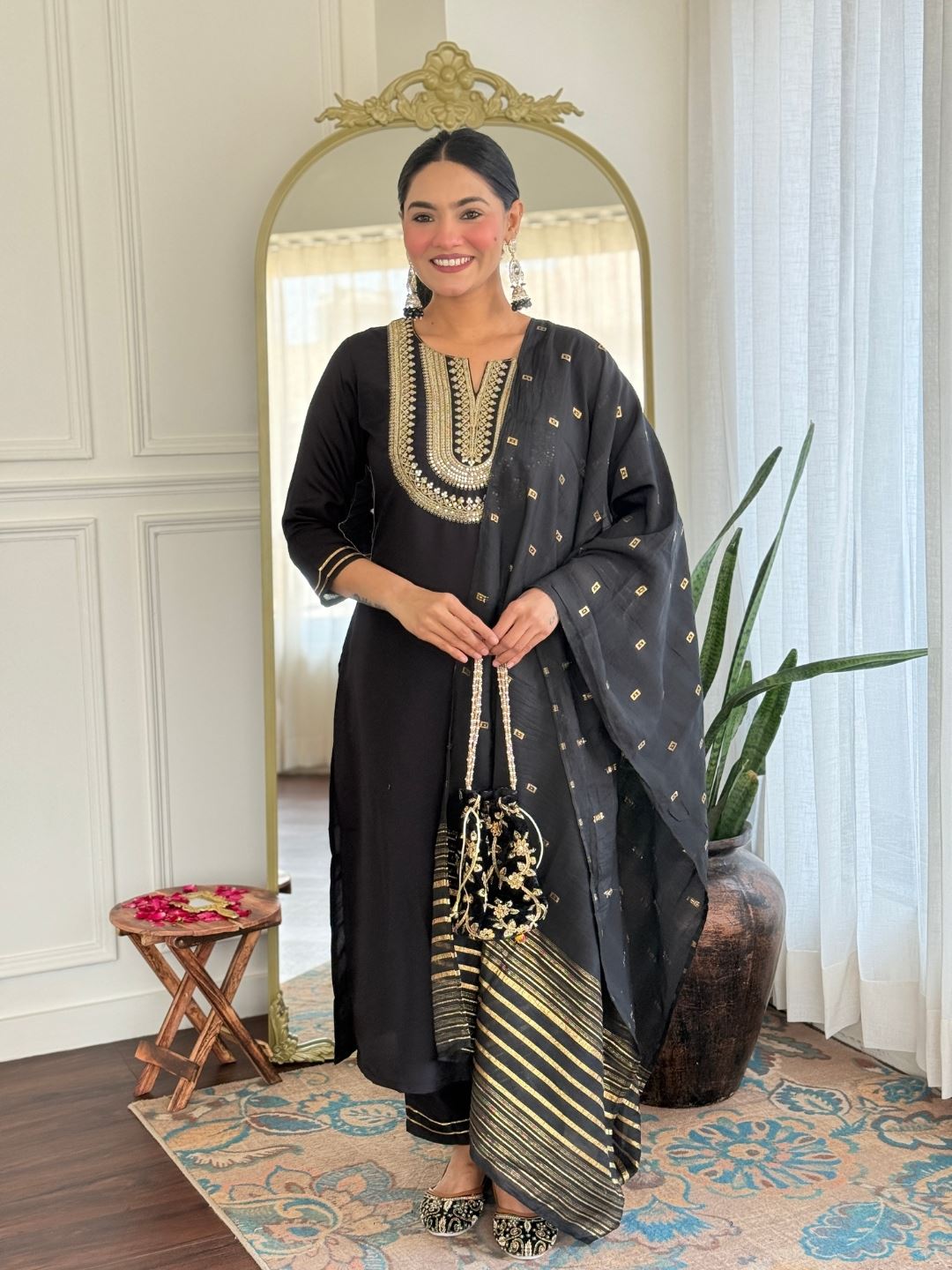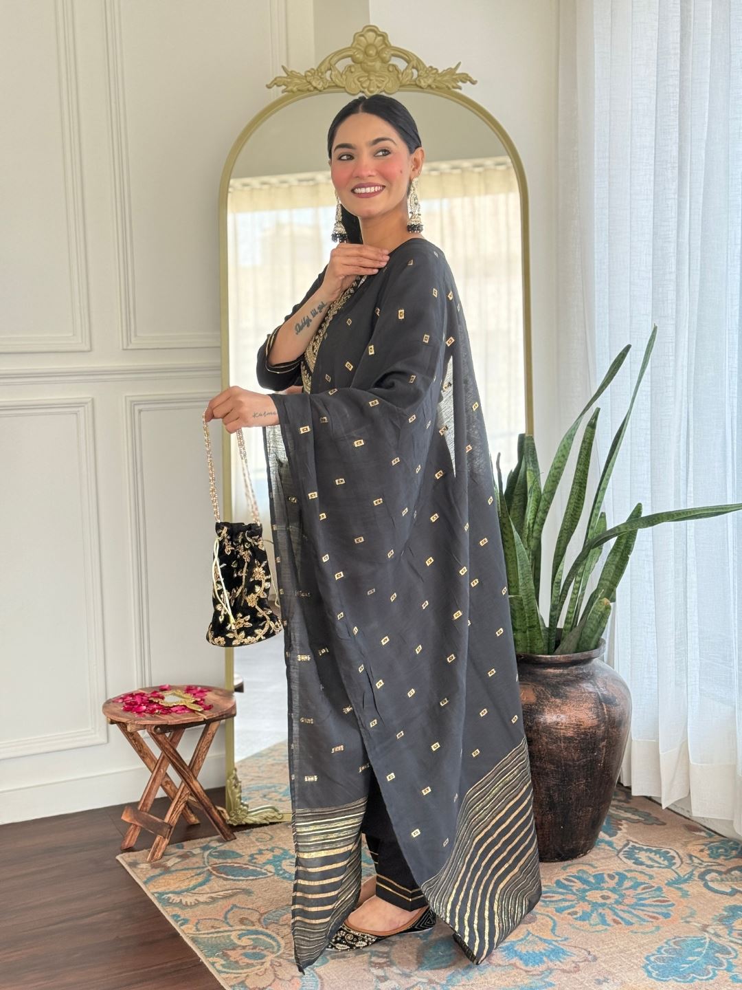 The matching cotton slub dupatta in black complements the outfit, giving it a minimal yet elegant flair—perfect for those who appreciate understated fashion with a touch of detail.