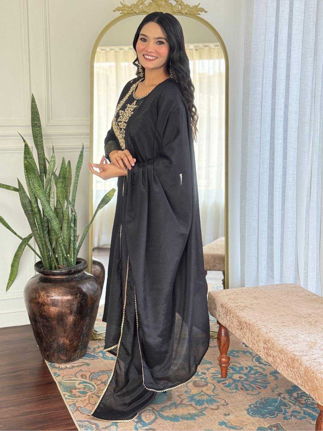 Paired with comfortable black rayon pants that ensure ease of movement and a flattering fit, this set is ideal for festive occasions, formal gatherings, or even elevated office wear. The outfit is beautifully completed with a lightweight Nazmin dupatta in matching black, adding fluidity and elegance to your overall look. Whether styled with traditional jhumkas or minimalist accessories, this set delivers versatile charm for any setting.