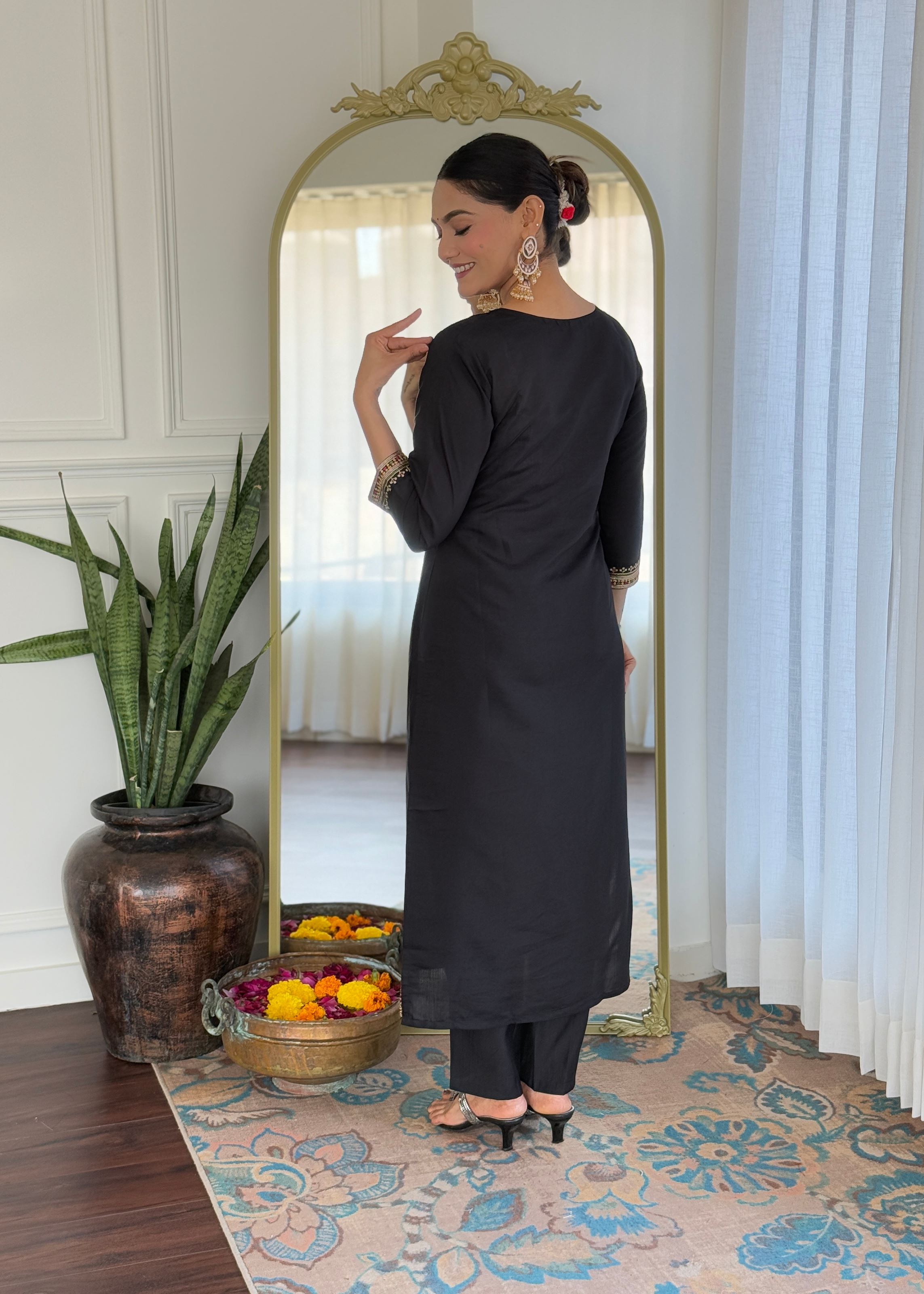 Whether you're attending a formal function or hosting a festive evening, this black embroidered kurta set promises effortless elegance with timeless appeal. Pair it with oxidised silver accessories or heels for a look that speaks of poise and confidence.