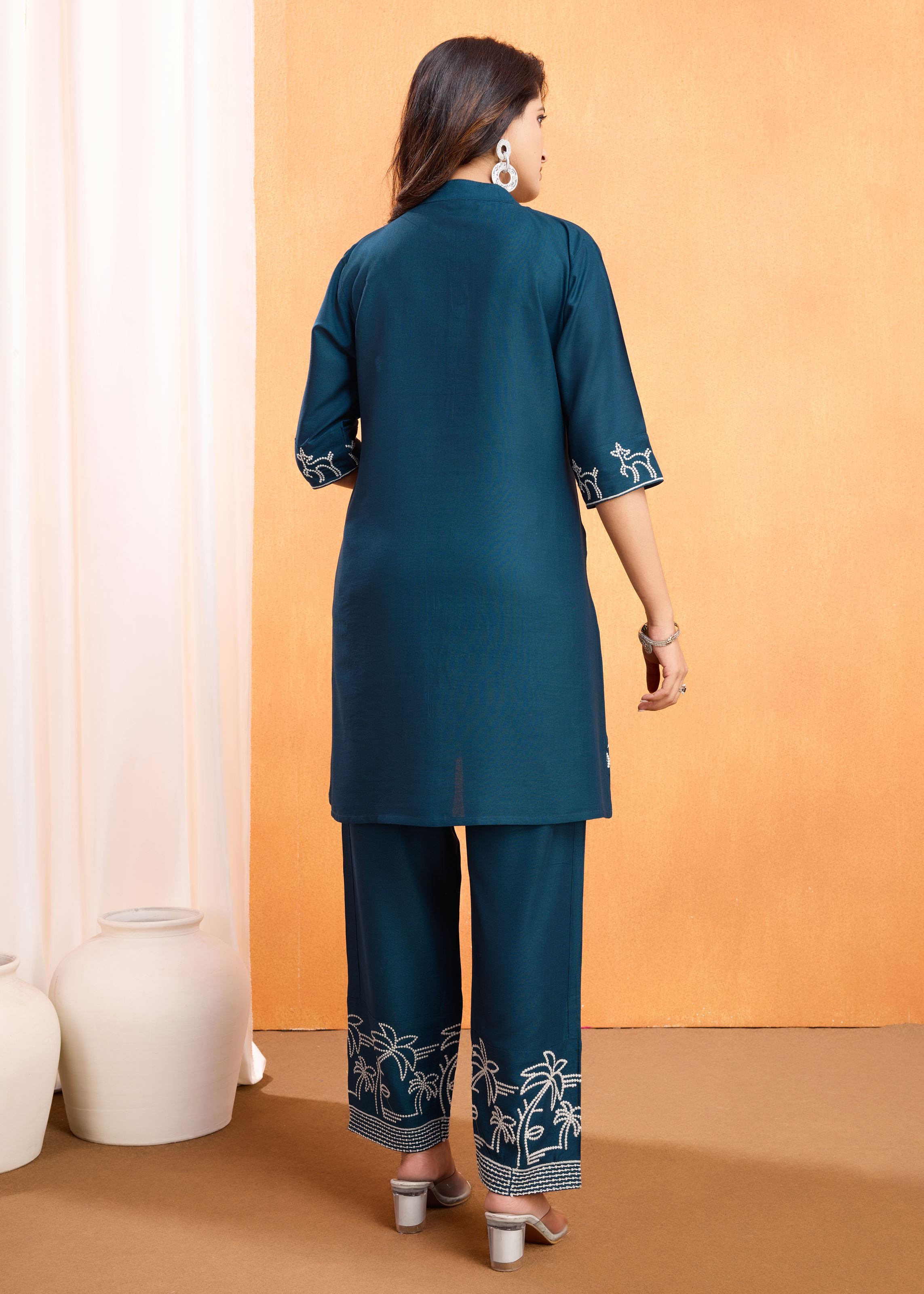 Blue Vicose Rayon Kurta Pant With Thread Embroidery Work