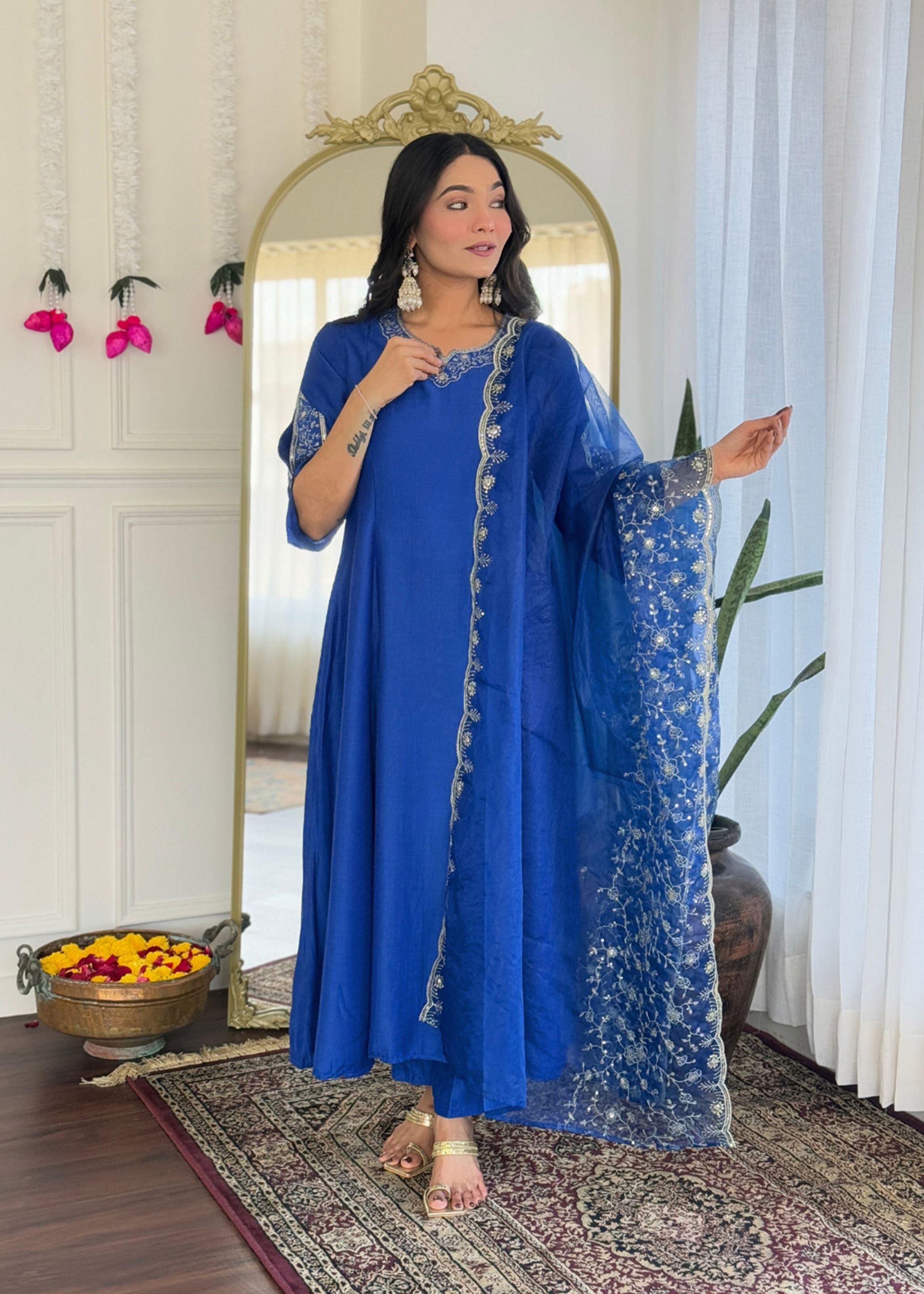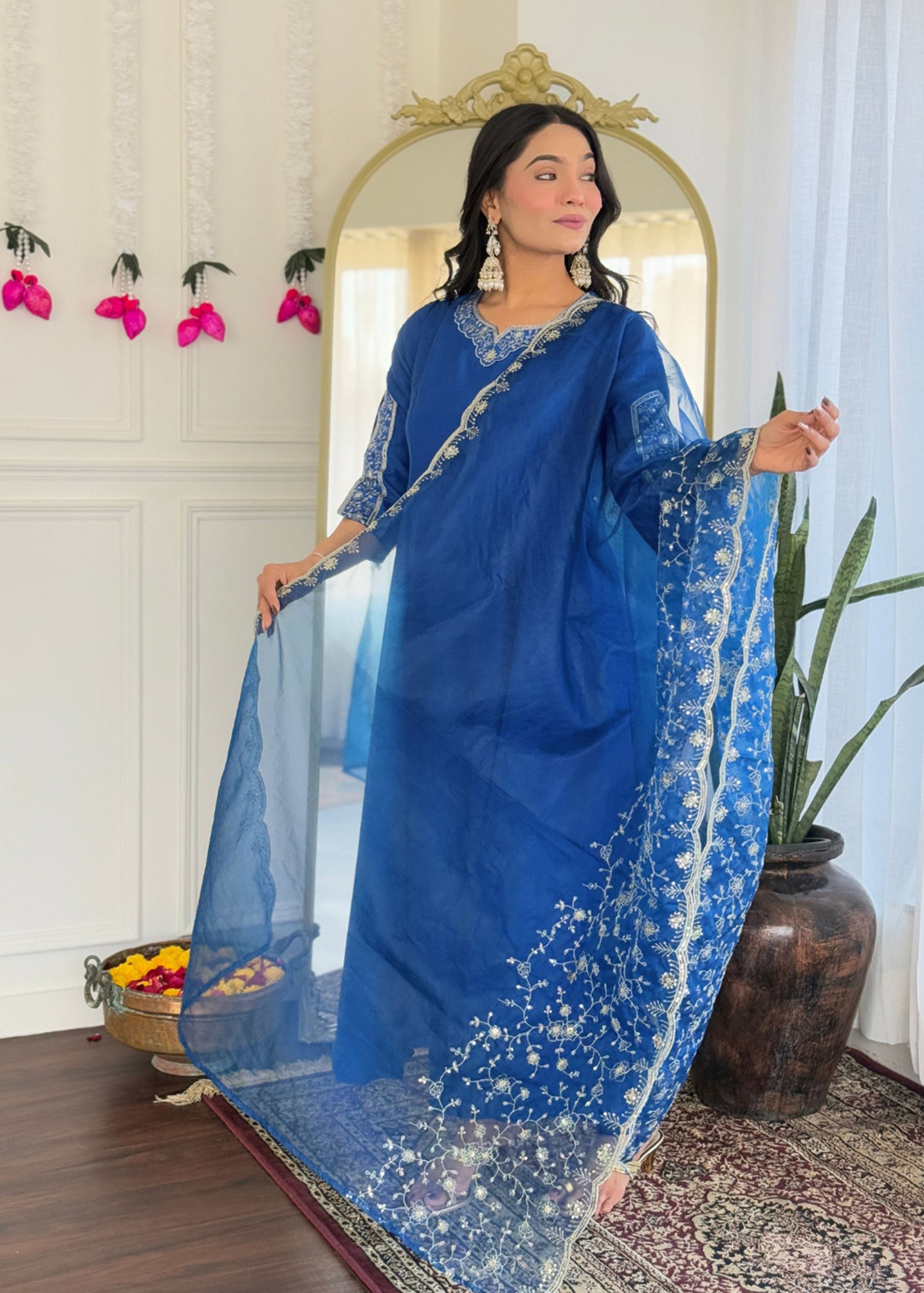 The kurta features a well-defined V neckline and classic 3/4th sleeves, beautifully adorned with refined embroidery work that brings out the charm of traditional Indian craftsmanship. The coordinated blue viscose silk pants maintain a polished silhouette while ensuring comfort throughout the day. Completing the look is a lightweight organza dupatta in matching blue, designed to add an elegant flair with its subtle translucence and refined finish.