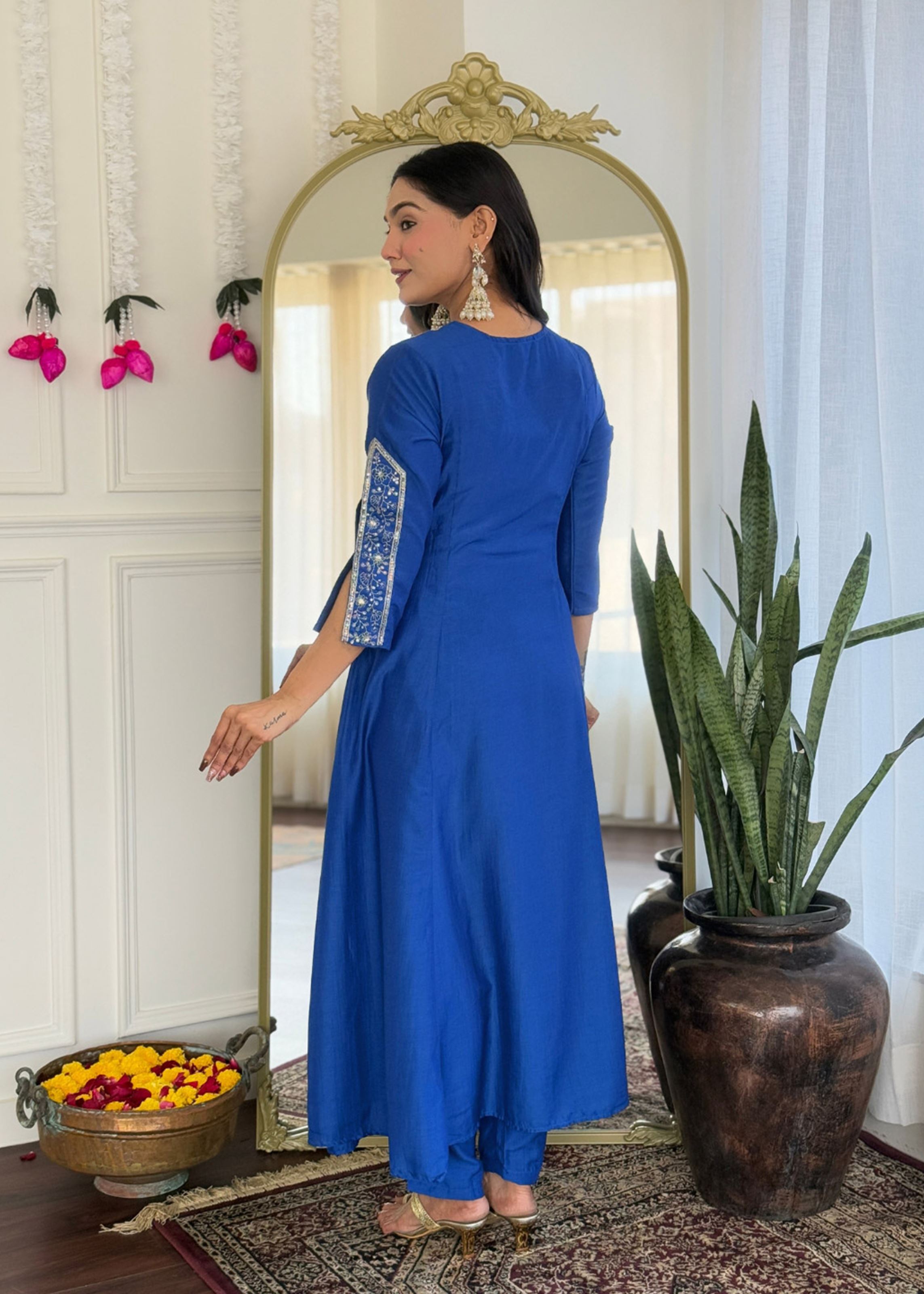 Blue Viscose Silk Elegant Kurta Pant Set With Embroidery Work