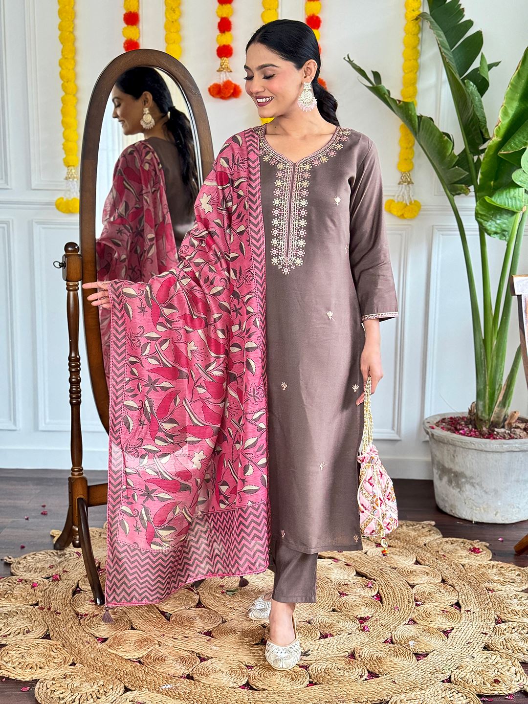 Brown Viscose Chanderi Kurta Pant With Embroidery Work And Printed Dupatta