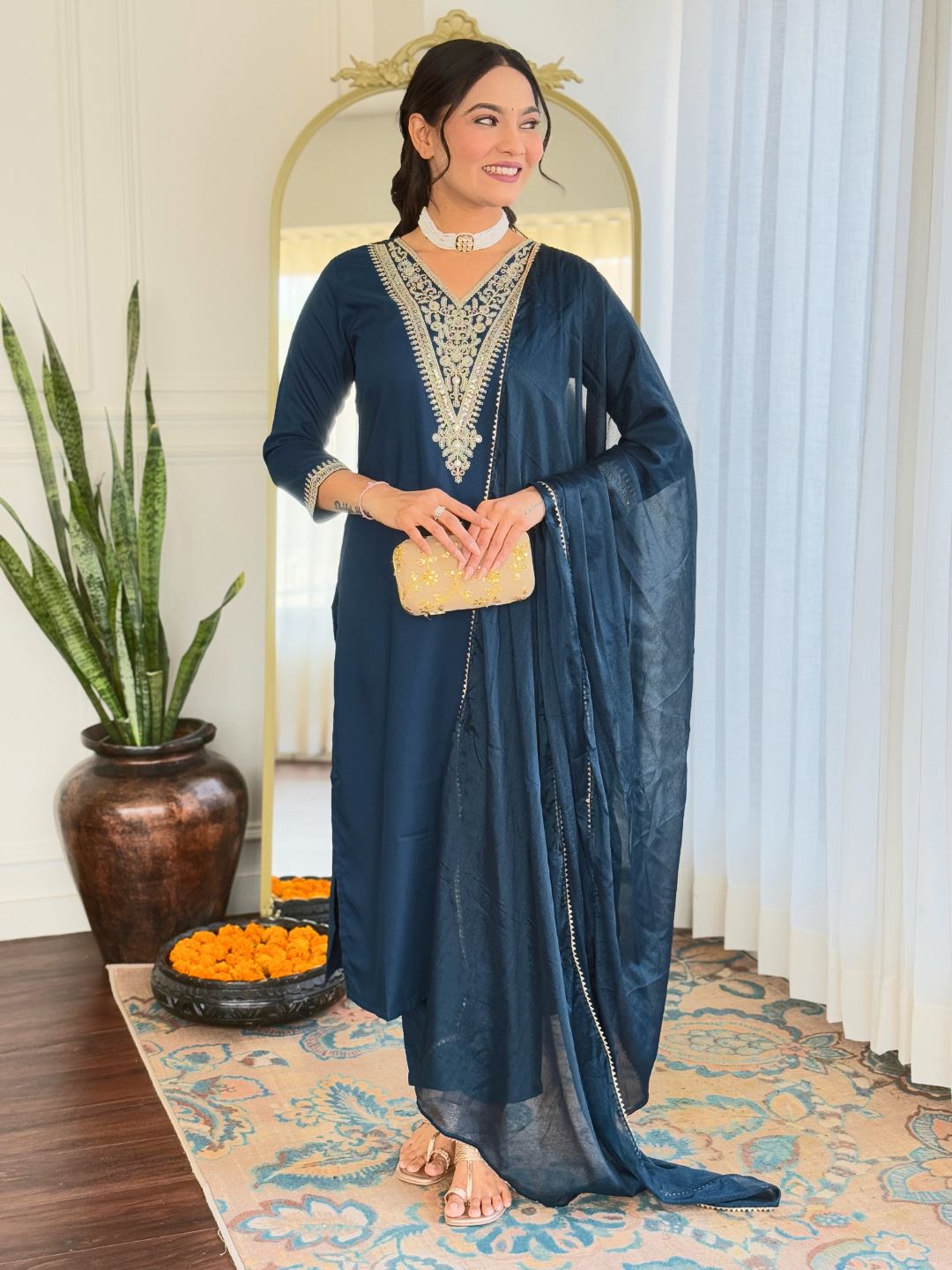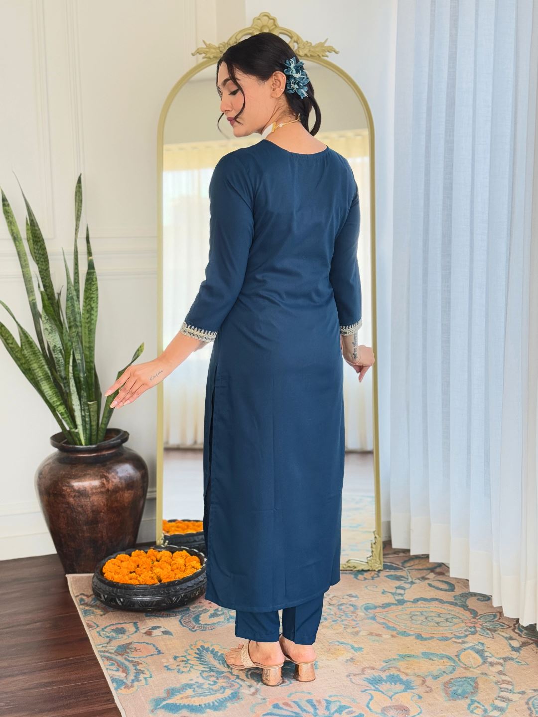 The kurta features a graceful V-neckline and 3/4 sleeves, thoughtfully designed to complement your figure while ensuring ease of movement. Detailed embroidery work adorns the front, adding a refined traditional touch that brings richness to the deep blue hue. The matching rayon pants complete the coordinated look with a clean and classy silhouette.