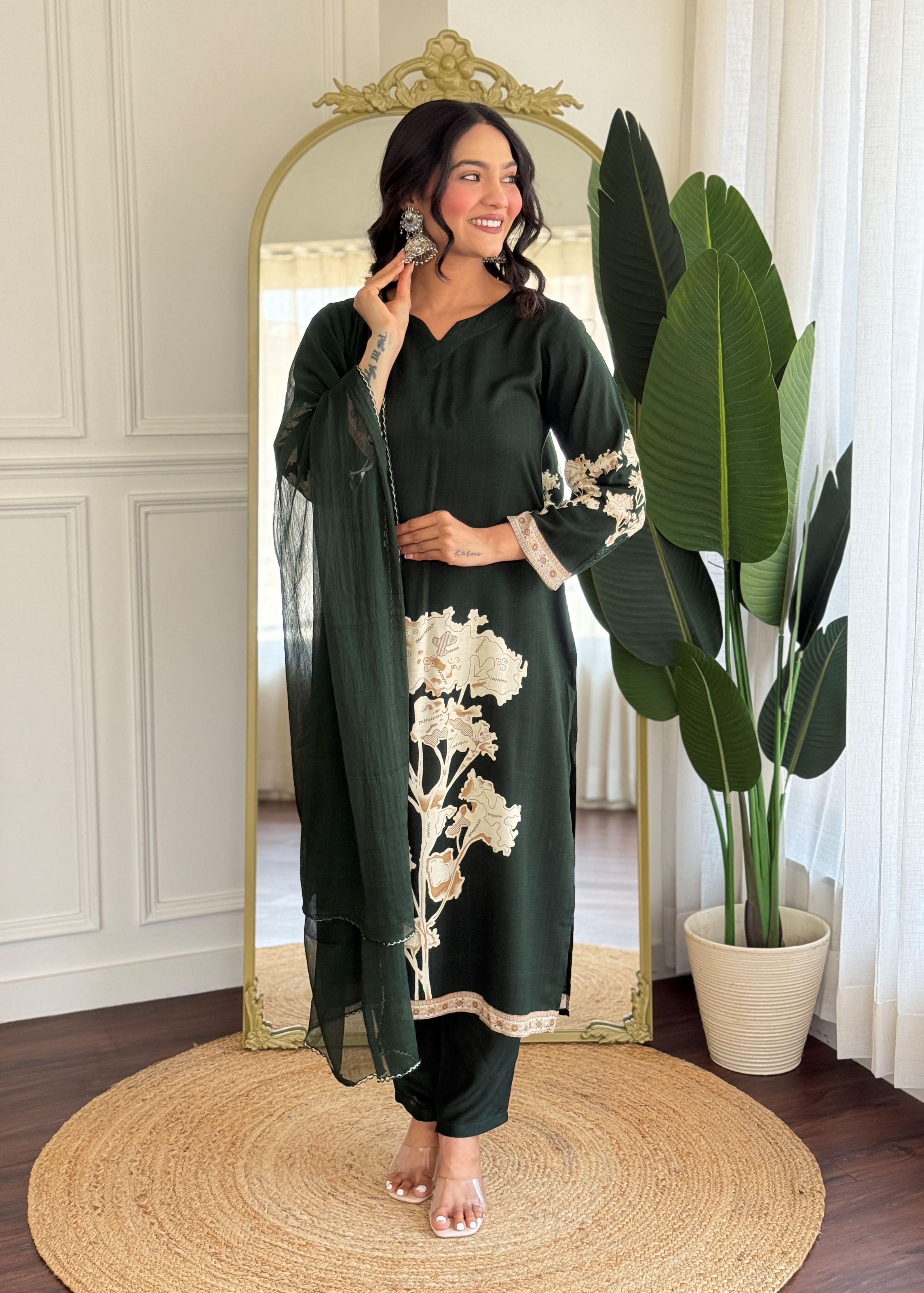 Dark Green Pure Viscose Rayon Kurta Pant with Printed Dupatta