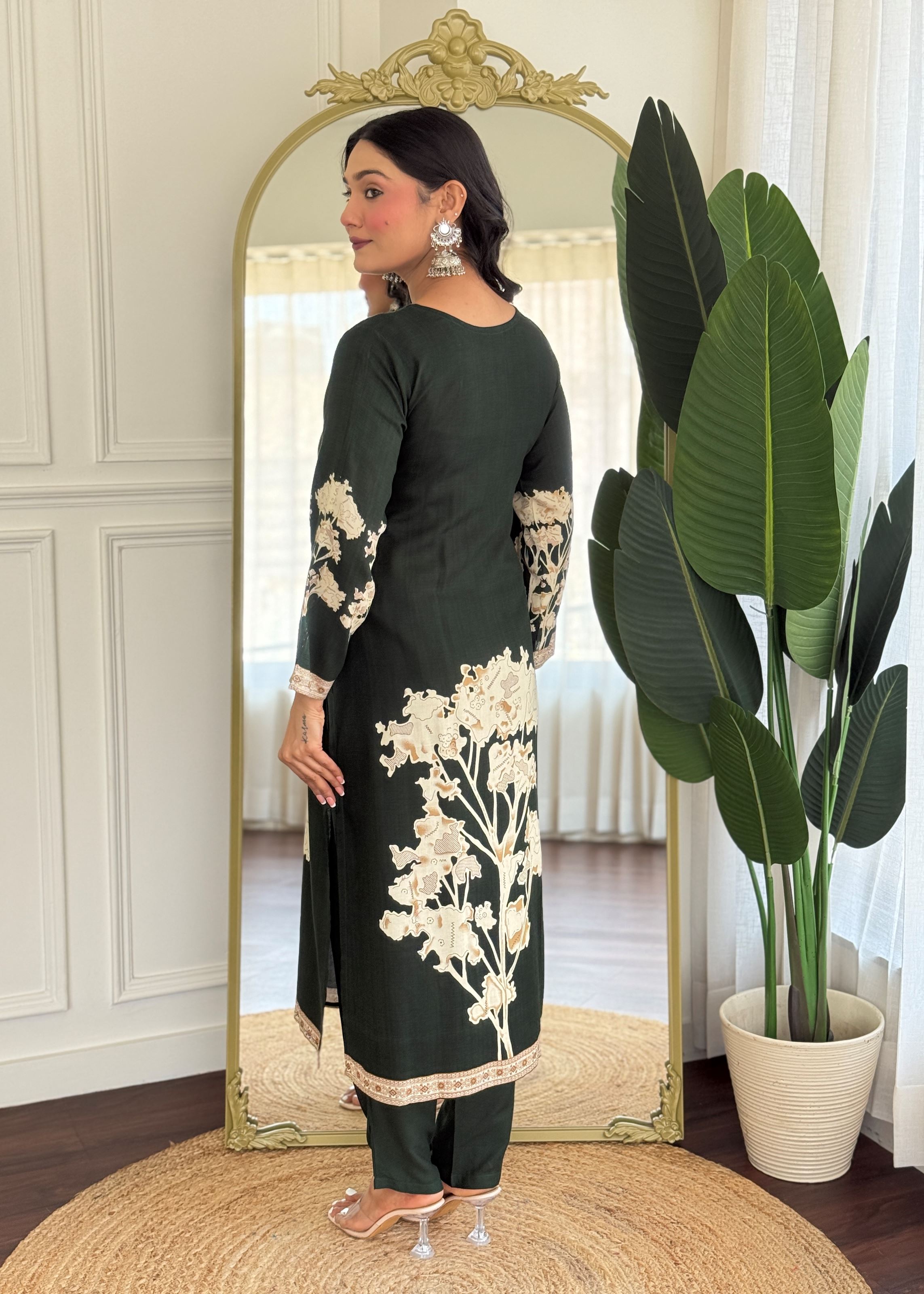 Dark Green Pure Viscose Rayon Kurta Pant with Printed