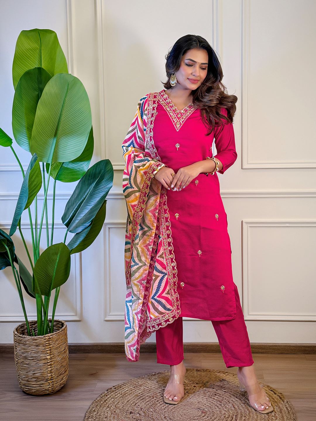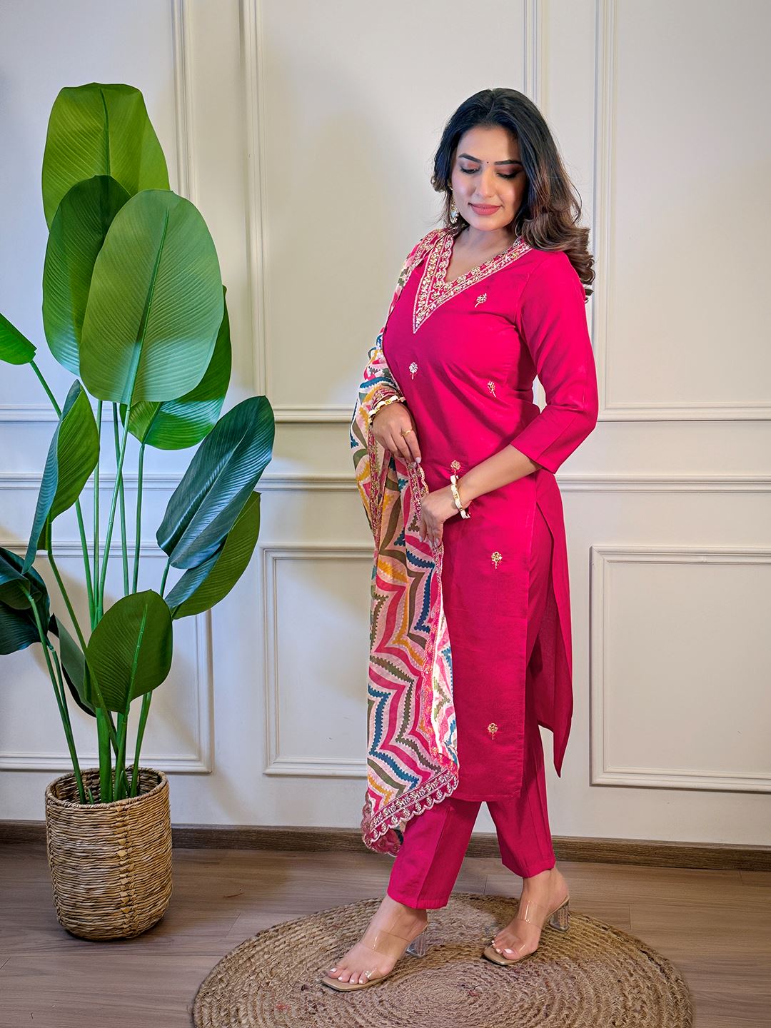 The coordinating viscose pants ensure comfort and ease of movement, while the matching silk blend dupatta lends a luxurious finish with its gentle sheen and soft drape. Together, this trio creates an effortlessly graceful ensemble that’s ideal for poojas, small functions, family gatherings, or casual festive wear.