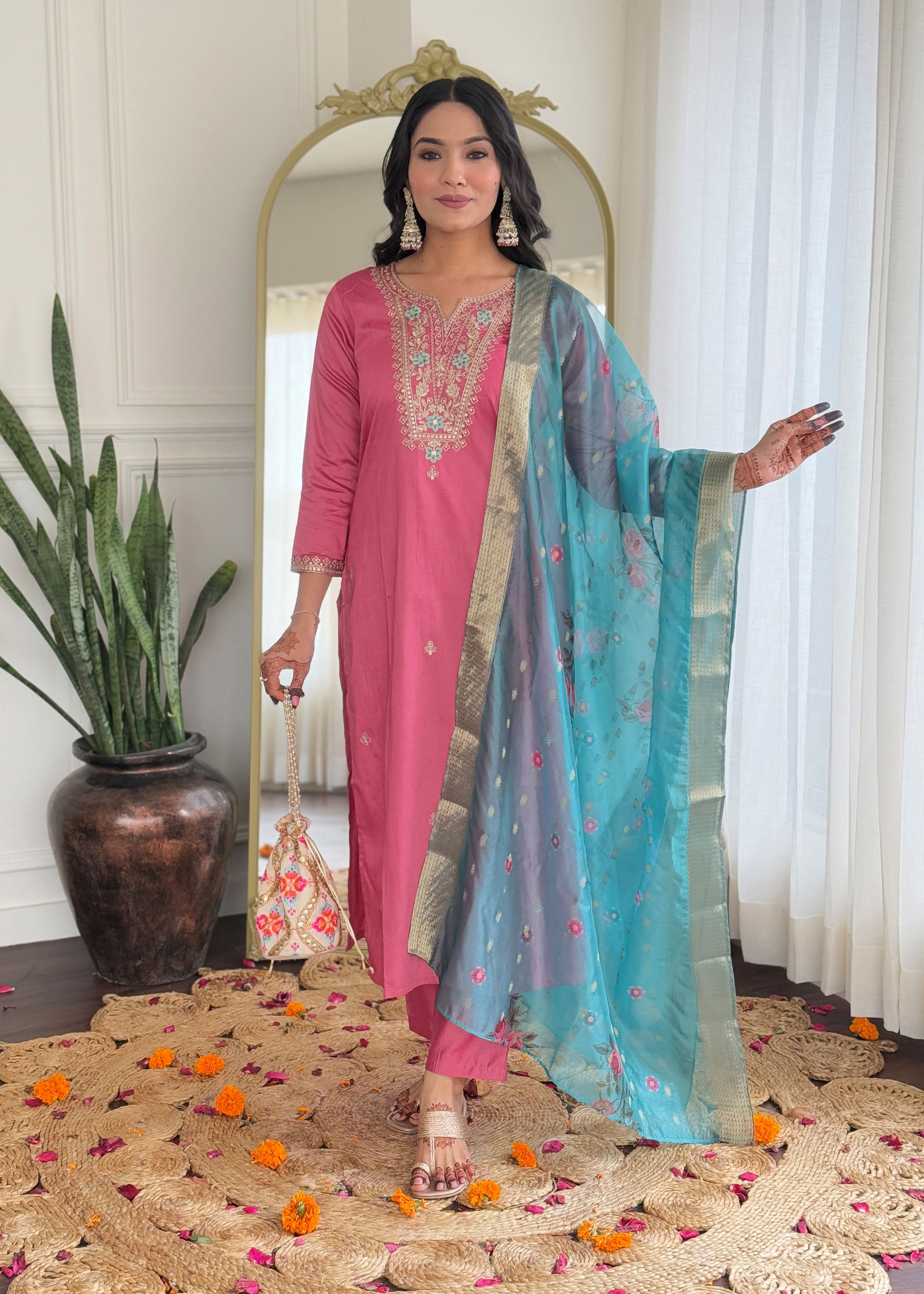 The kurta features a graceful V neckline and 3/4th sleeves, embellished with delicate embroidery work that adds a refined touch of artistry. Coordinated viscose silk pants in the same gajri shade ensure a seamless and elegant silhouette. Completing the ensemble is a jacquard dupatta, adding depth and texture with its woven patterns while maintaining the monochromatic sophistication of the outfit.