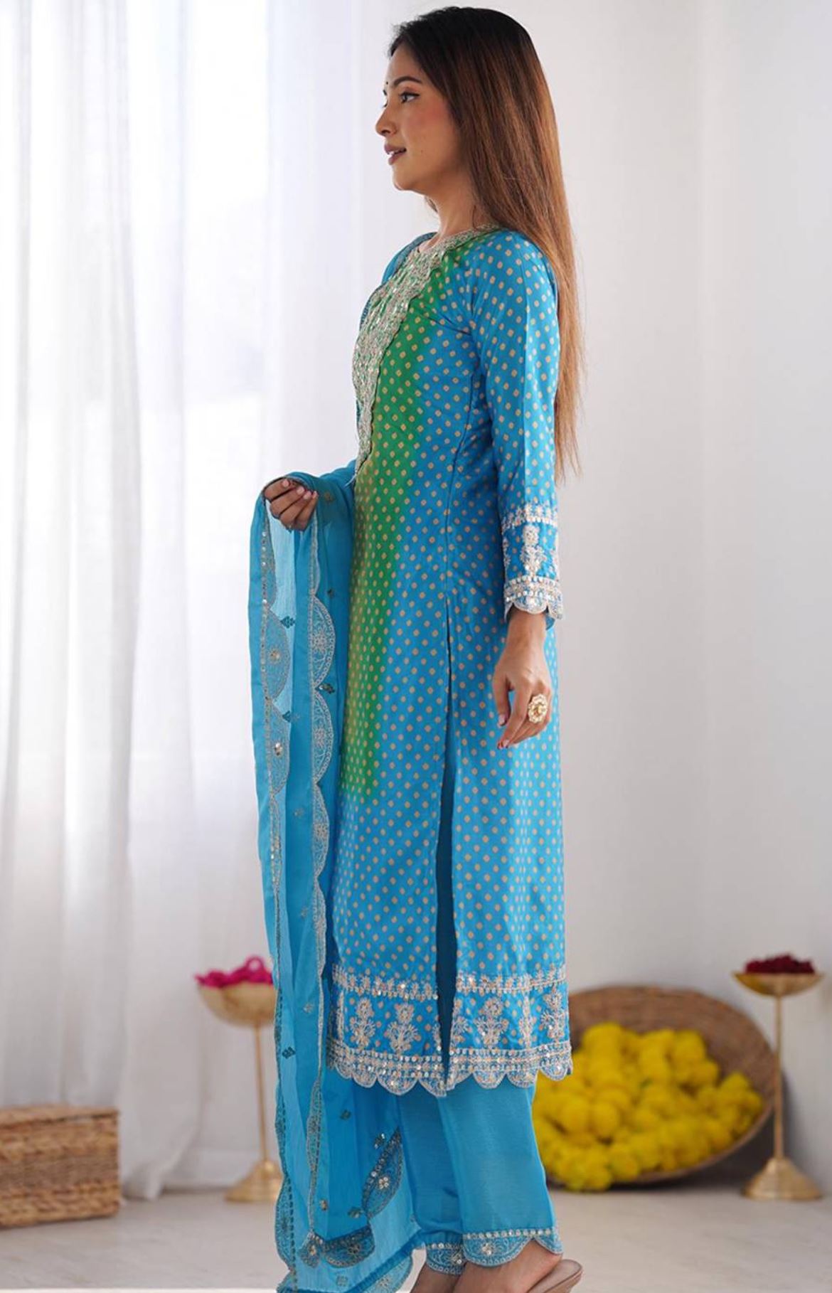 Green & Aqua Blue Pure Chinon Kurta Pant with Heavy Thread Embroidery Work