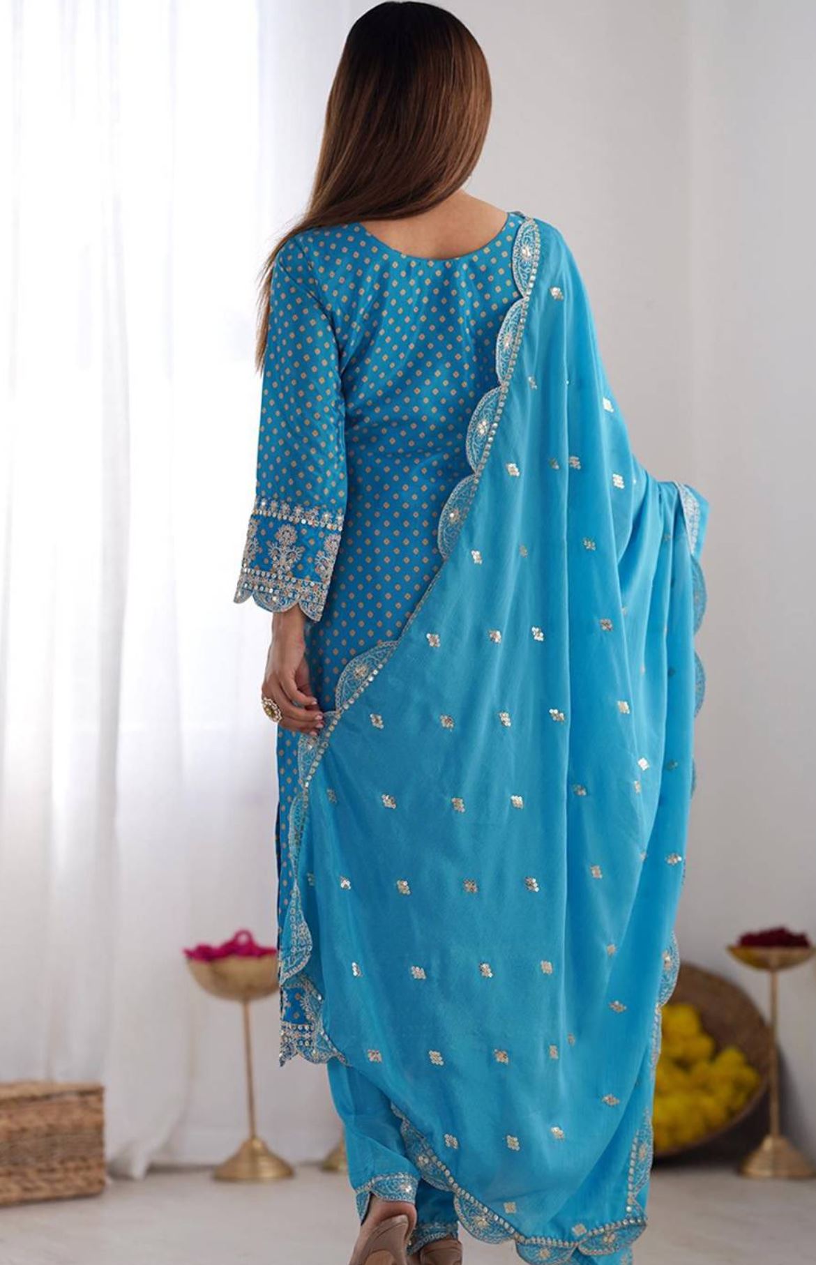 The bottom is crafted in breathable viscose rayon in a soothing aqua blue shade, designed for comfort without compromising on grace. Paired with a pure chinon dupatta in a matching aqua blue tone, this ensemble balances softness and structure, giving you a complete look that's effortlessly chic. The lightweight dupatta flows with ease, making it a graceful accessory that enhances the overall outfit.
