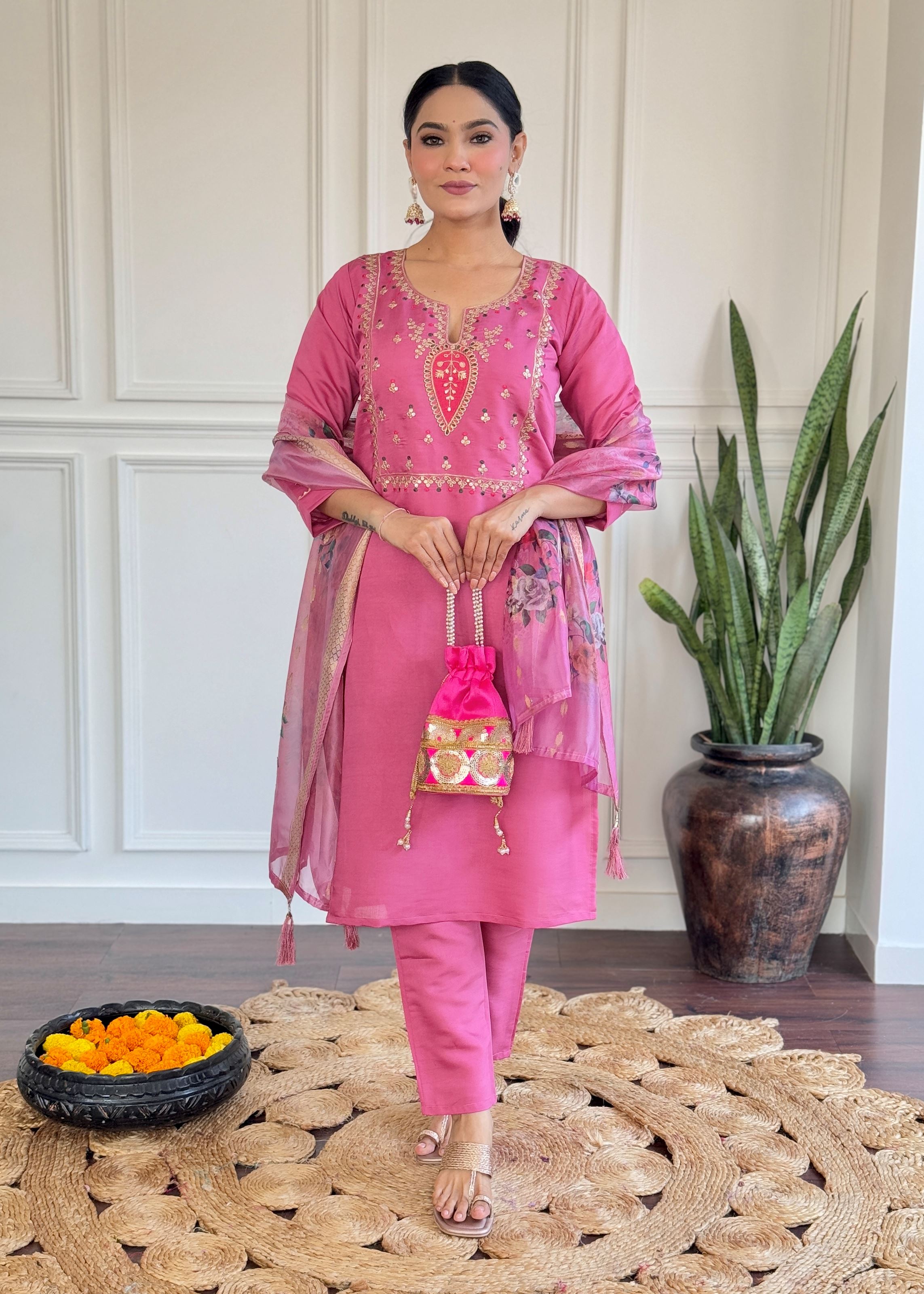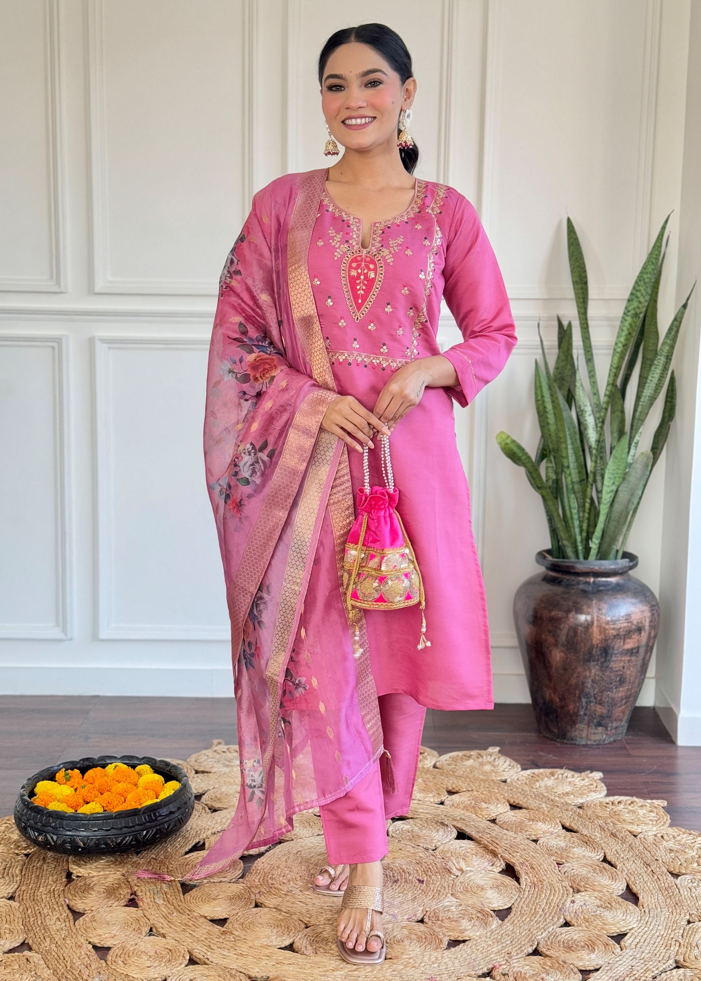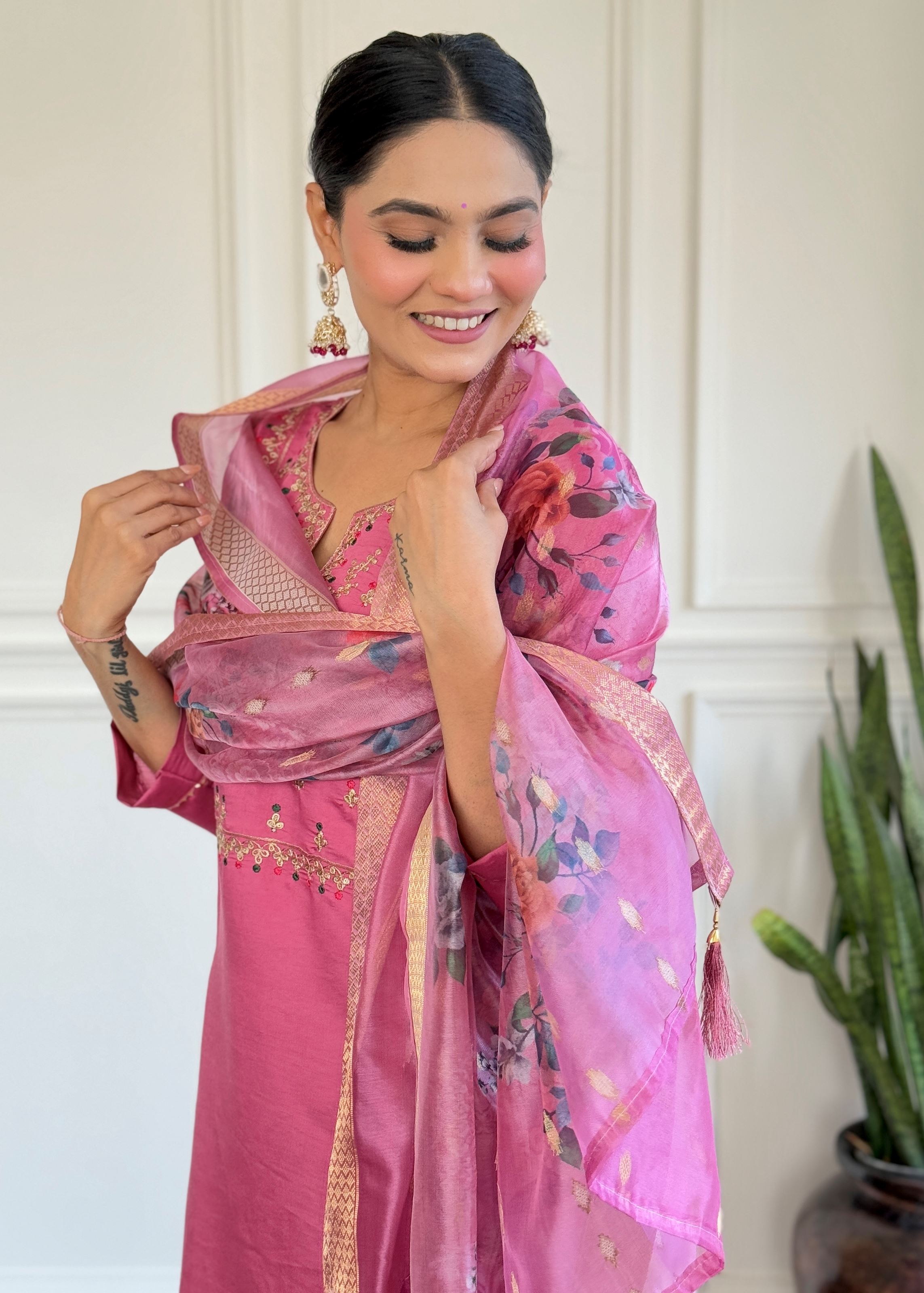 Hot Pink Viscose Chanderi Kurta Pant Set With Embroidery Work