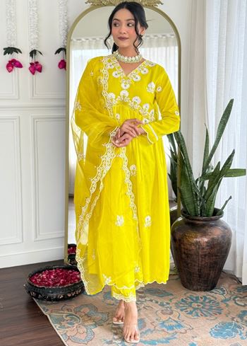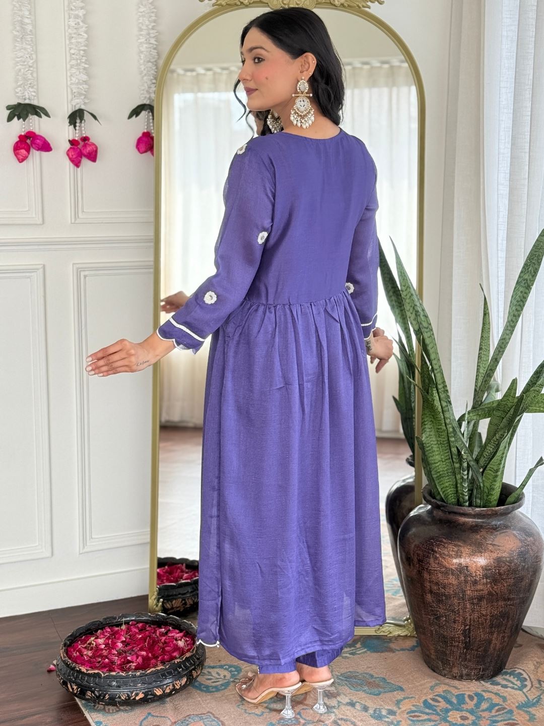 The matching lavender Vichitra Silk pants provide a sleek, comfortable fit, while the lightweight organza dupatta brings a sheer, flowy finish to the ensemble. Perfect for daytime functions, festive gatherings, or elegant celebrations, this set is both refined and wearable. The monochrome palette ensures a cohesive look, making accessorizing simple and styling effortless.