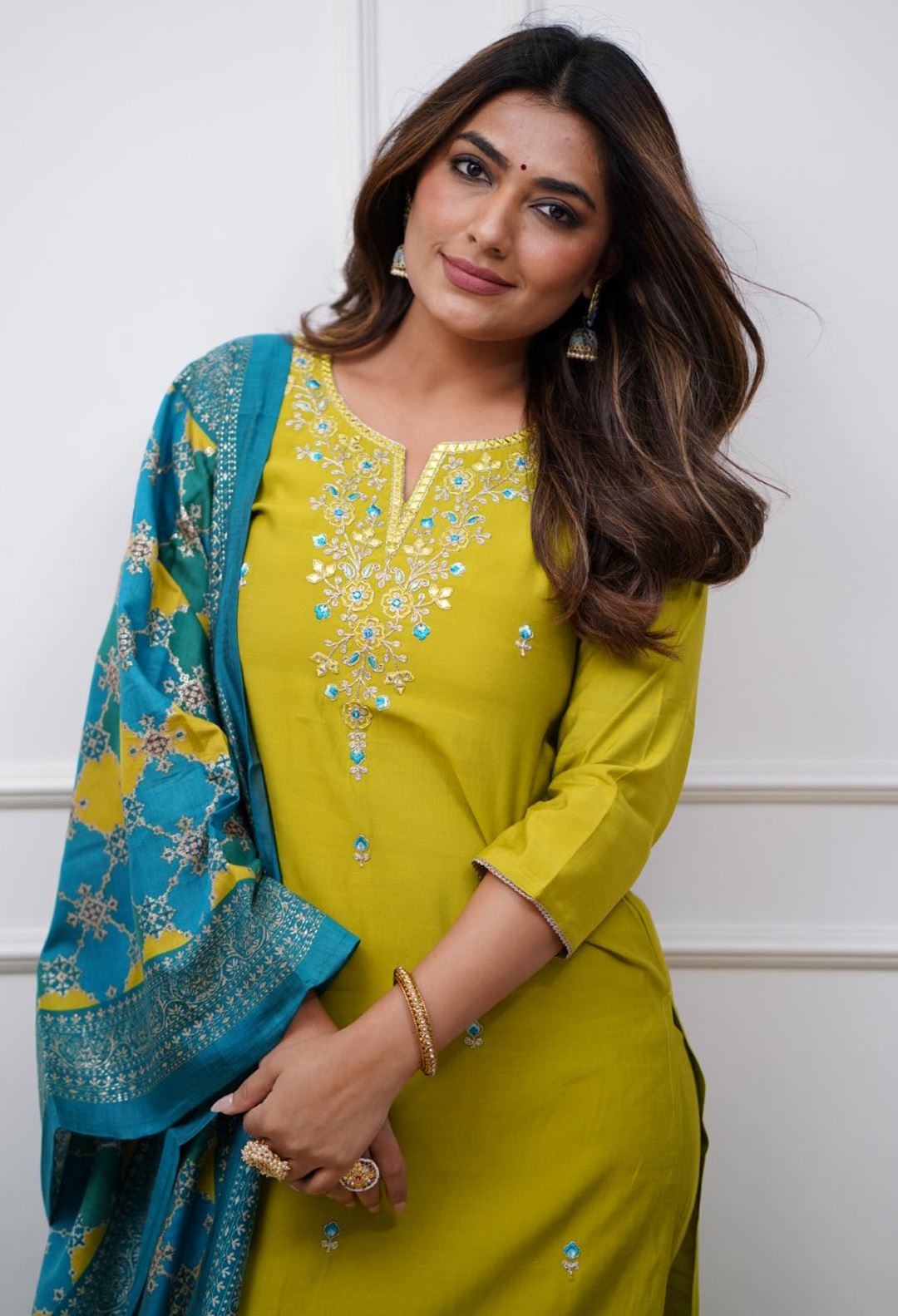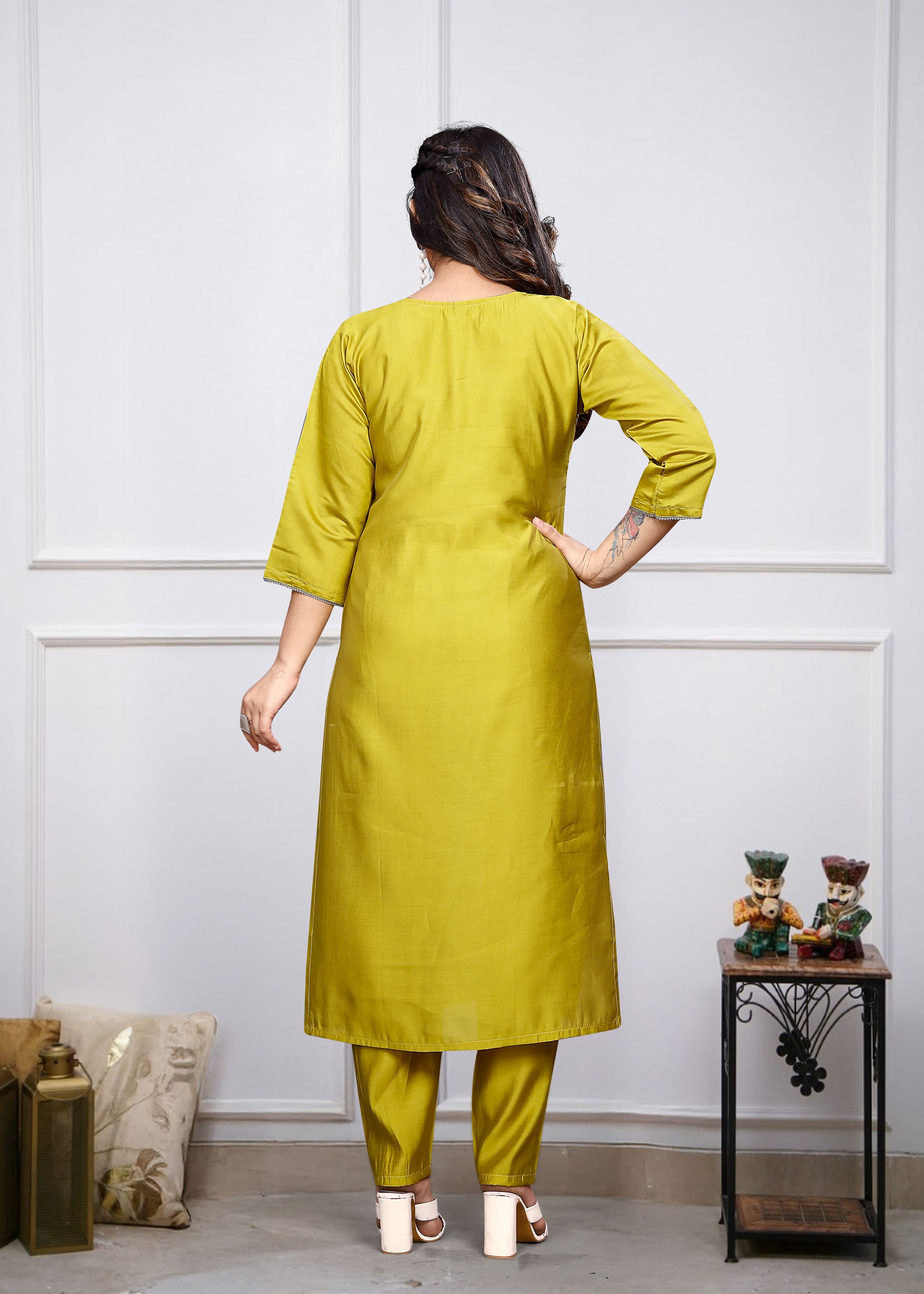 Lemon Kurta Pant Set with Heavy Thread Embroidery Work With Printed Dupatta