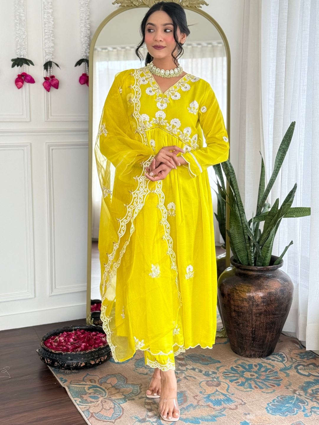 Paired with matching lemon Vichitra Silk pants, the outfit offers a streamlined, flattering fit that enhances the overall silhouette. To complete the look, the lightweight organza dupatta in the same vibrant shade adds a sheer, graceful layer that drapes effortlessly. Together, this three-piece ensemble creates a statement look that is both modern and rooted in tradition.