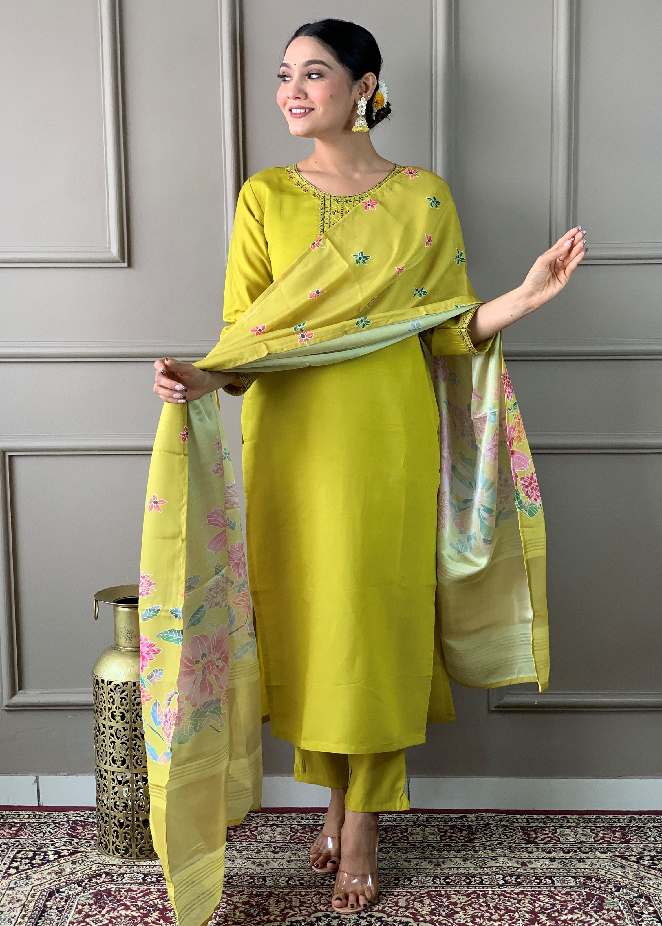 Lemon Viscose Chanderi Kurta Pant With Heavy Thread Embroidery Work With Printed Dupatta