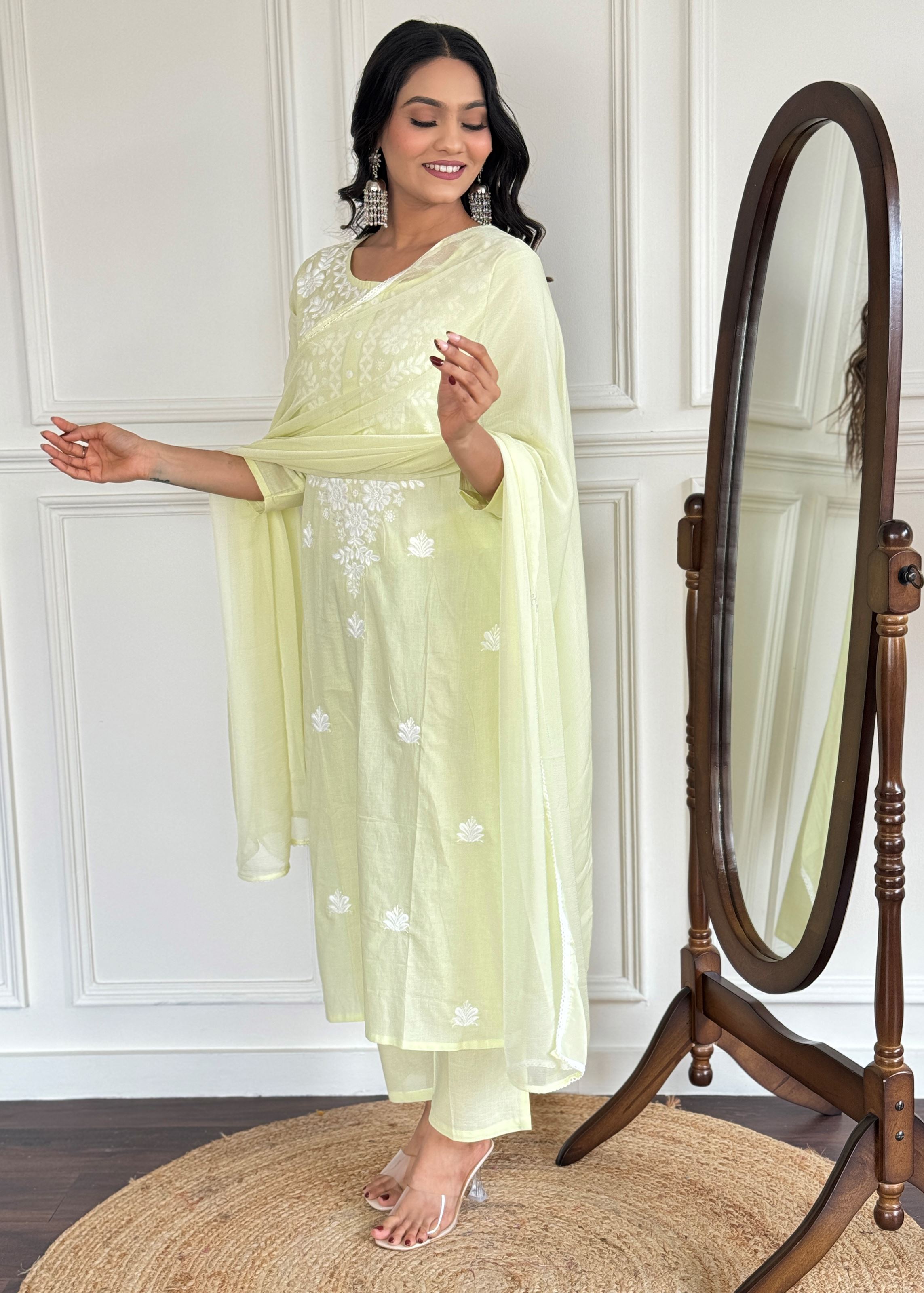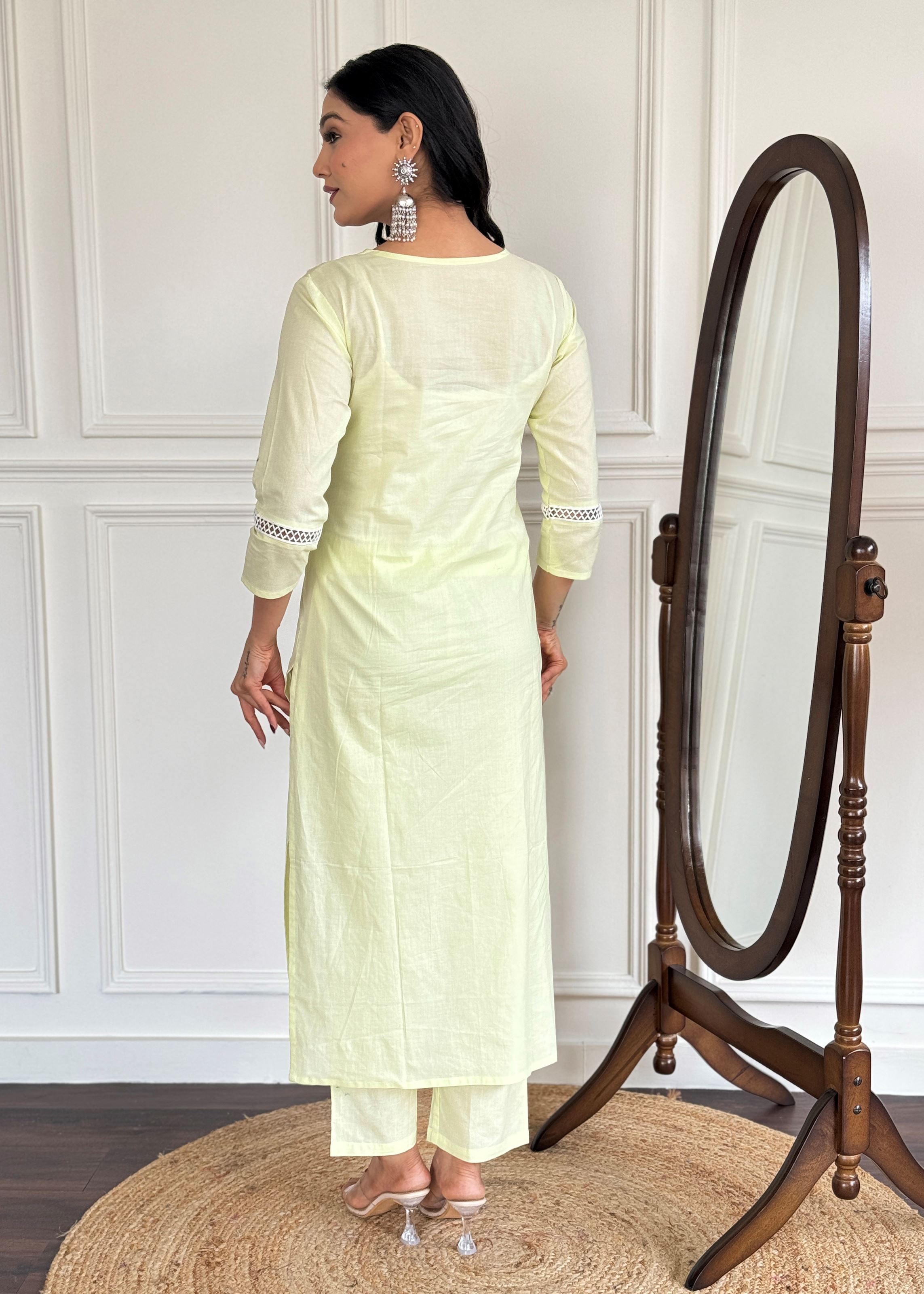 Light Yellow Cotton Elegant Kurta Pant Set With Chikankari Work