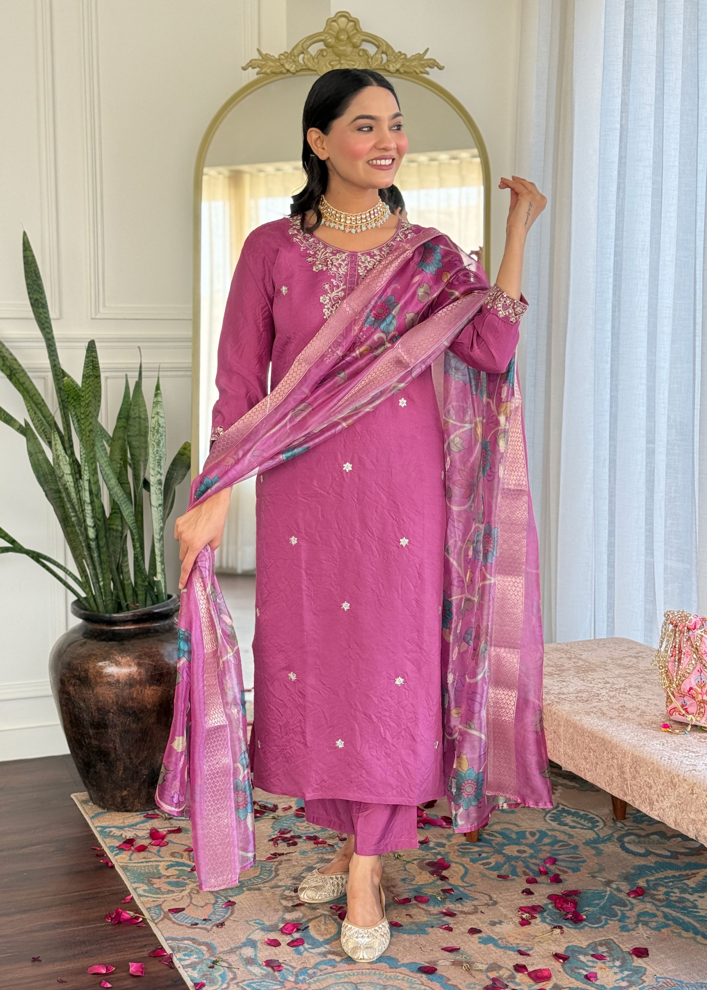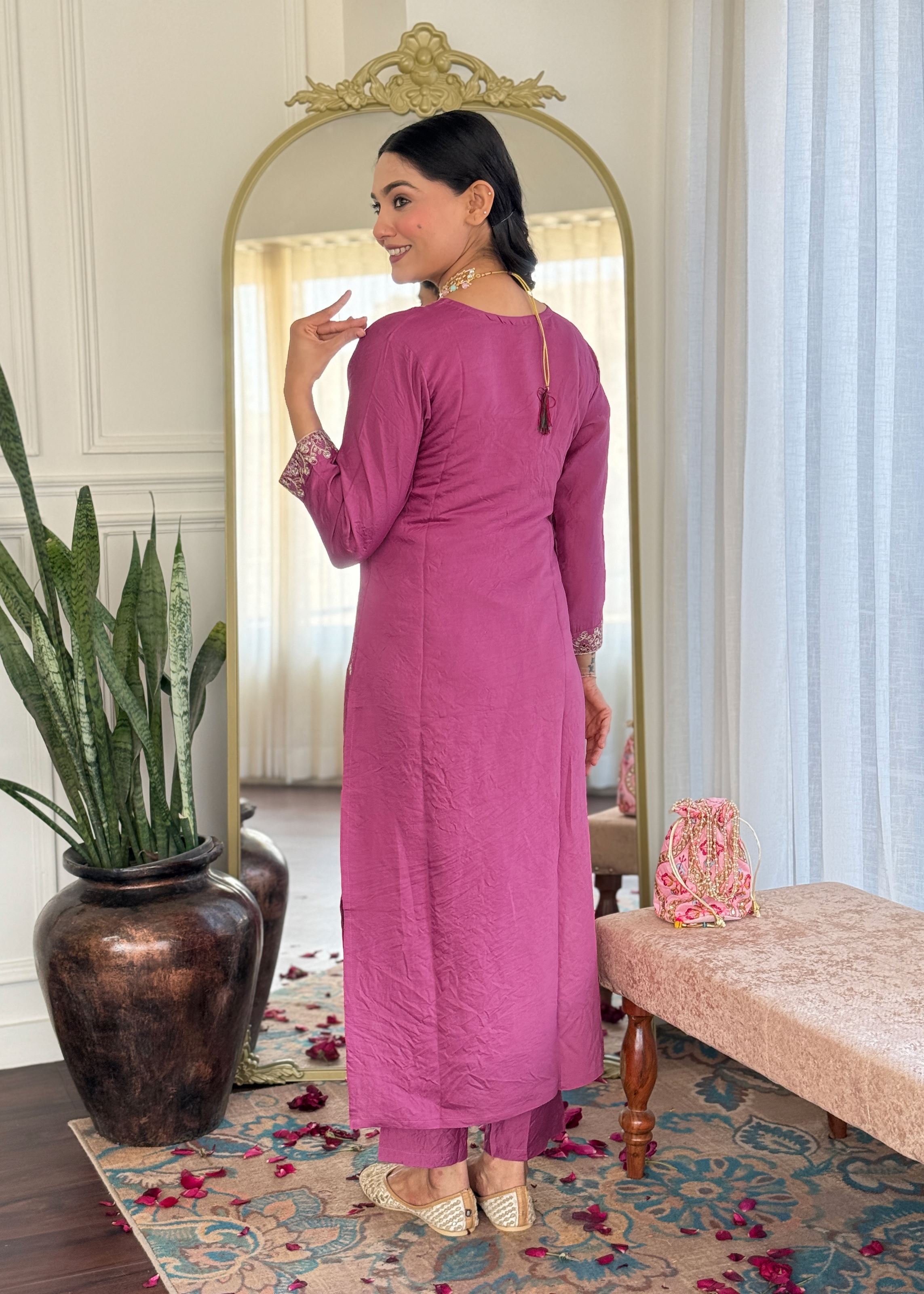 Magenta Viscose Chanderi Kurta Pant With Embroidery Work And Printed Dupatta