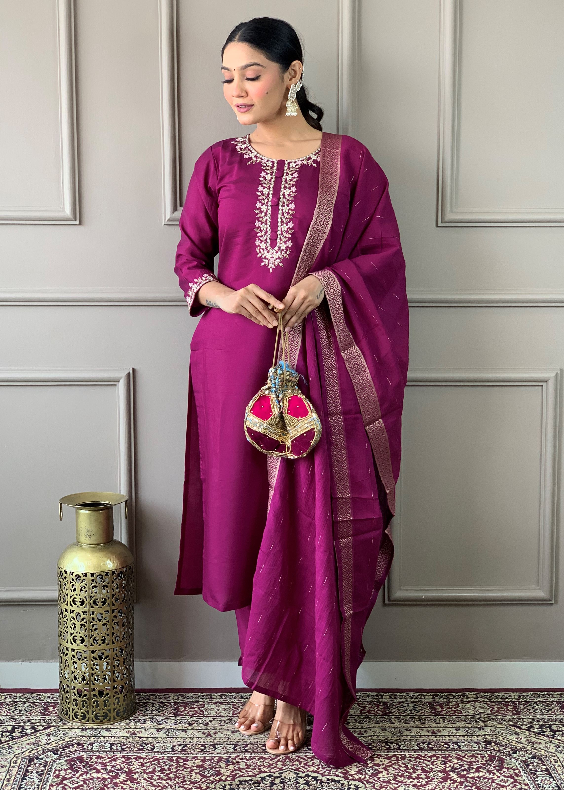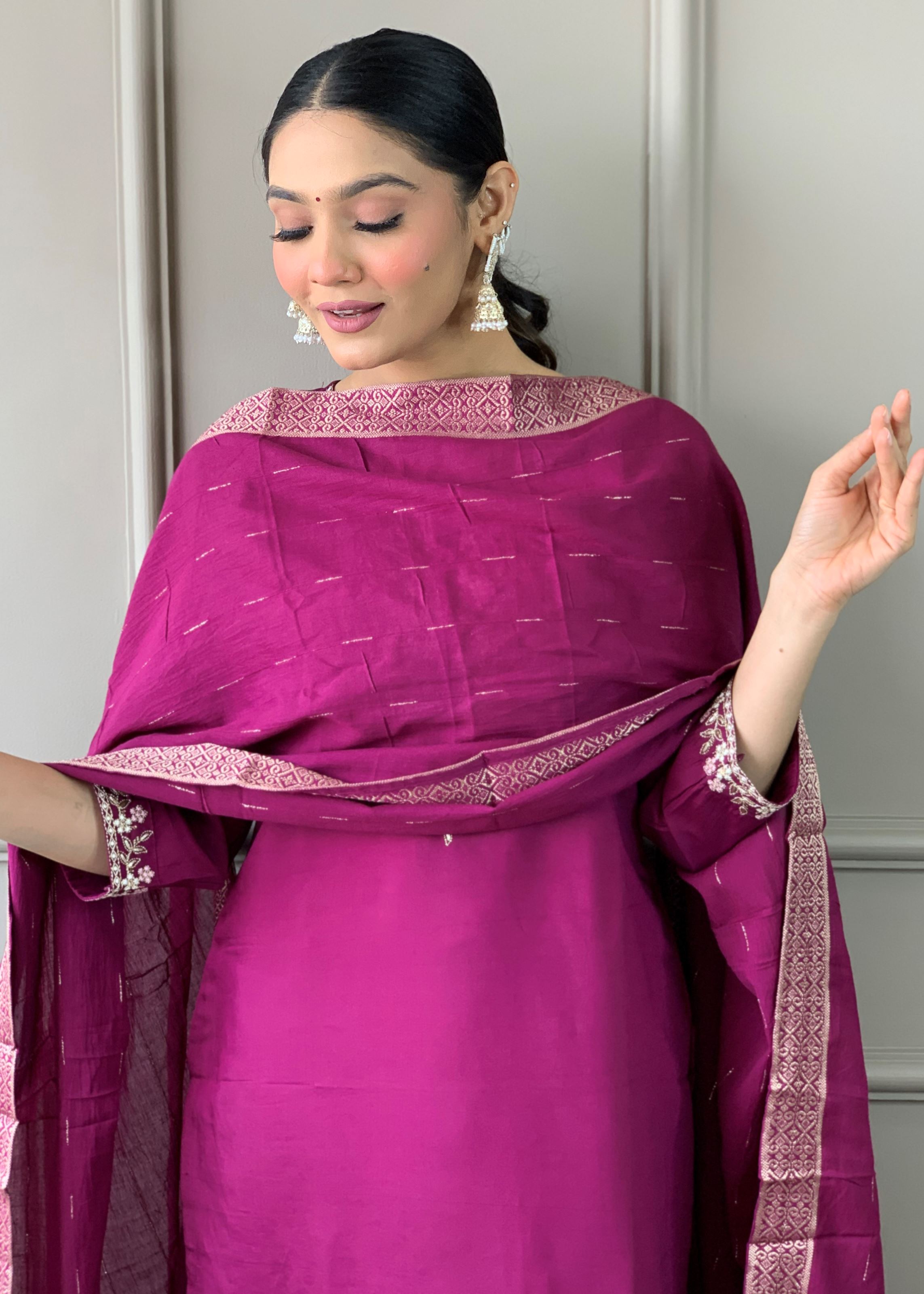 Magenta Viscose Chanderi Kurta Pant With Heavy Thread Embroidery Work