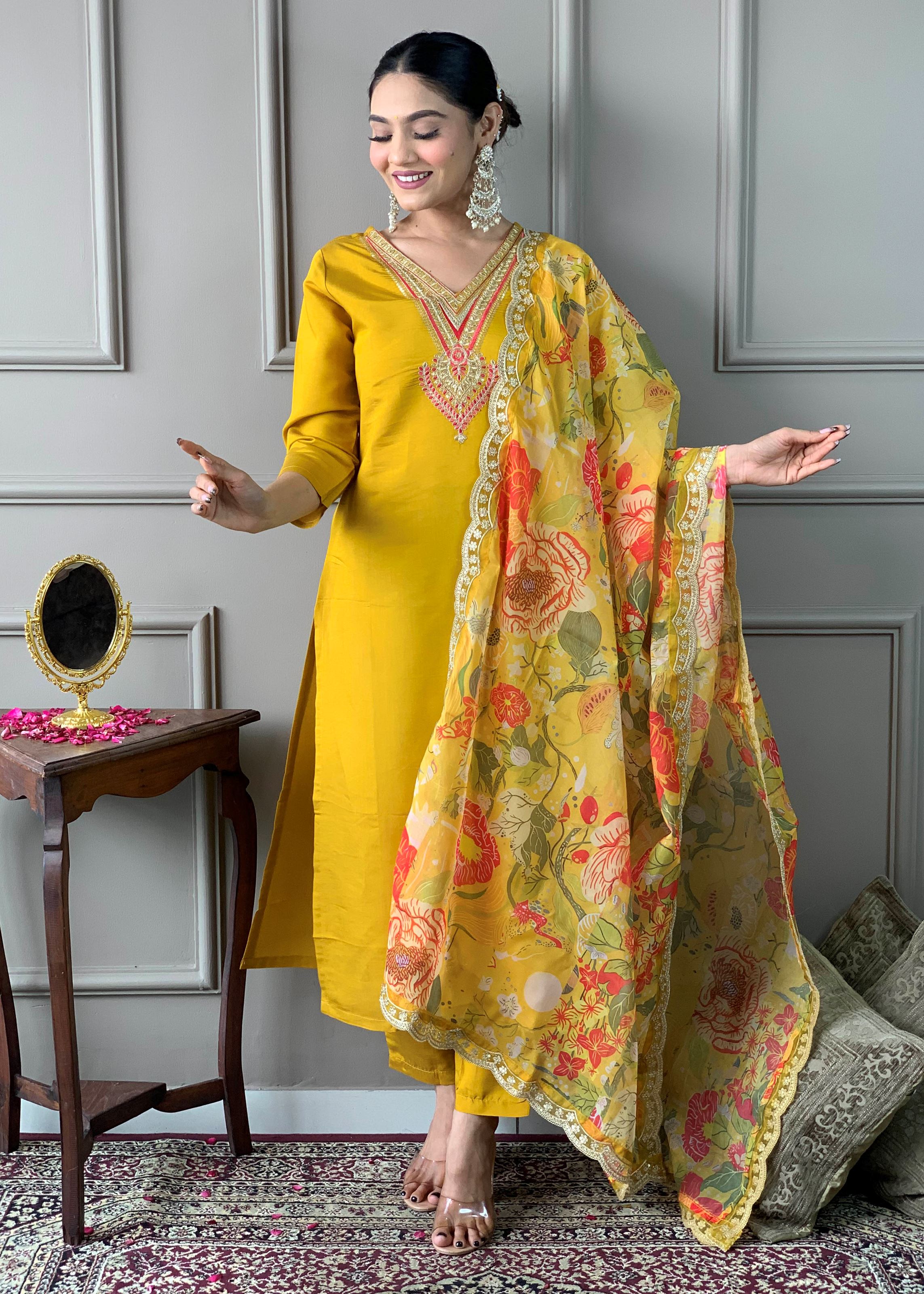 This kurta features refined embroidery work and a flattering V-neckline, paired with 3/4 sleeves to add a graceful touch. The set is beautifully completed with a lightweight organza dupatta in the same mustard tone, offering a delicate contrast and enhancing the overall sophistication. Whether you're attending a festive event or an elegant evening gathering, this outfit delivers a statement look with ease.