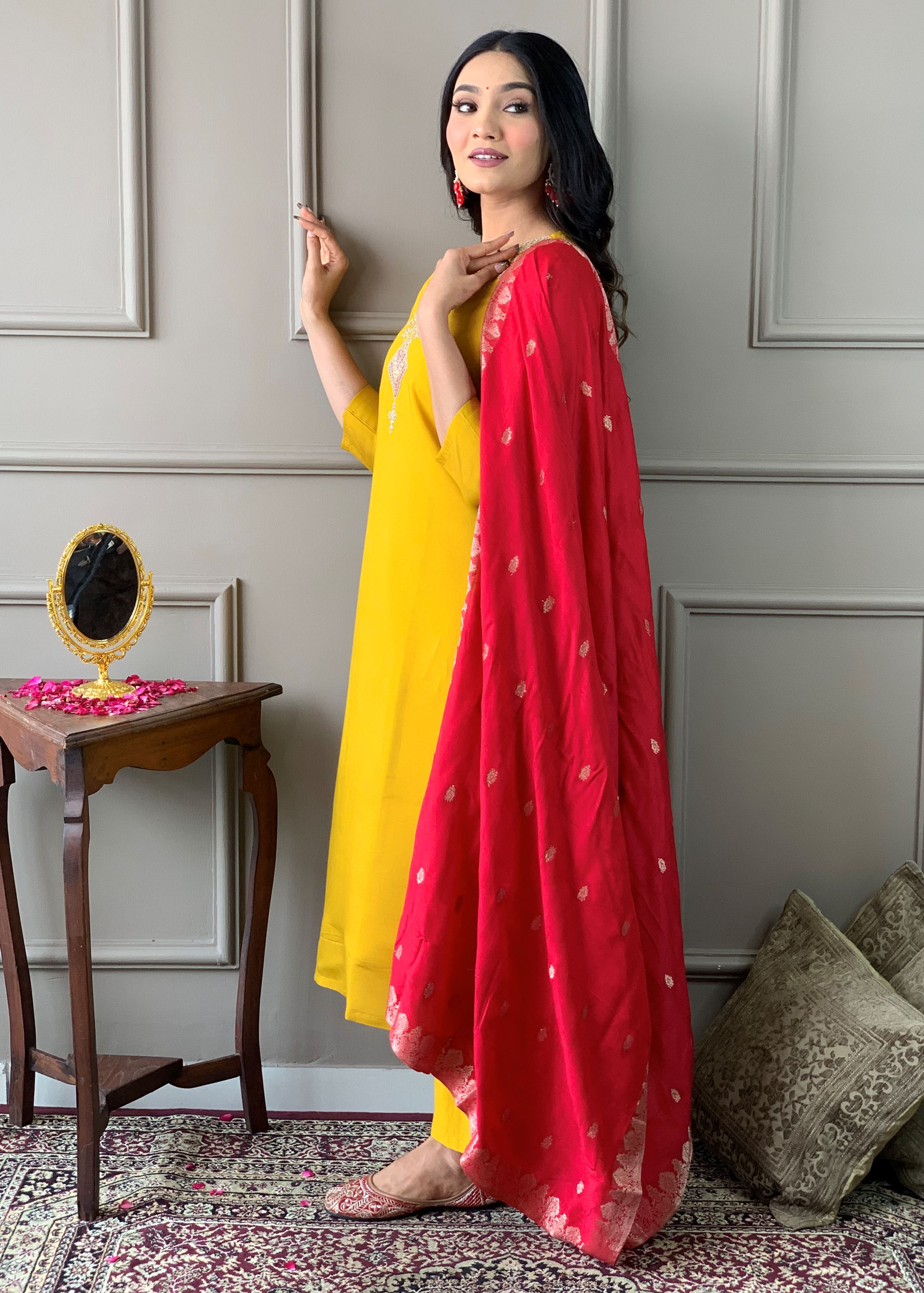 Mustard Chanderi Elegant Kurta Pant Set With Embroidery Work
