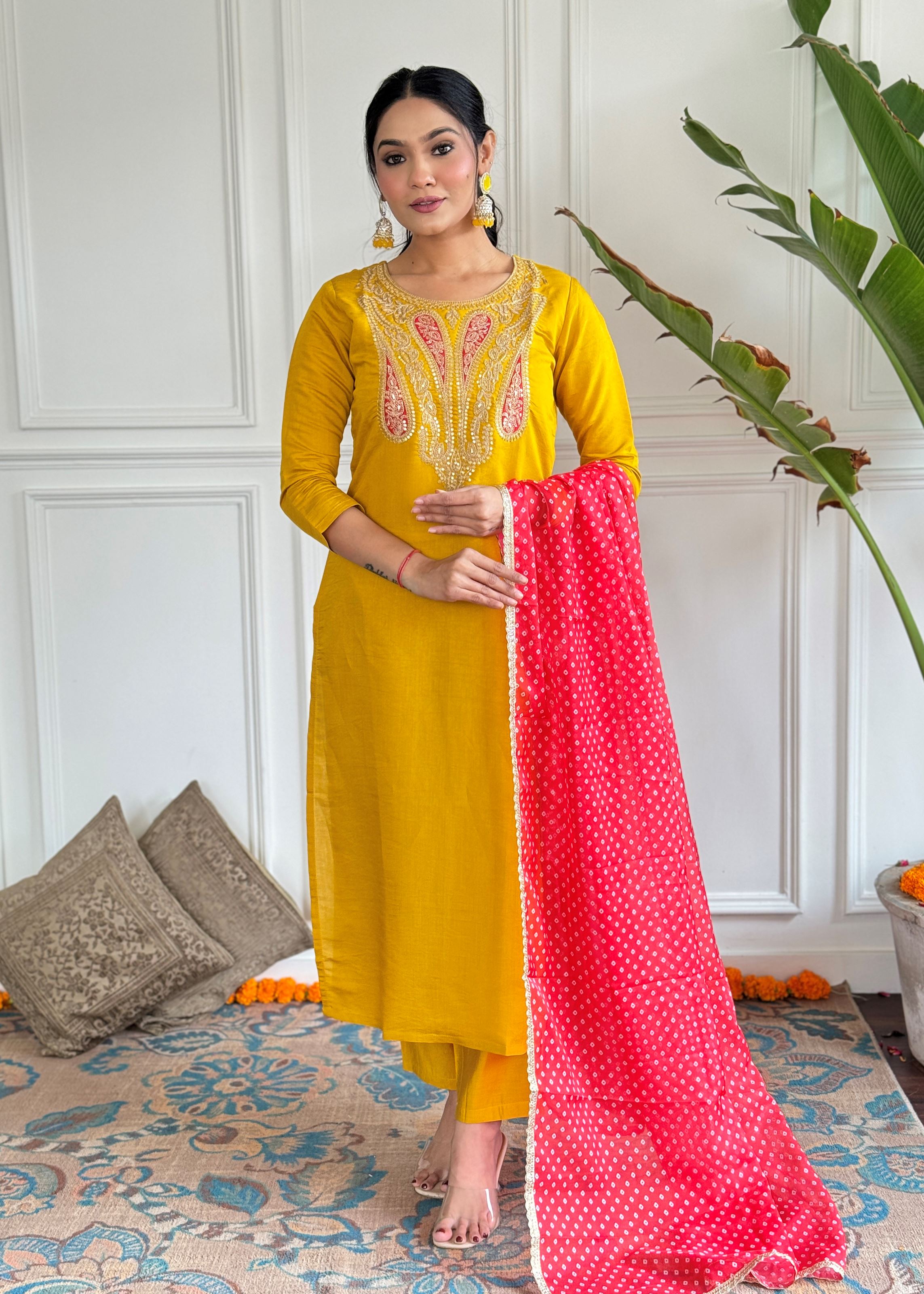 Mustard Chanderi Elegant Kurta Pant Set With Embroidery Work