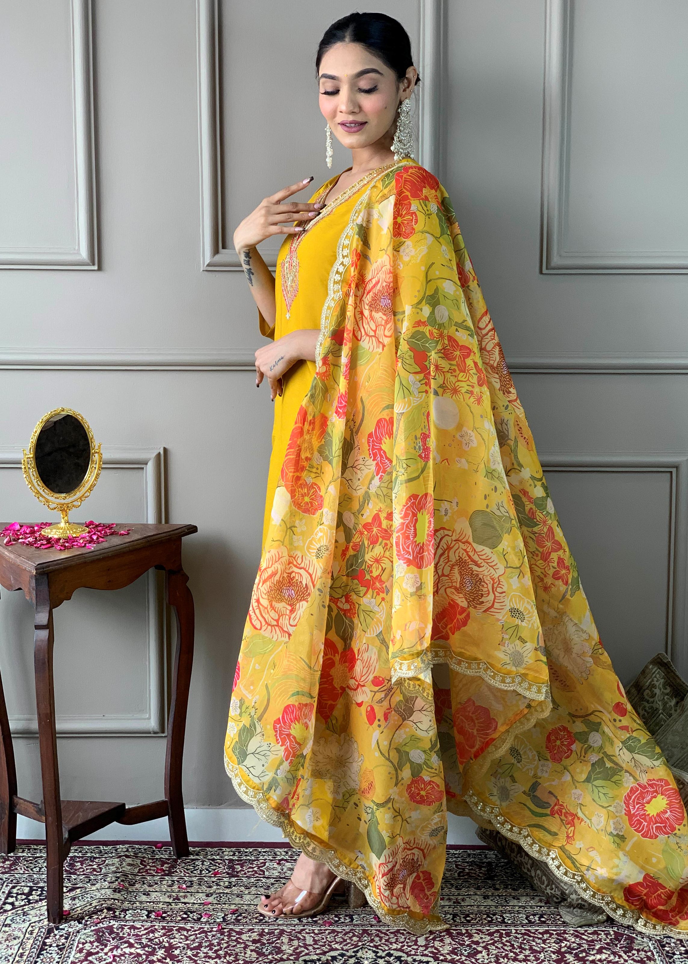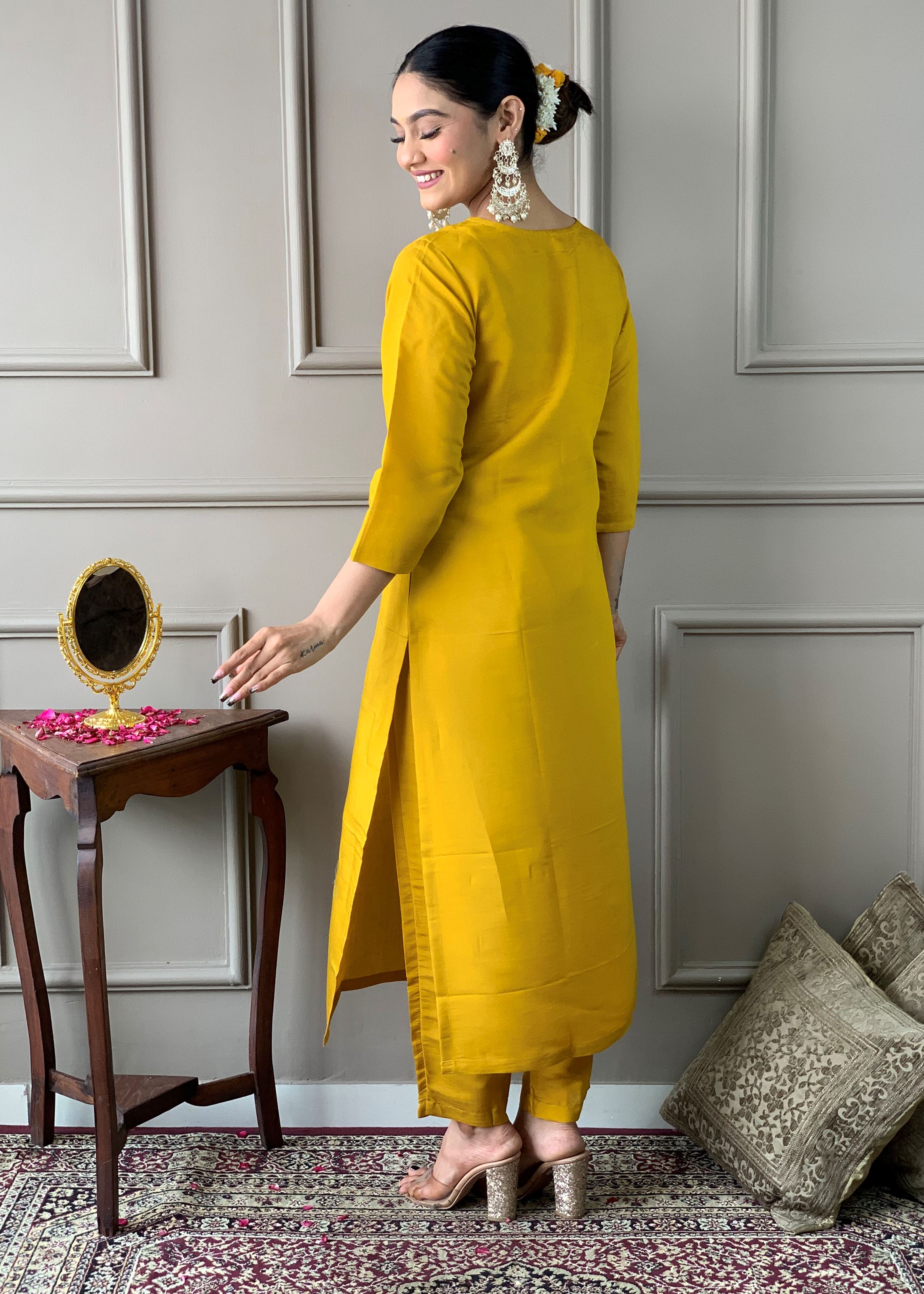 Mustard Chanderi Kurta Pant with Heavy Thread Embroidery Work With Printed Dupatta