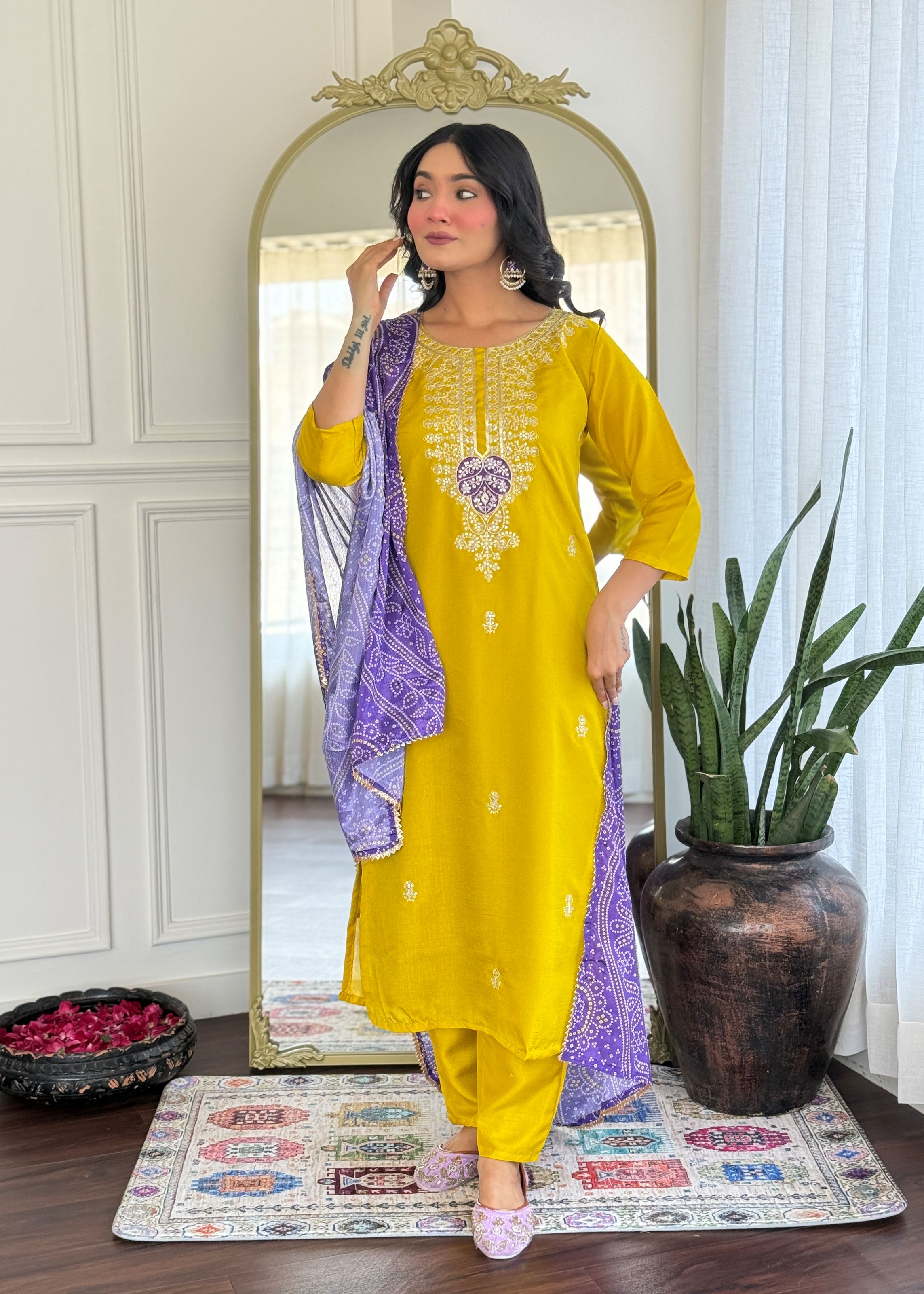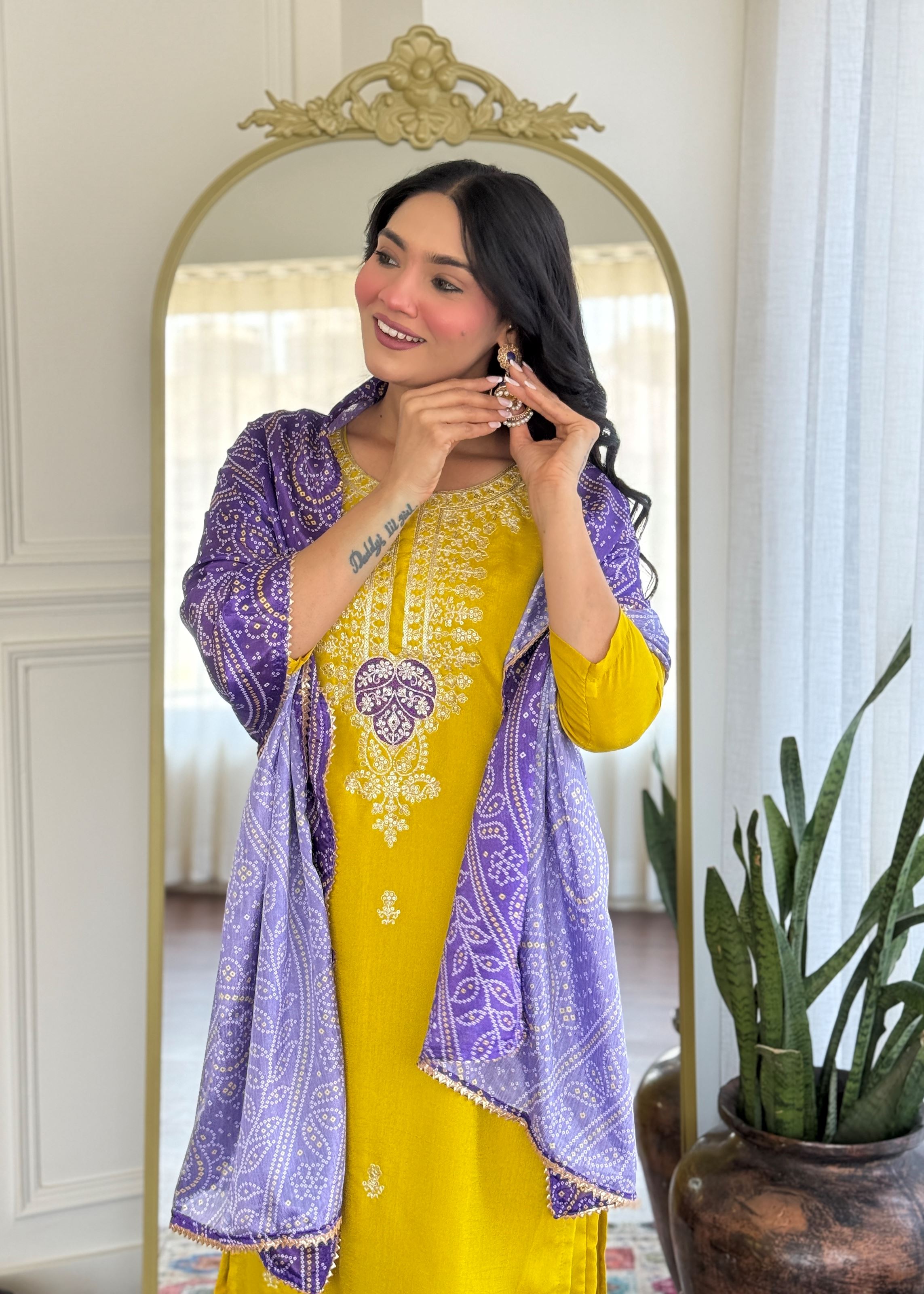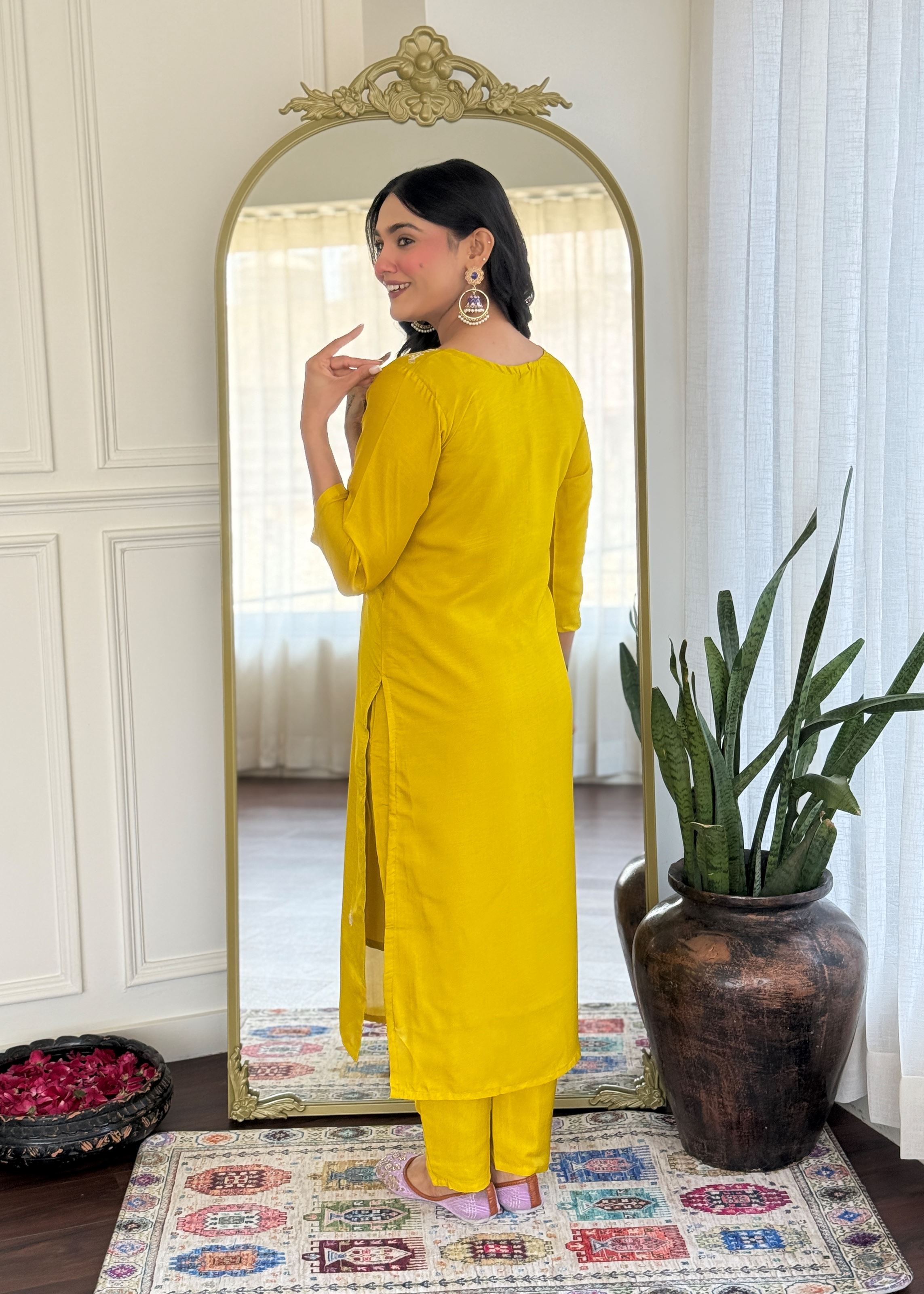 Mustard Kurta Pant Set with Heavy Thread Embroidery Sequins Work & Printed Dupatta