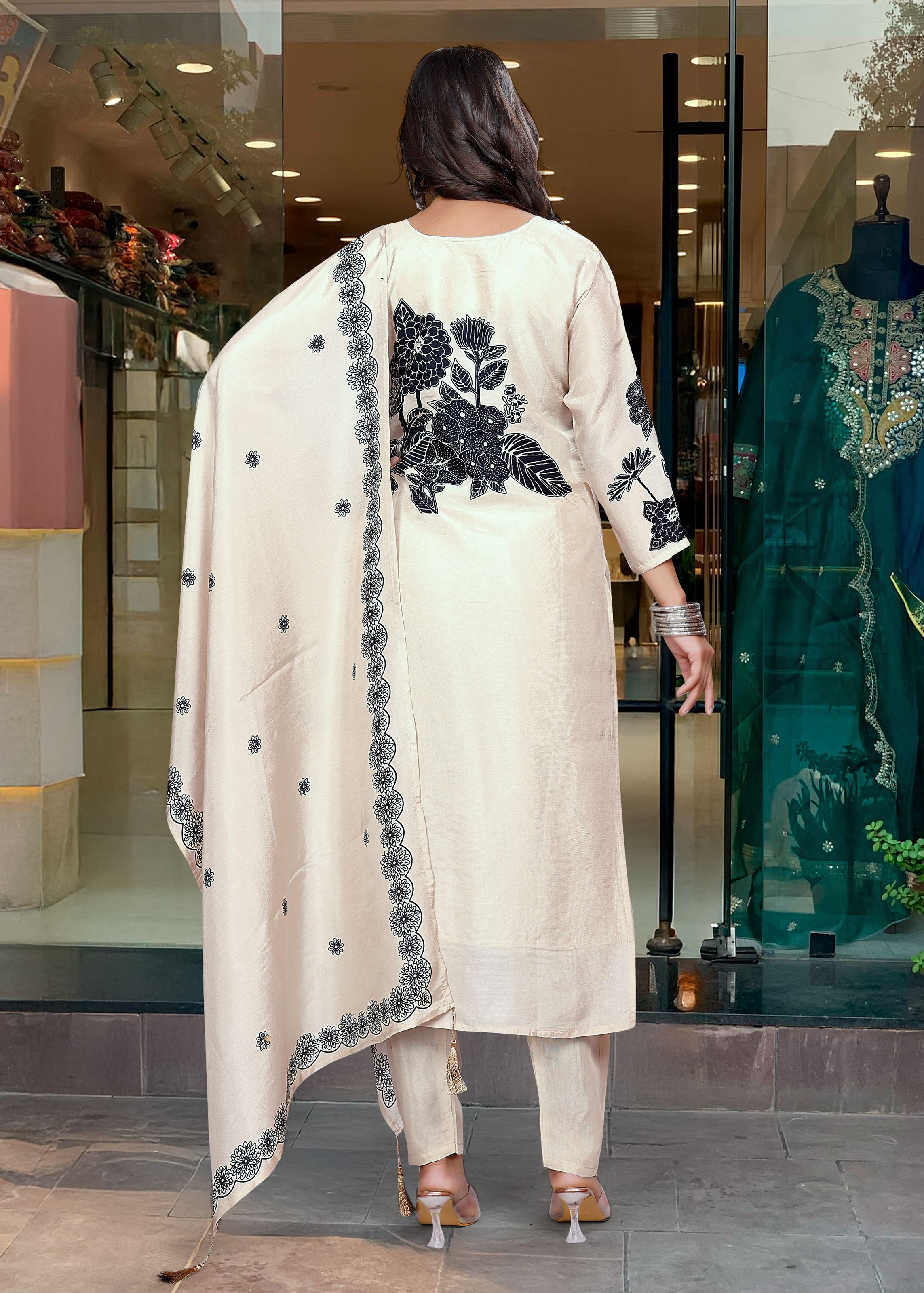 Off White Chinnon Silk Kurta Pant With Print And Thread Embroidery Work