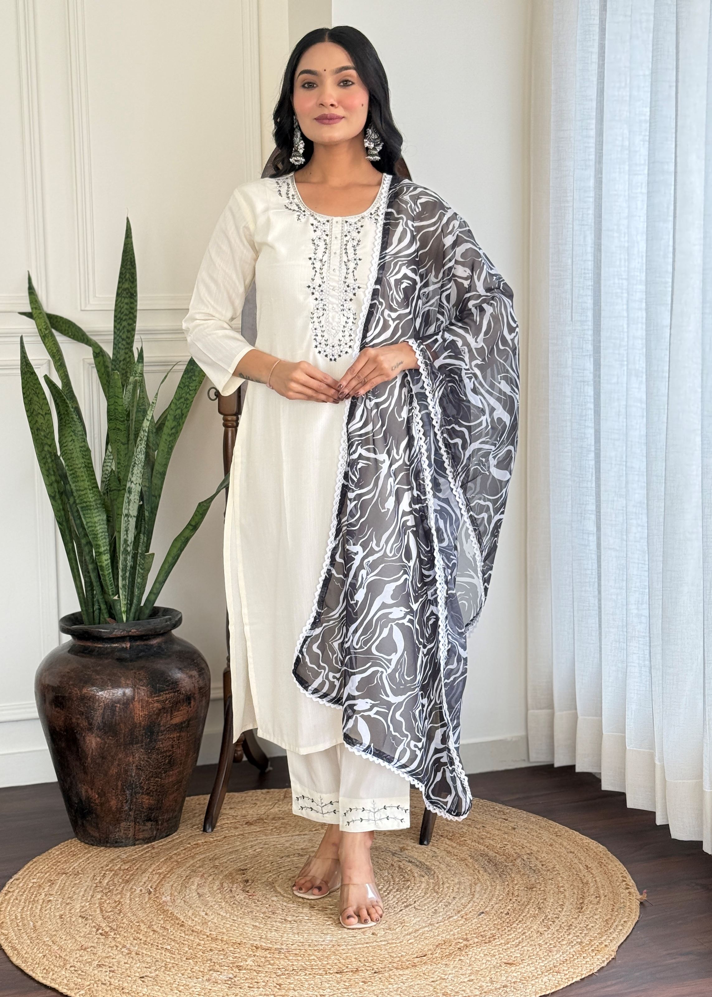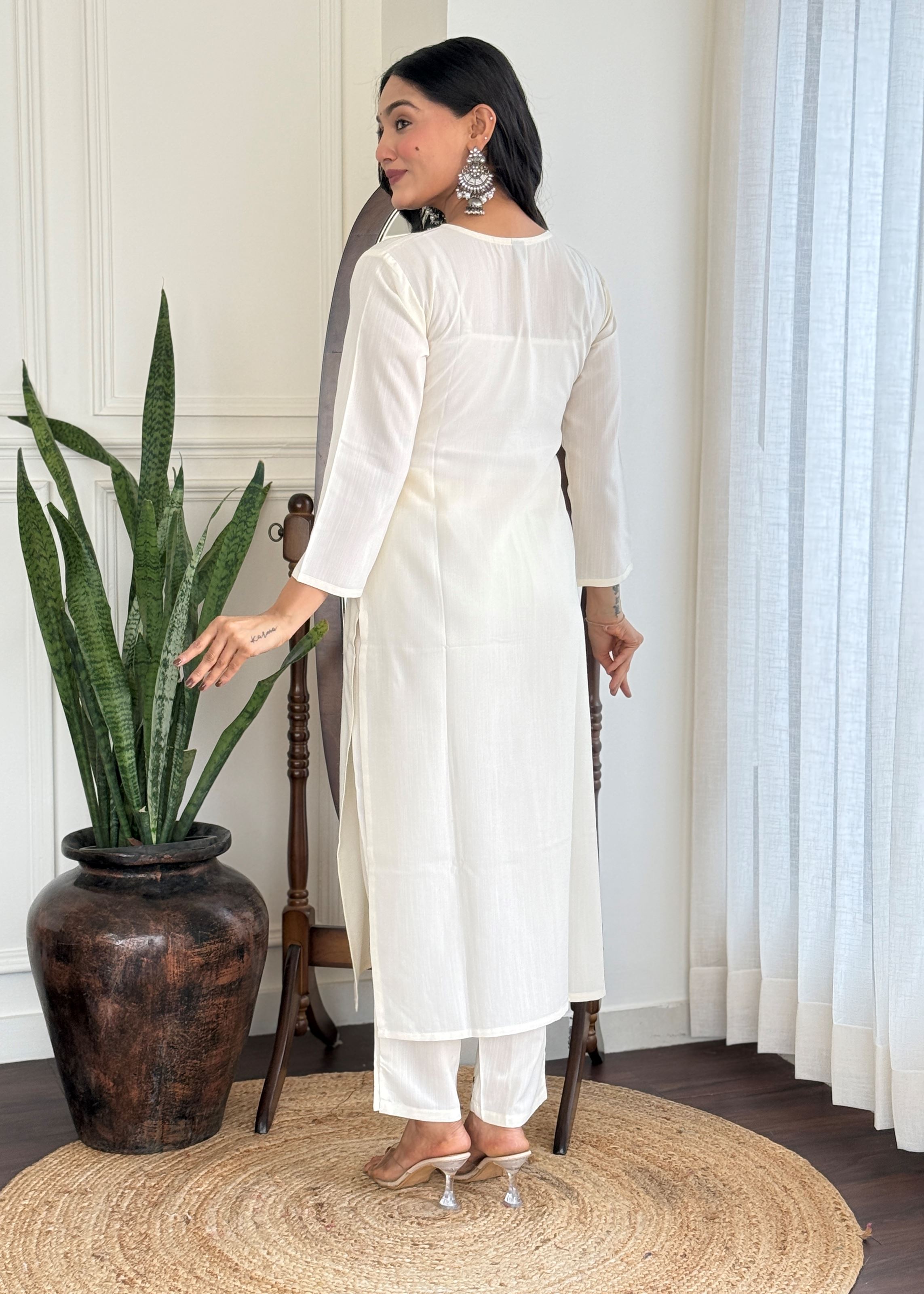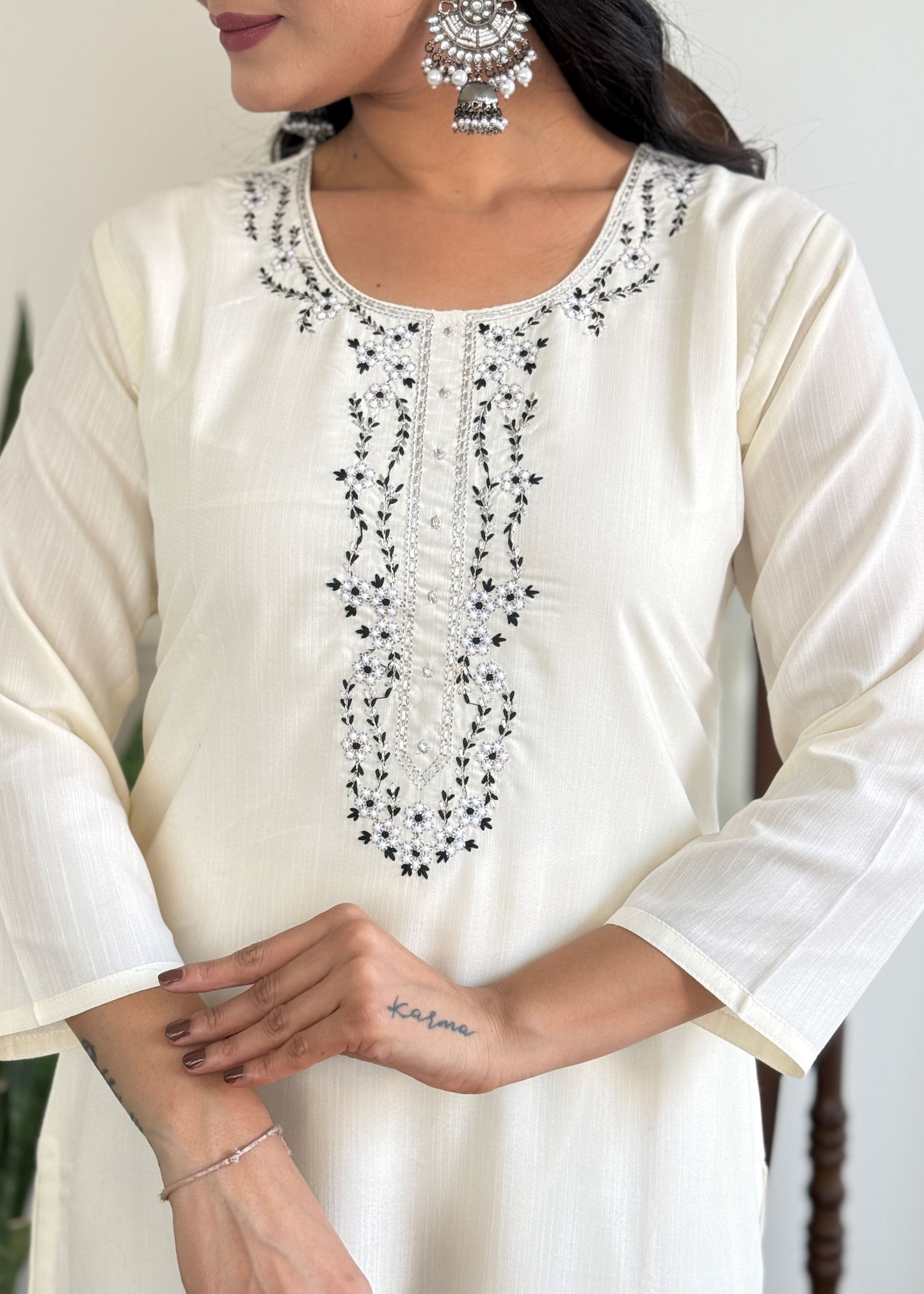 Off White Viscose Blend Rayon Kurta Pant Set With Embroidery Work