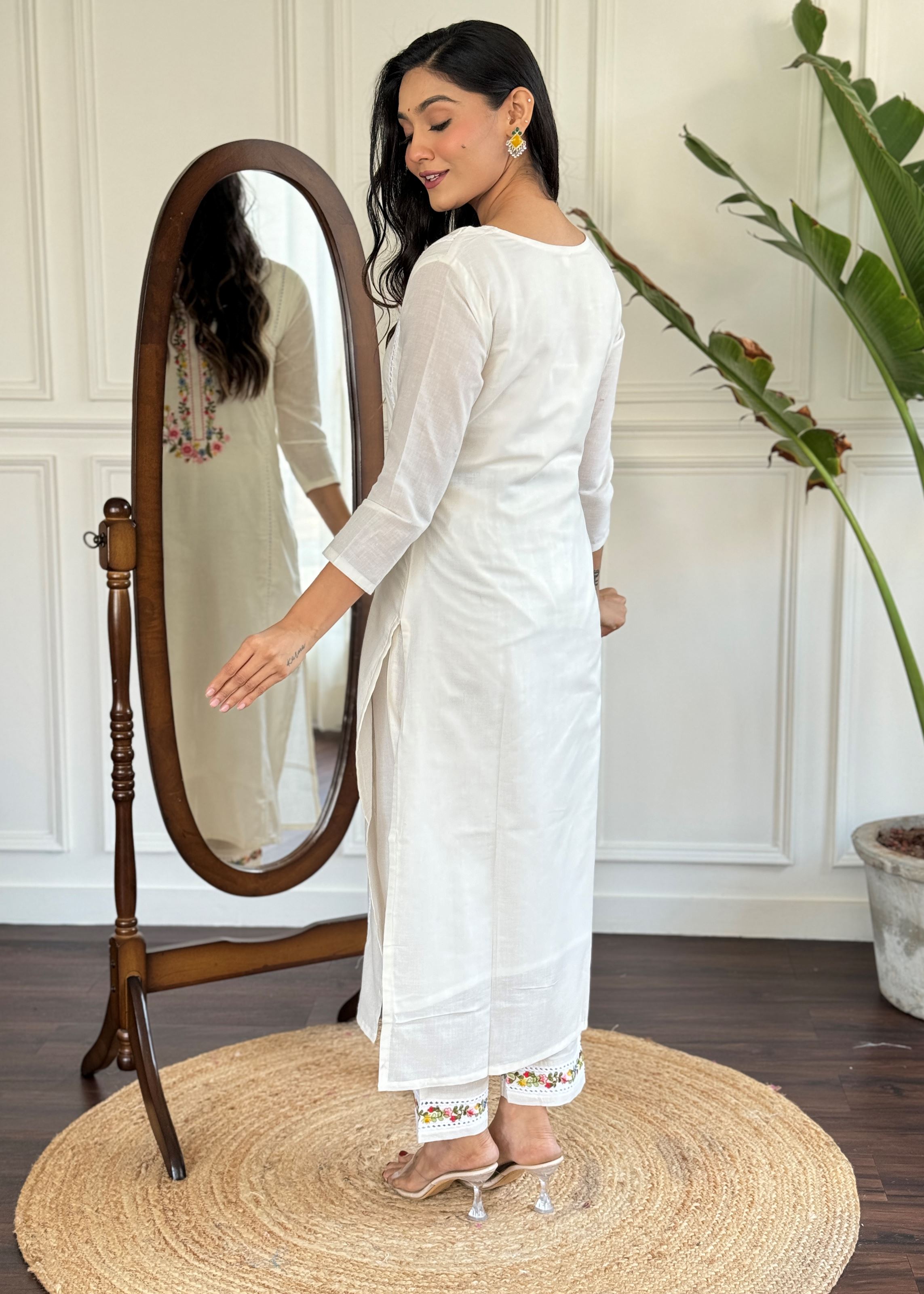 The coordinated viscose pants mirror the kurta’s minimal elegance, and the ensemble is elevated with a lightweight cotton dupatta in a matching off-white tone. The dupatta adds a touch of breezy sophistication, making the outfit perfect for warm climates and daytime events.