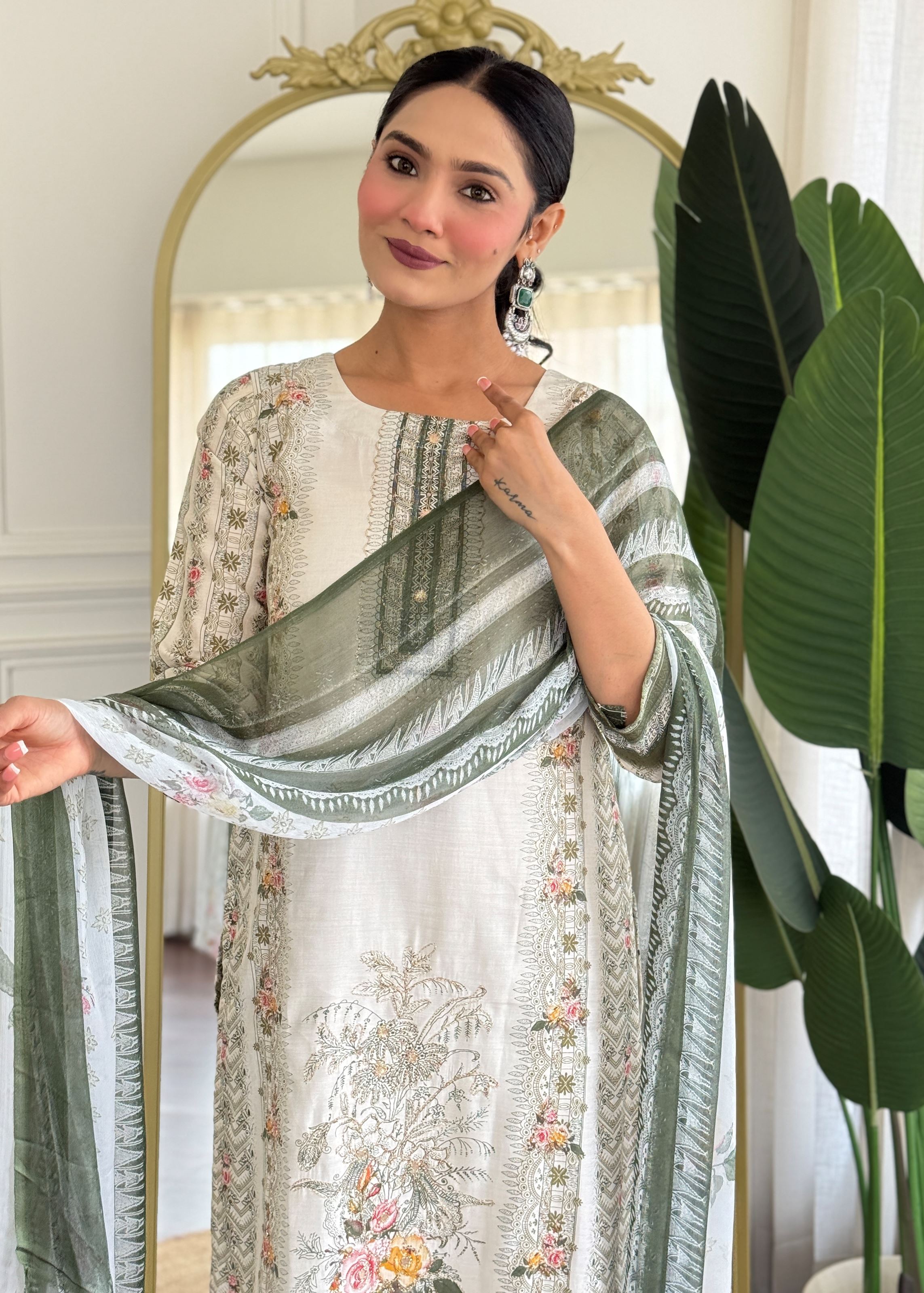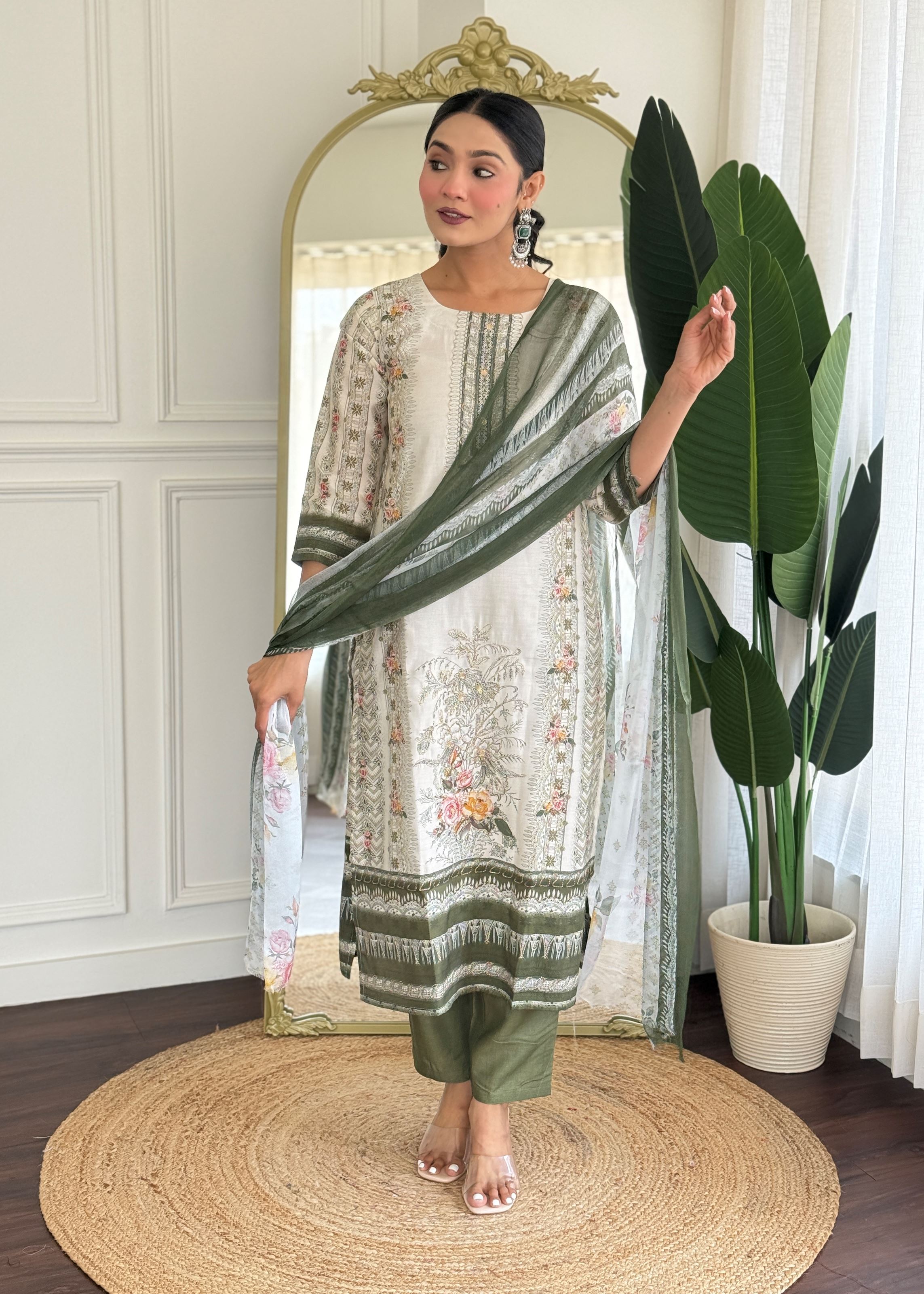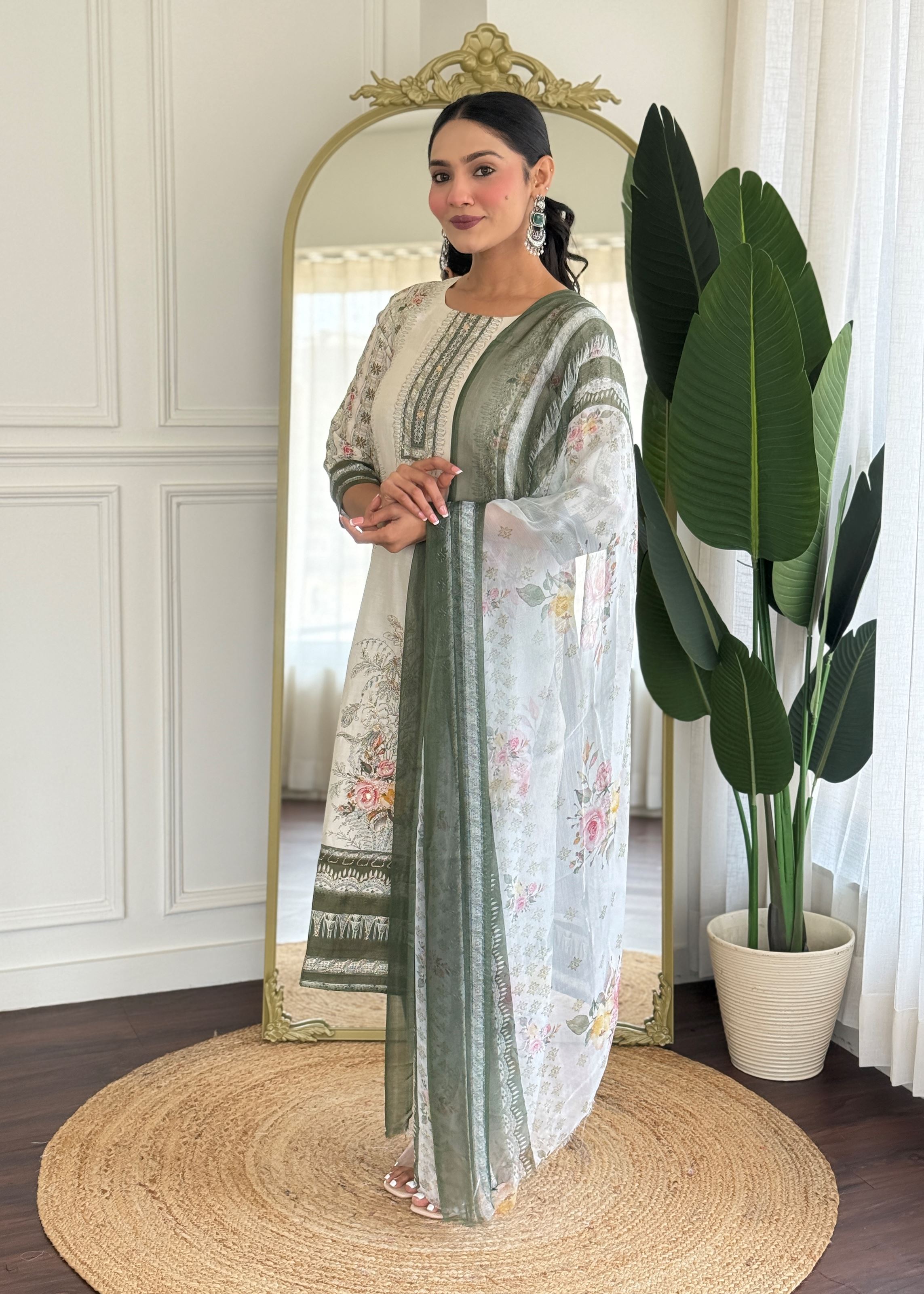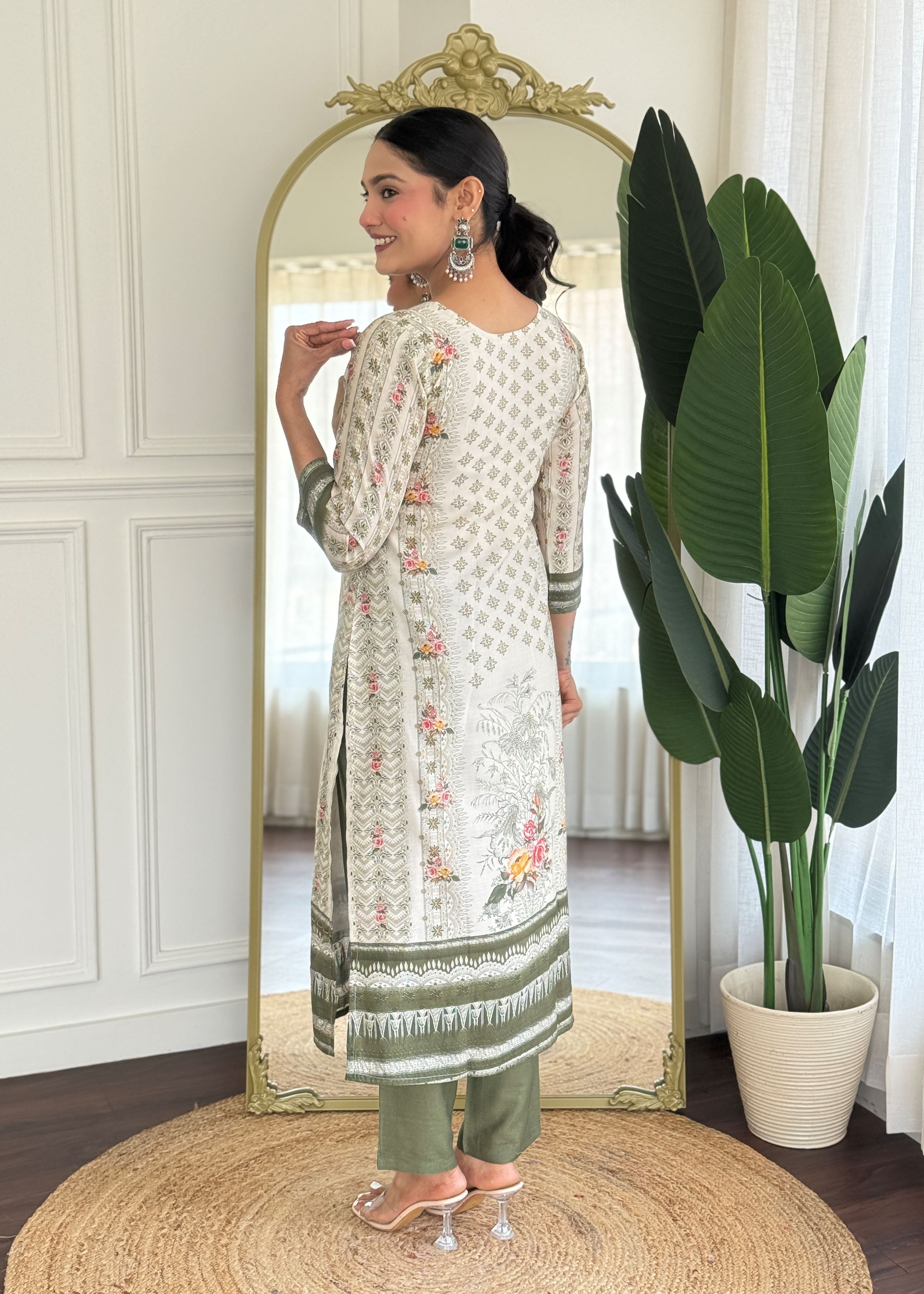 Paired with contrasting mehendi-colored viscose rayon pants, the ensemble strikes a beautiful balance between tradition and trend. The combination adds depth to the overall aesthetic while ensuring a flattering silhouette. Completing the look is a multicolor muslin dupatta—light, vibrant, and flowy—bringing movement and a refreshing burst of color to the outfit.