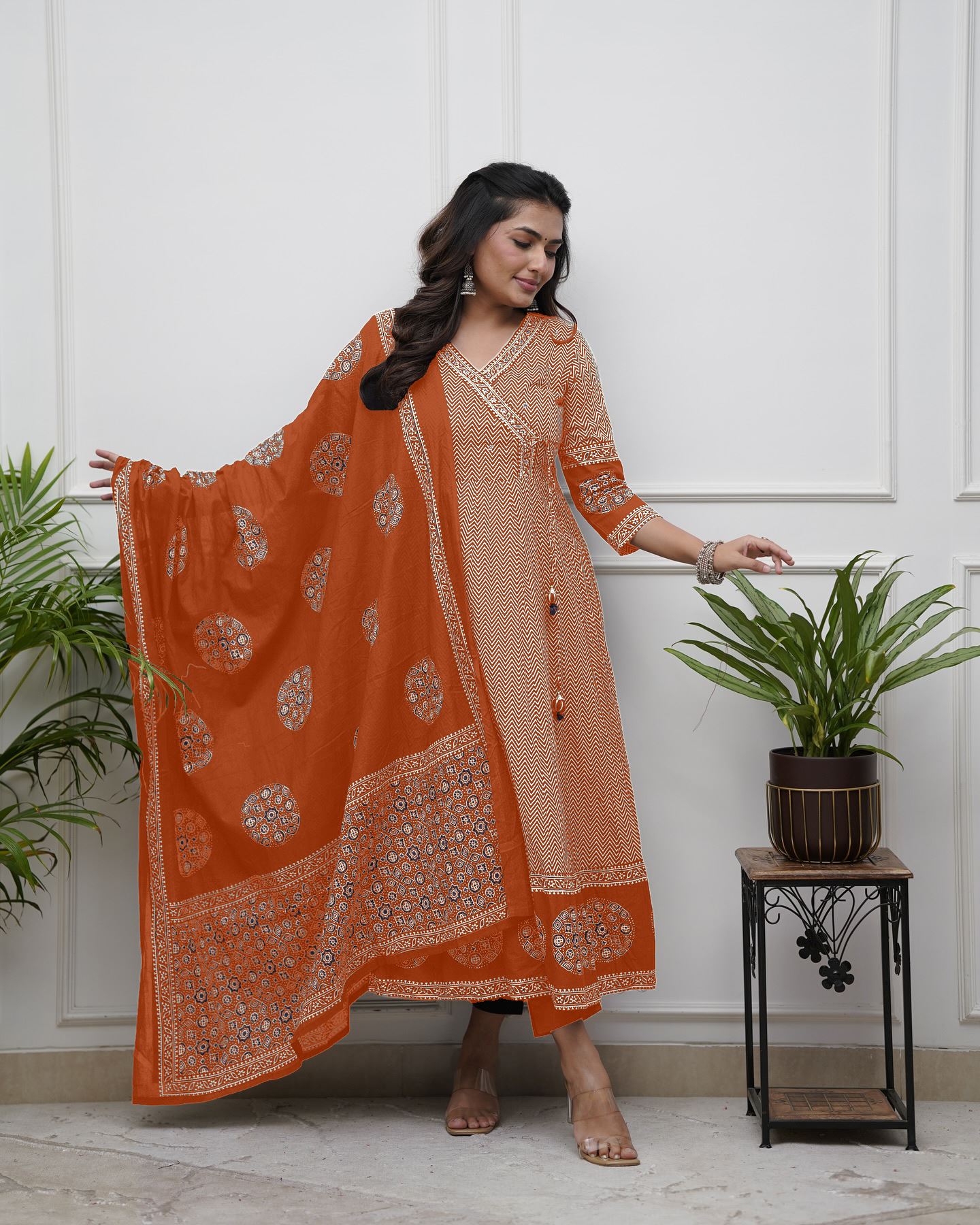 Brighten your ethnic wardrobe with the Orange Cotton Blend Kurta Pant with Print With Thread Embroidery Work from Aethnofit Fashions. Designed in a vibrant orange hue, this three-piece set brings warmth, confidence, and festive flair to your everyday and special occasion looks. Made from breathable cotton blend fabric, it ensures comfort while keeping you stylish throughout the day.