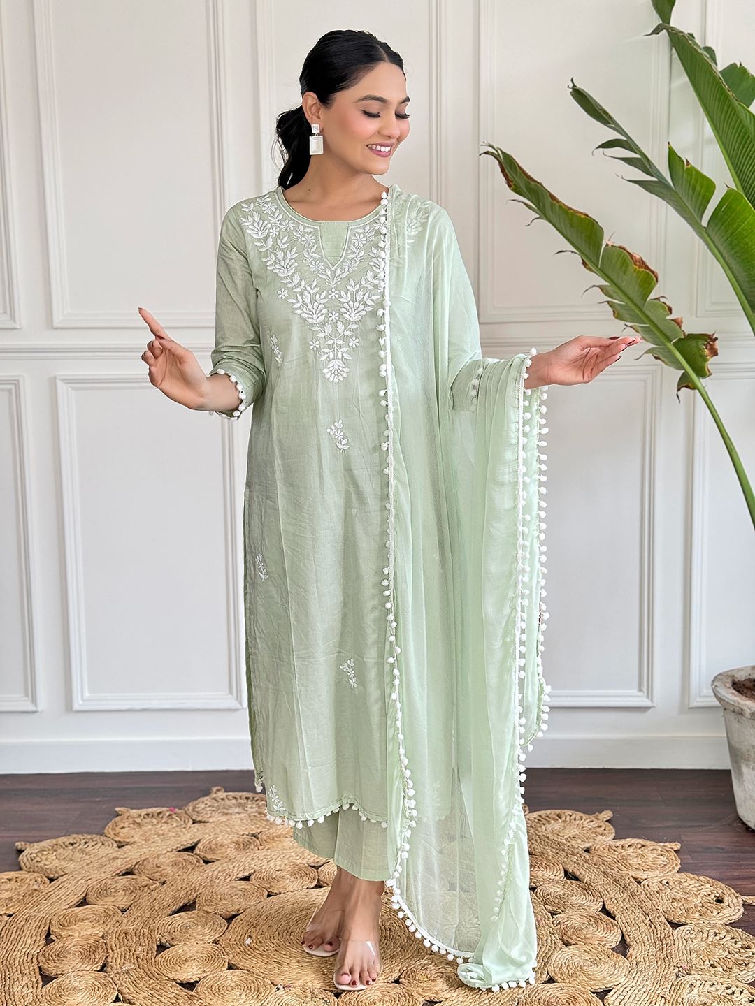 Pista Pure Cotton Elegant Kurta Pant Set With Chikankari Work