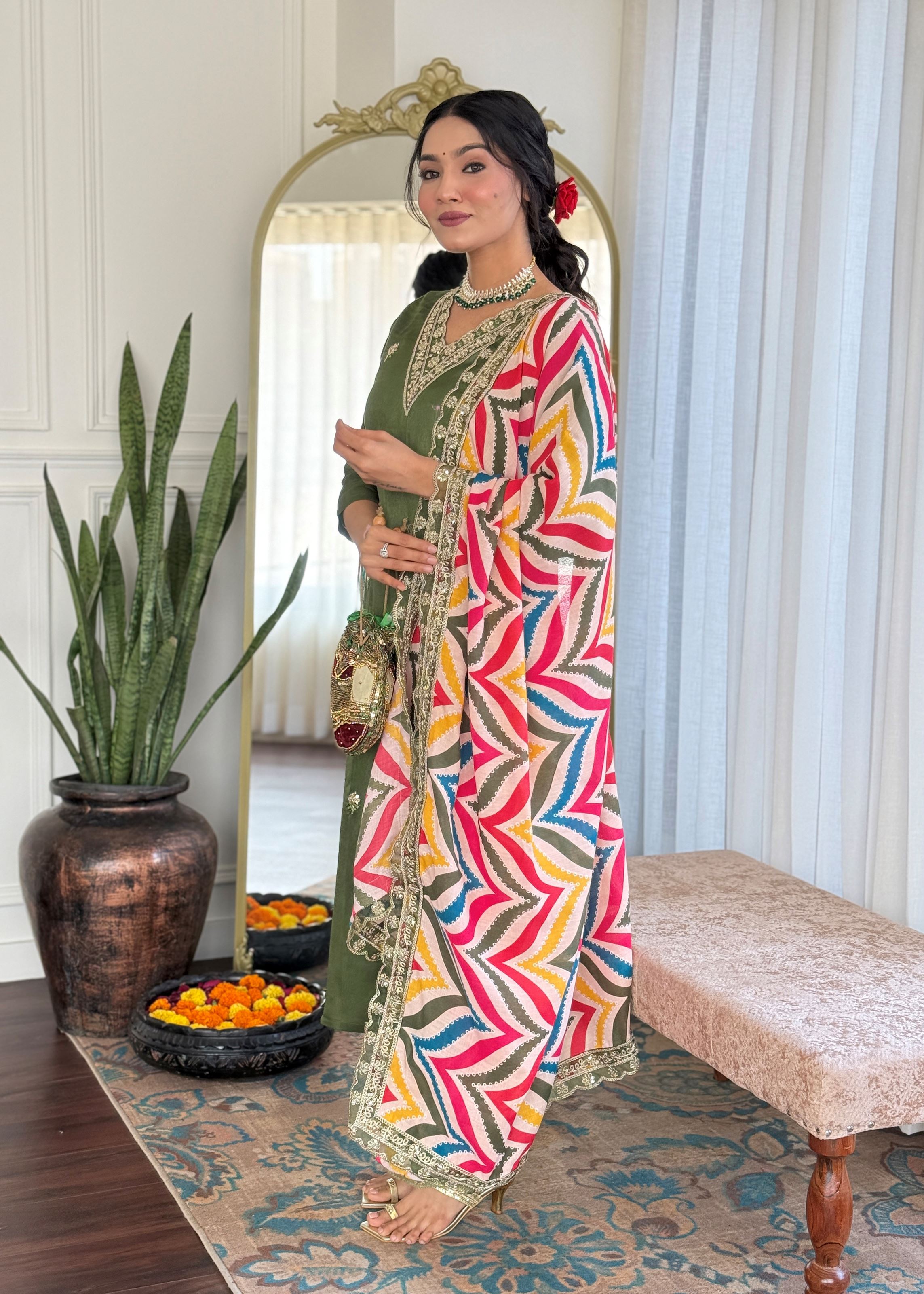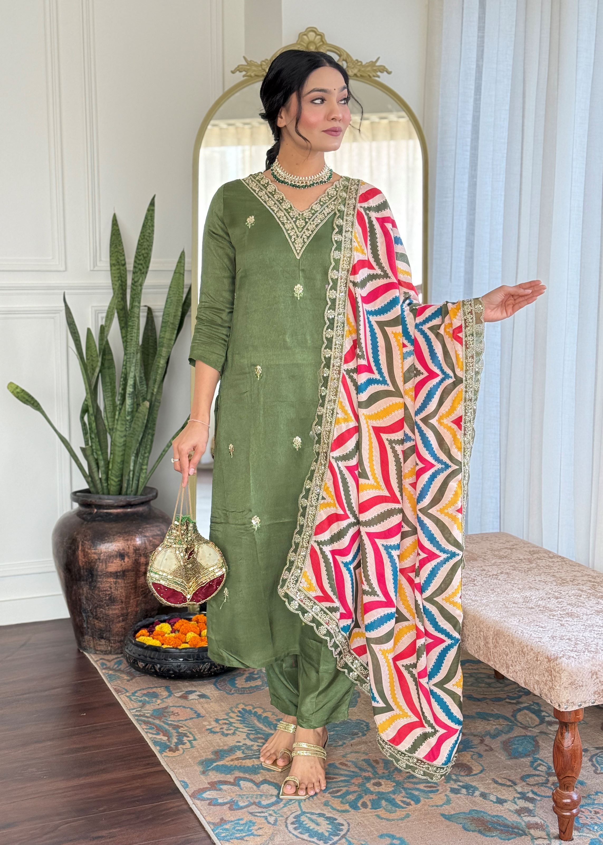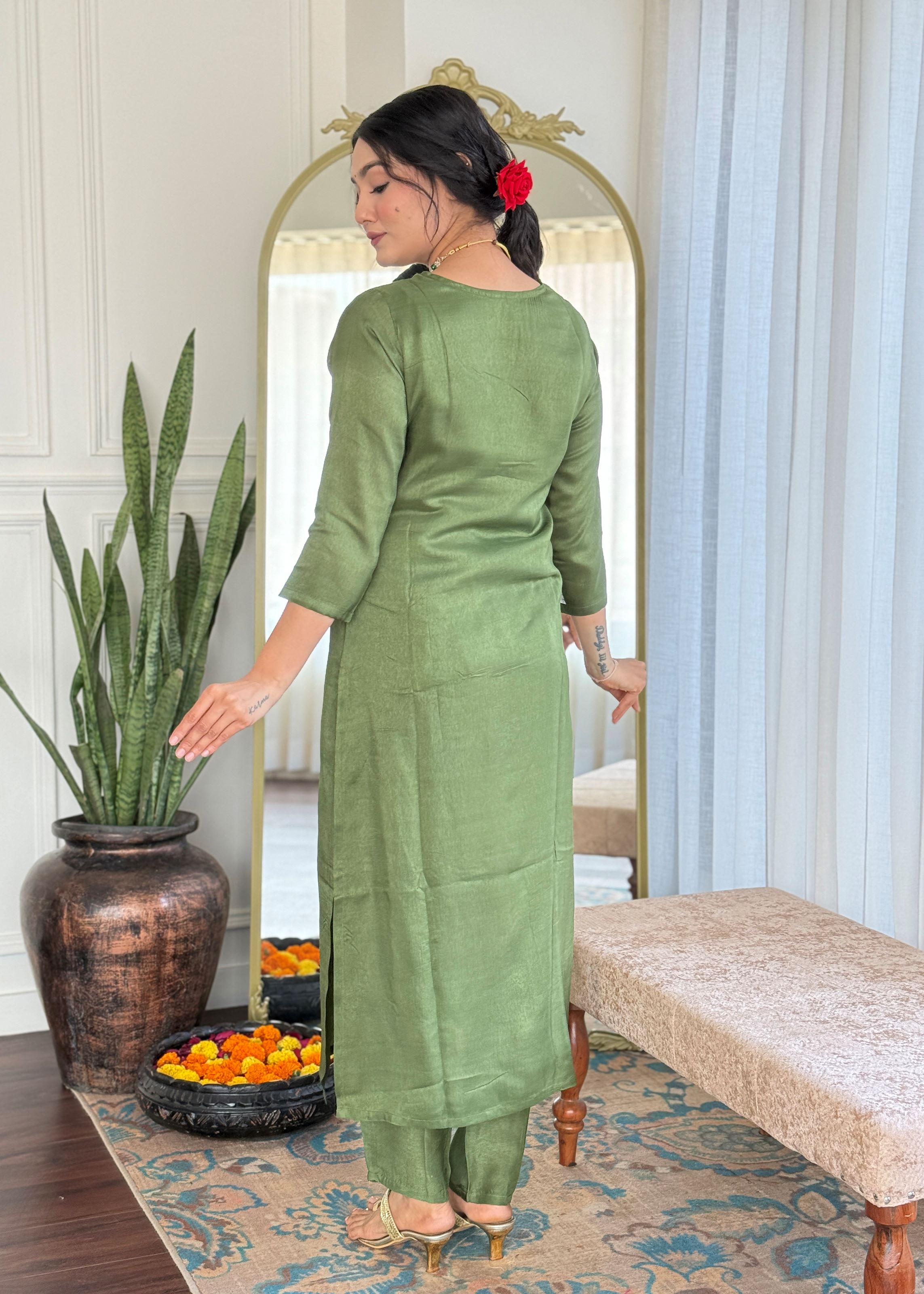 Pista Viscose Elegant Kurta Pant Set With Embroidery Work