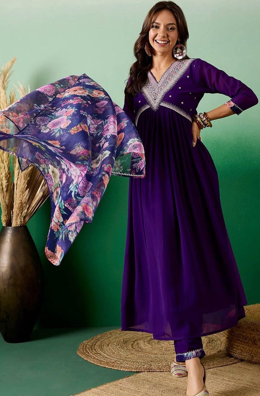 Purple Georgette Kurta Pant With Embroidery Work And Printed Dupatta