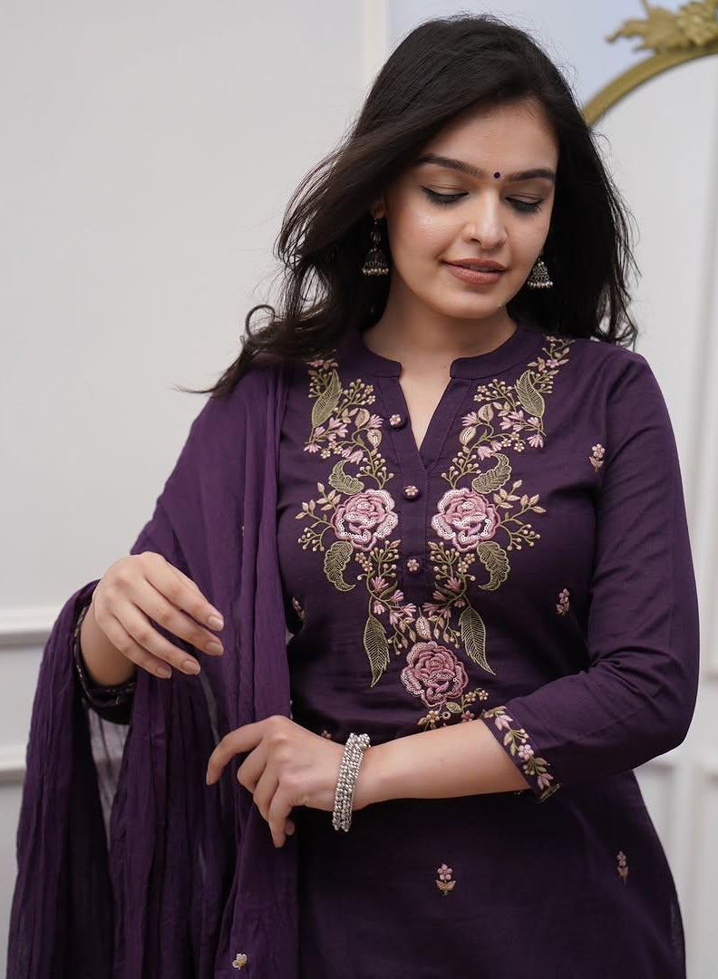 Timeless elegance meets modern comfort in this Purple Kurta Pant Set with Heavy Thread Embroidery Work from Aethnofit Fashions. Made with soft, breathable Rayon fabric, the kurta and pant set deliver day-long comfort while exuding regal charm. The highlight of this ensemble is its intricate heavy thread embroidery, artistically woven across the kurta’s neckline, yoke, and sleeves. The rich purple colour adds depth and sophistication, making it a perfect pick for festive gatherings, semi-formal events, or traditional celebrations.
