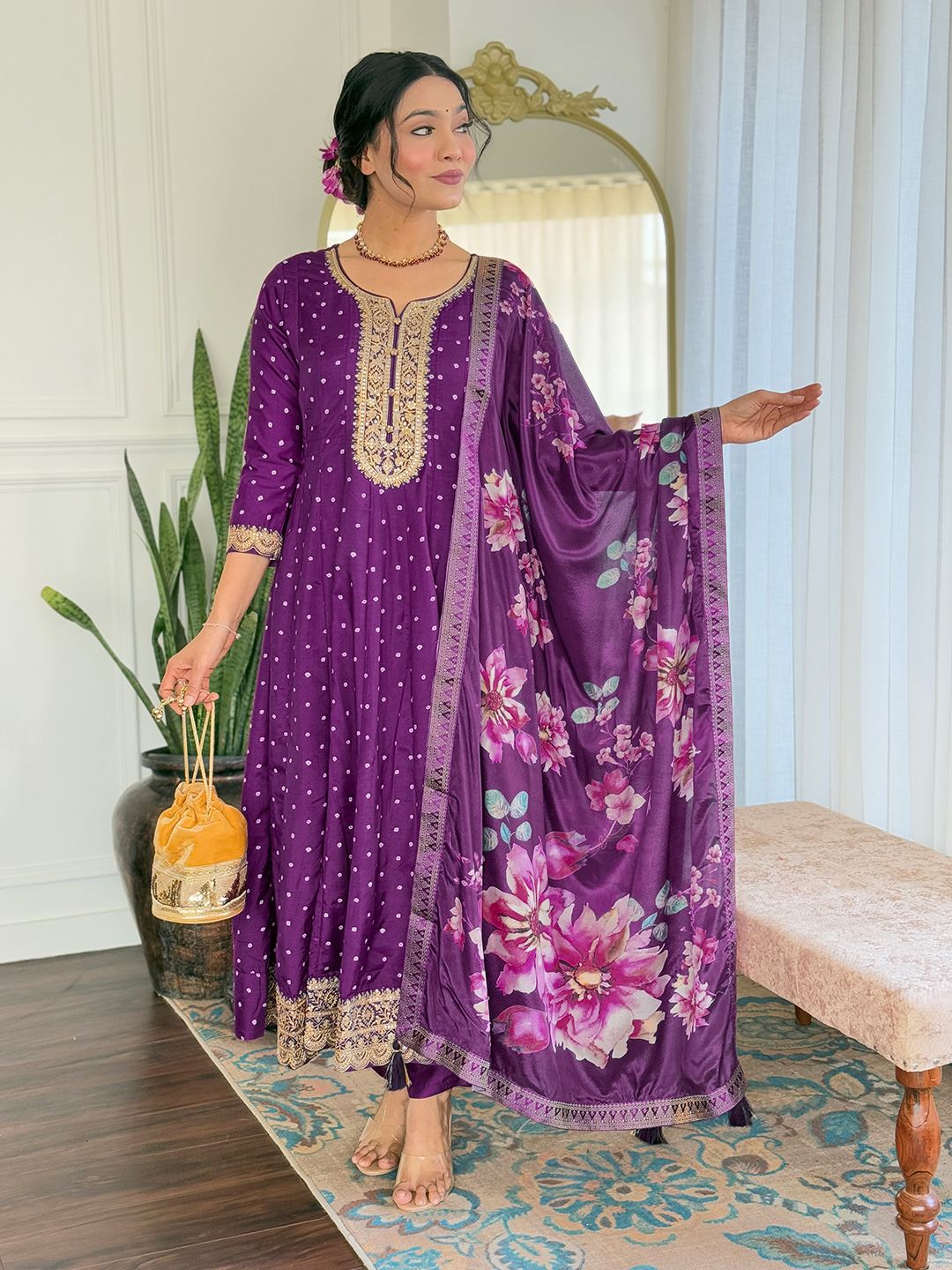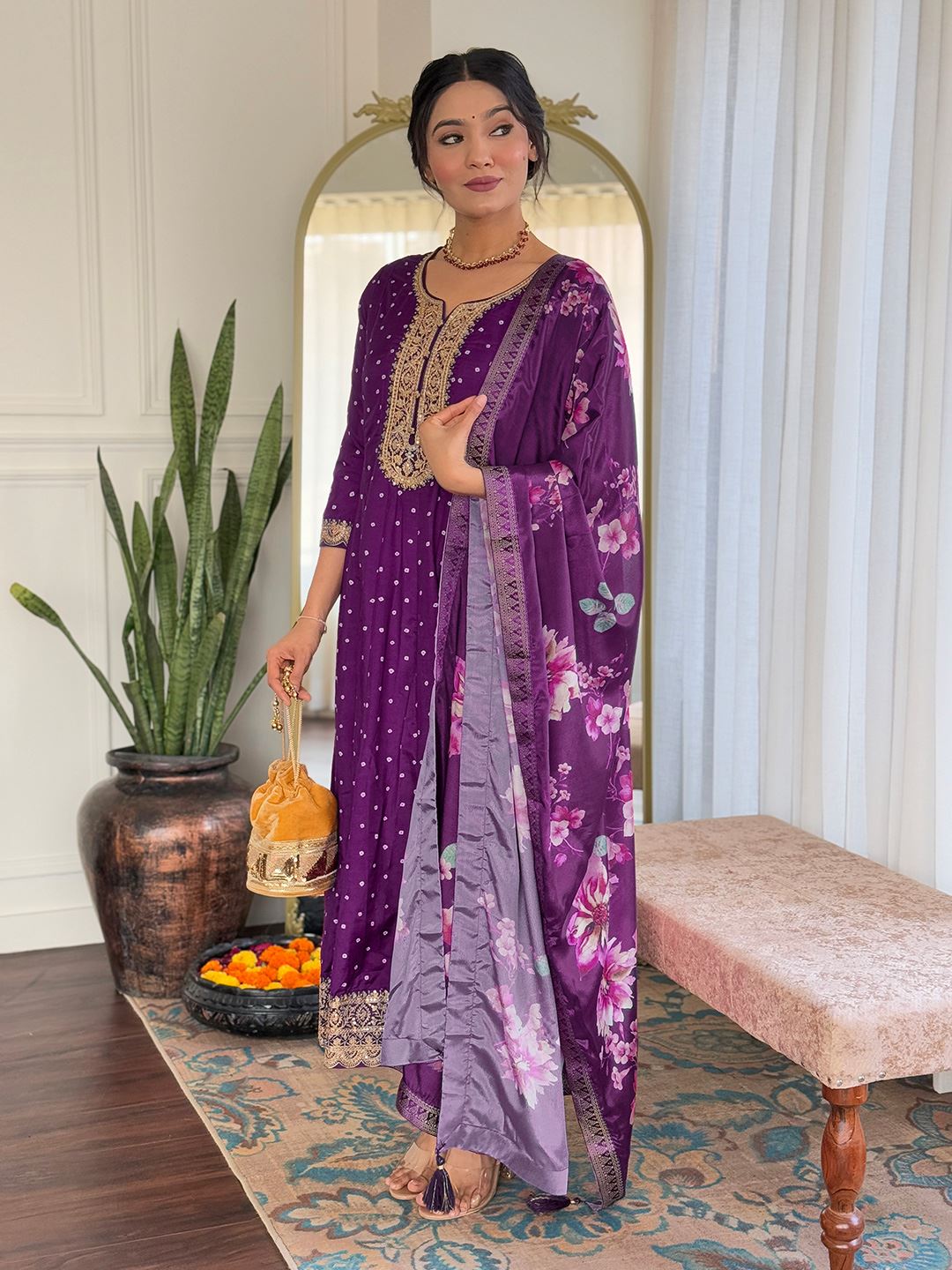 What elevates this ensemble further is the luxurious French crepe dupatta in matching purple, adding a lightweight yet graceful layer to your look. Its smooth texture and fluid fall enhance the richness of the outfit, making it ideal for both day and night occasions.