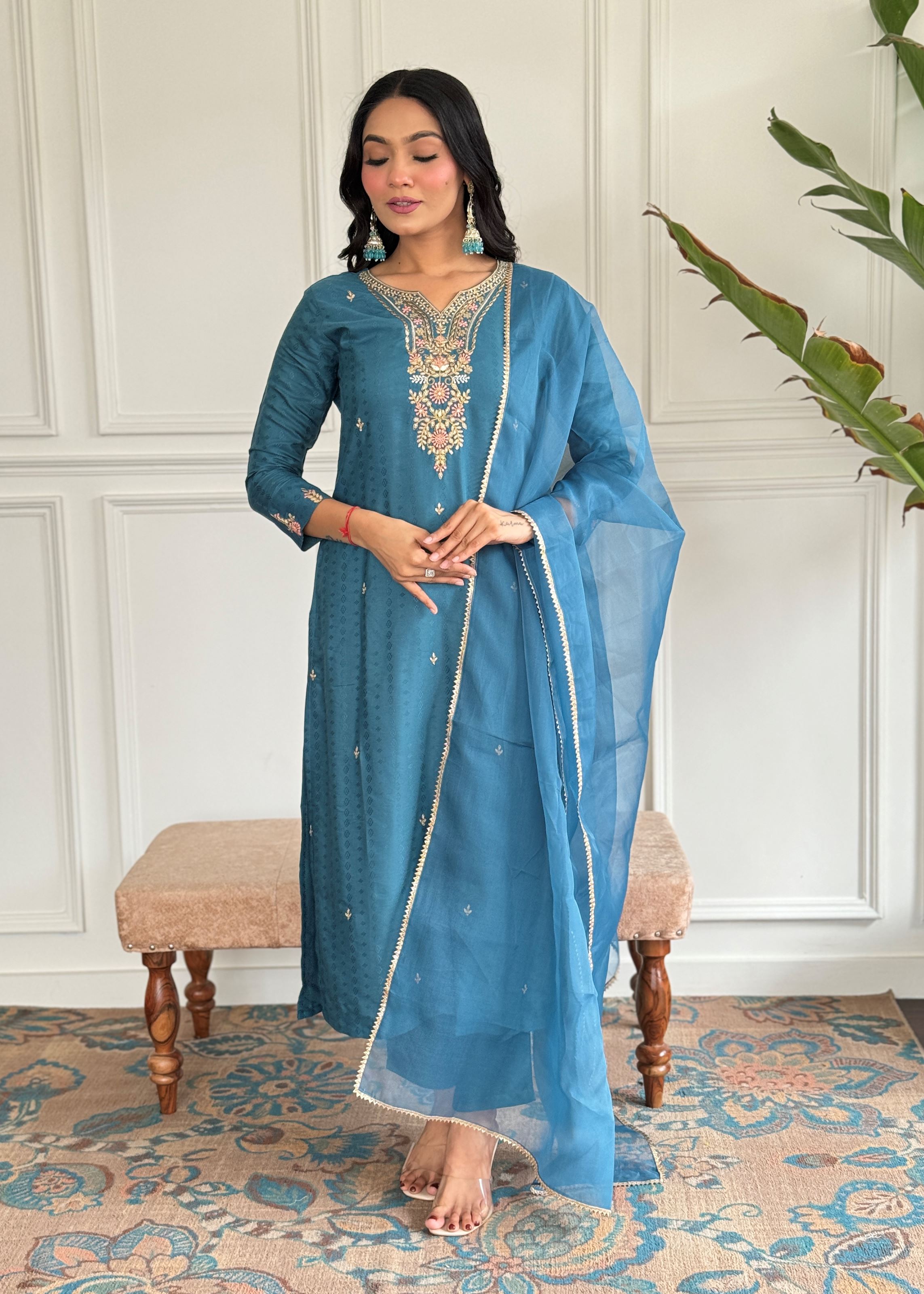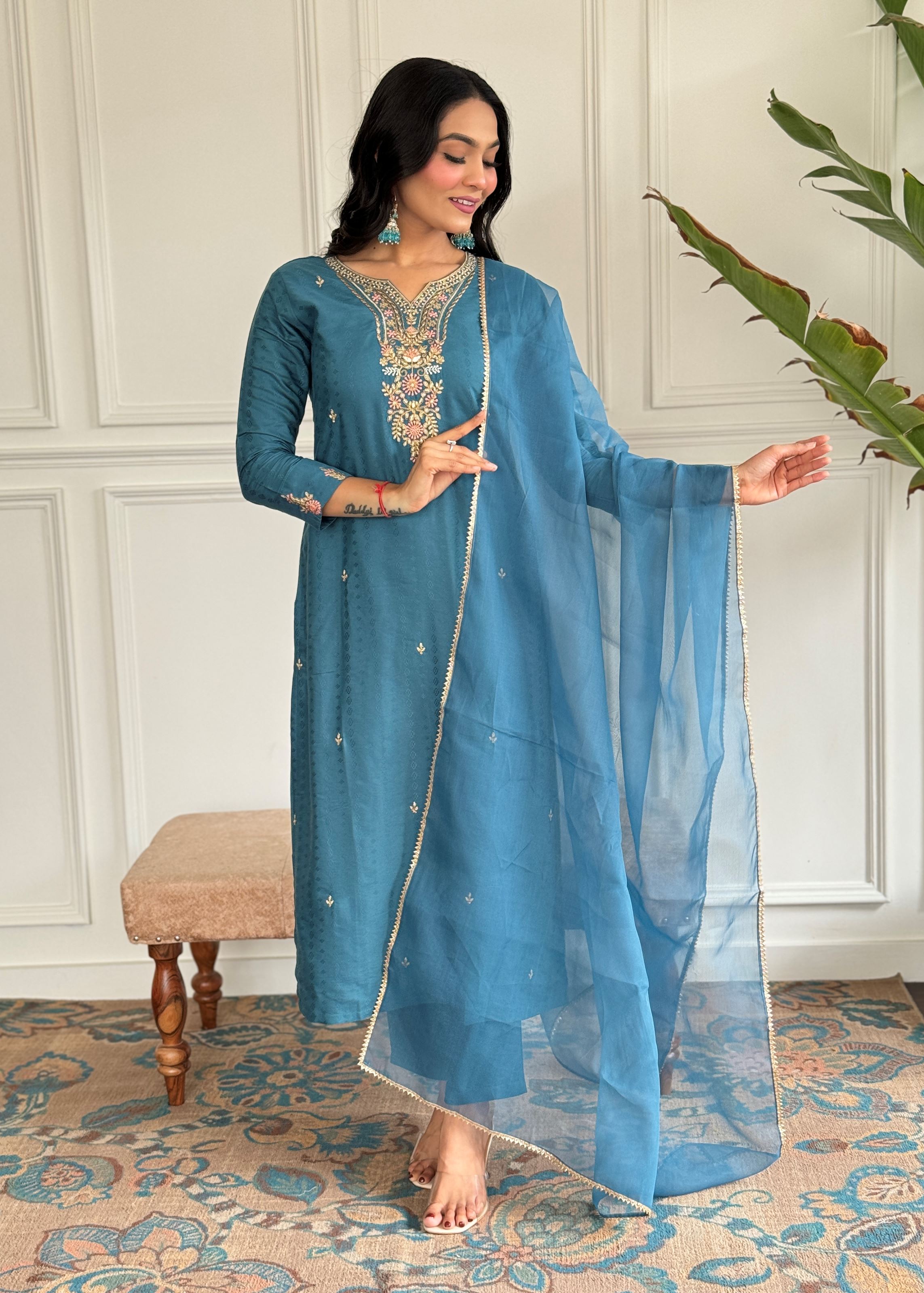 Paired with matching viscose blend pants, the ensemble ensures fluid movement and comfort, while maintaining a sharp and graceful profile. The look is completed with a breezy Organza dupatta in a coordinated Rama shade, which adds a soft layer of charm and sophistication.